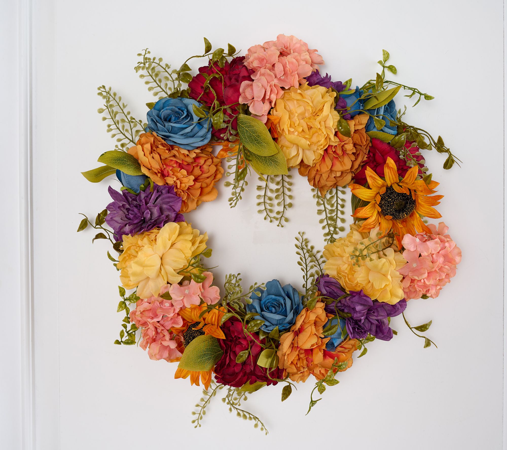 Liven up your living space with harvest hues and lush lifelike florals. This welcoming wreath makes an impressive sight season after season with its soft-to-the-touch fabric flowers and foliage that never wilt or need watering. From the Valerie Parr Hill Collection.