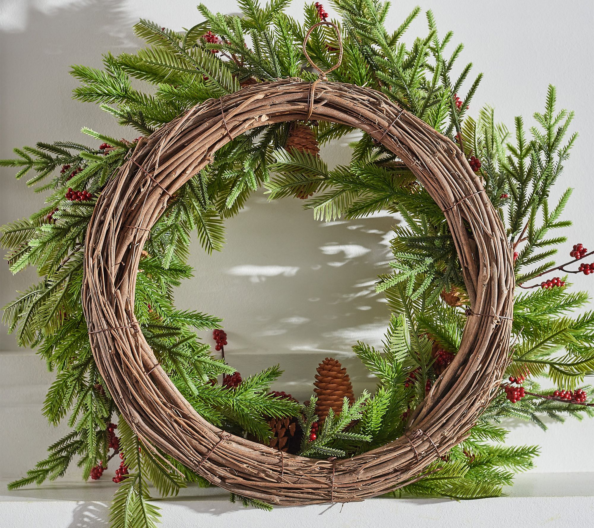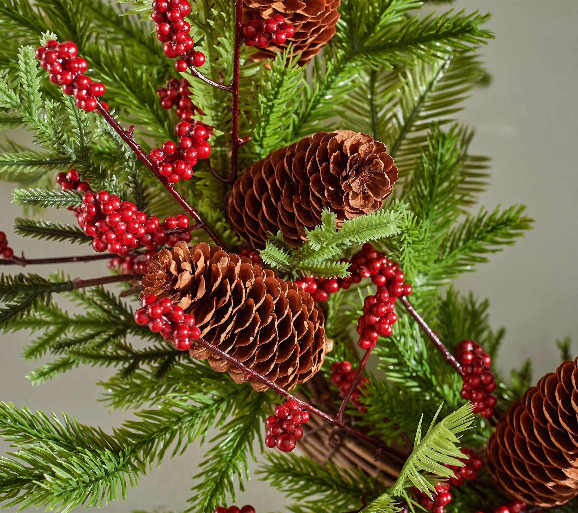 • Lifelike evergreen foliage accented with realistic pinecones and berries