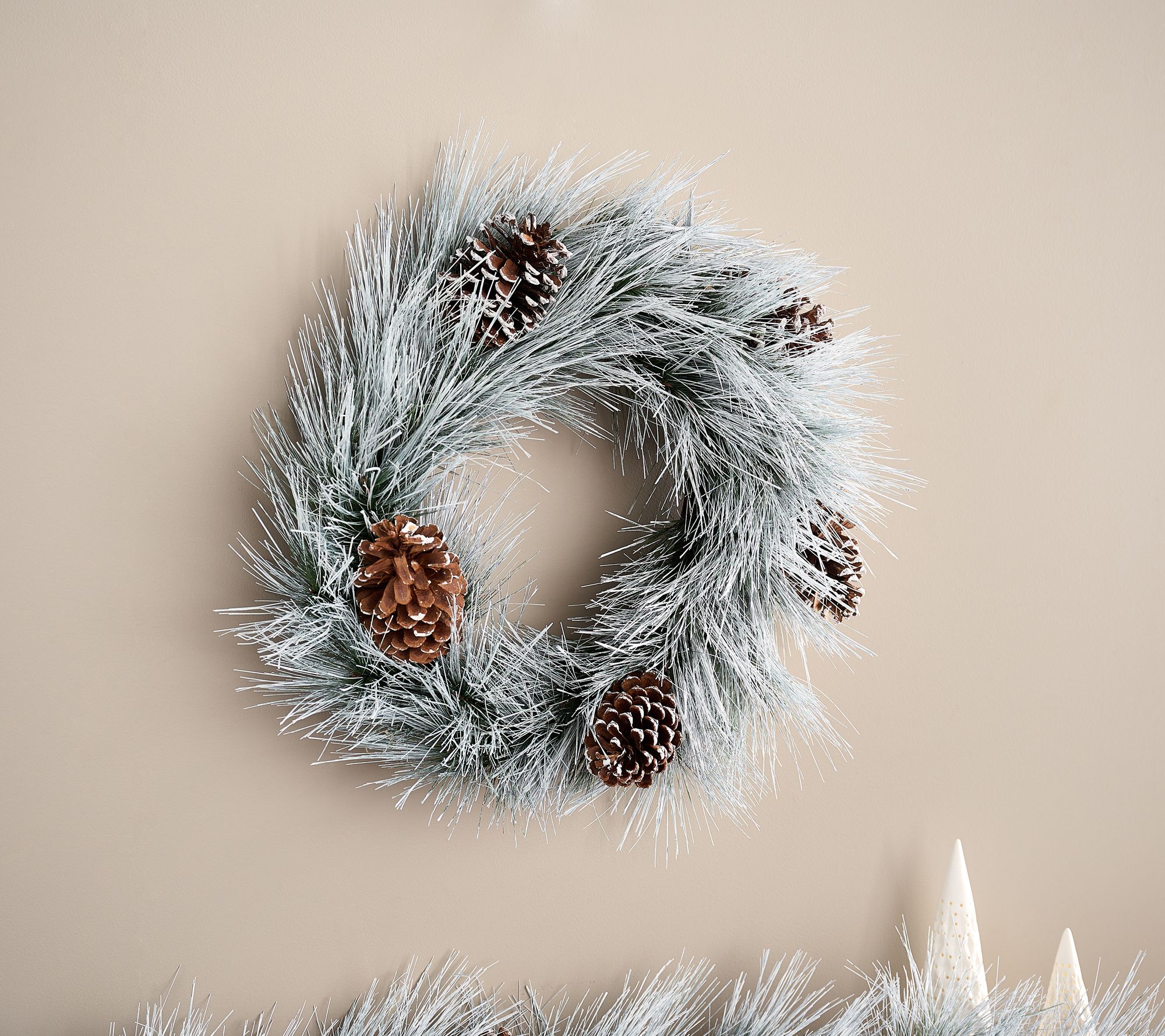 • Lifelike long needle pine wreath with snow-dusted pinecones
