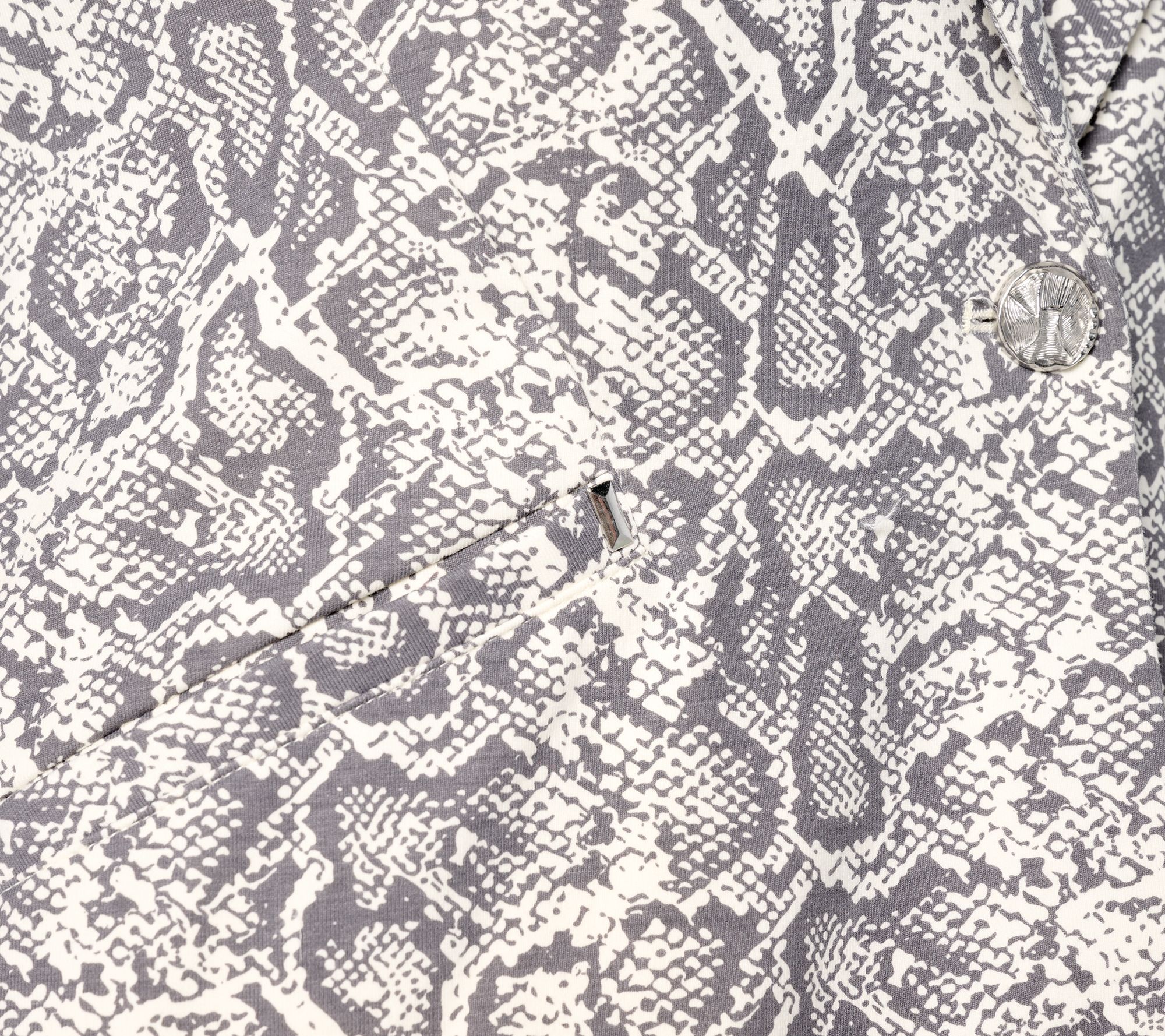 • Features: printed design, stand collar, lapel, lined interior, shoulder pads between body and lining, pleat details, front seam, center-back seam and vent