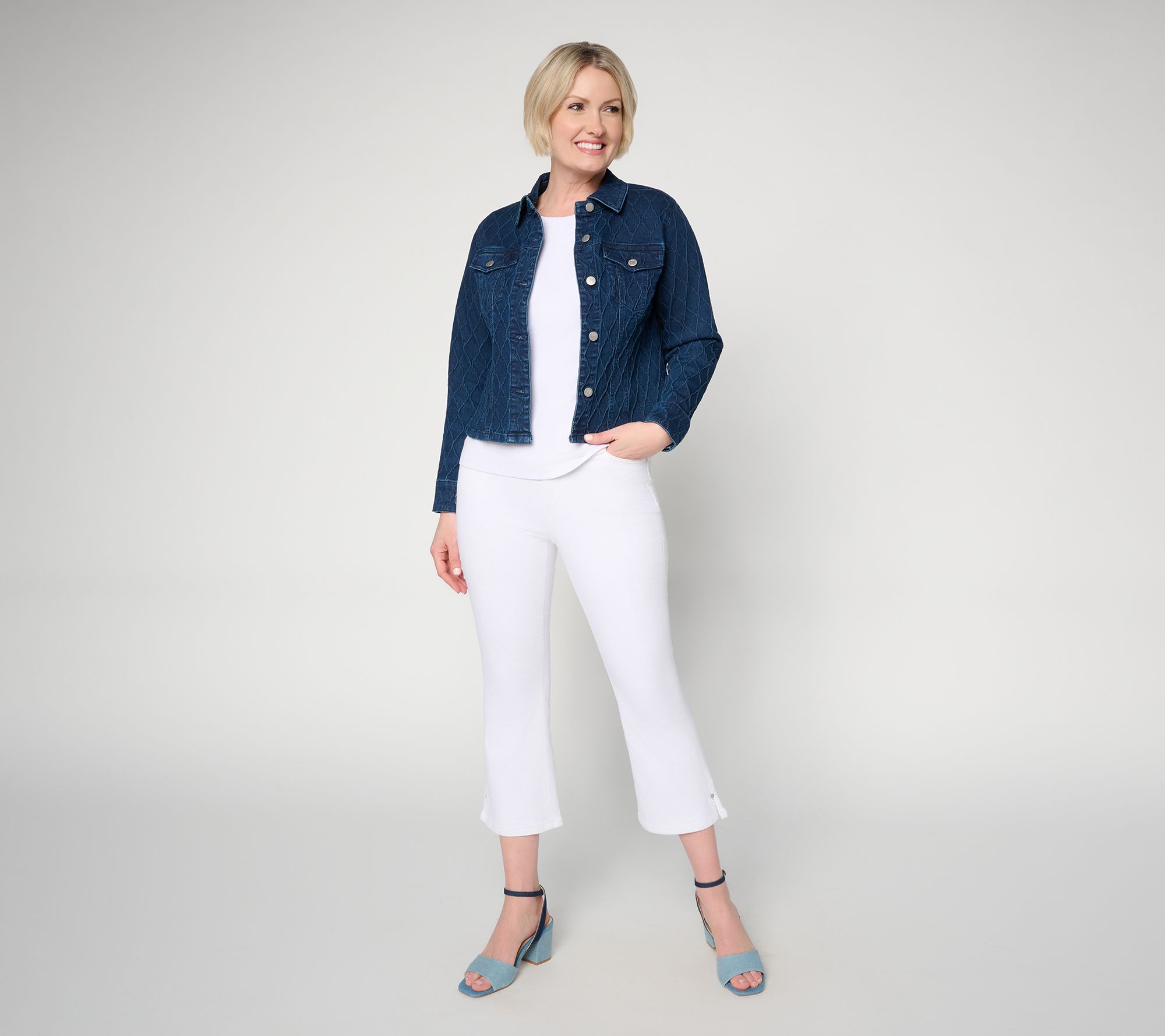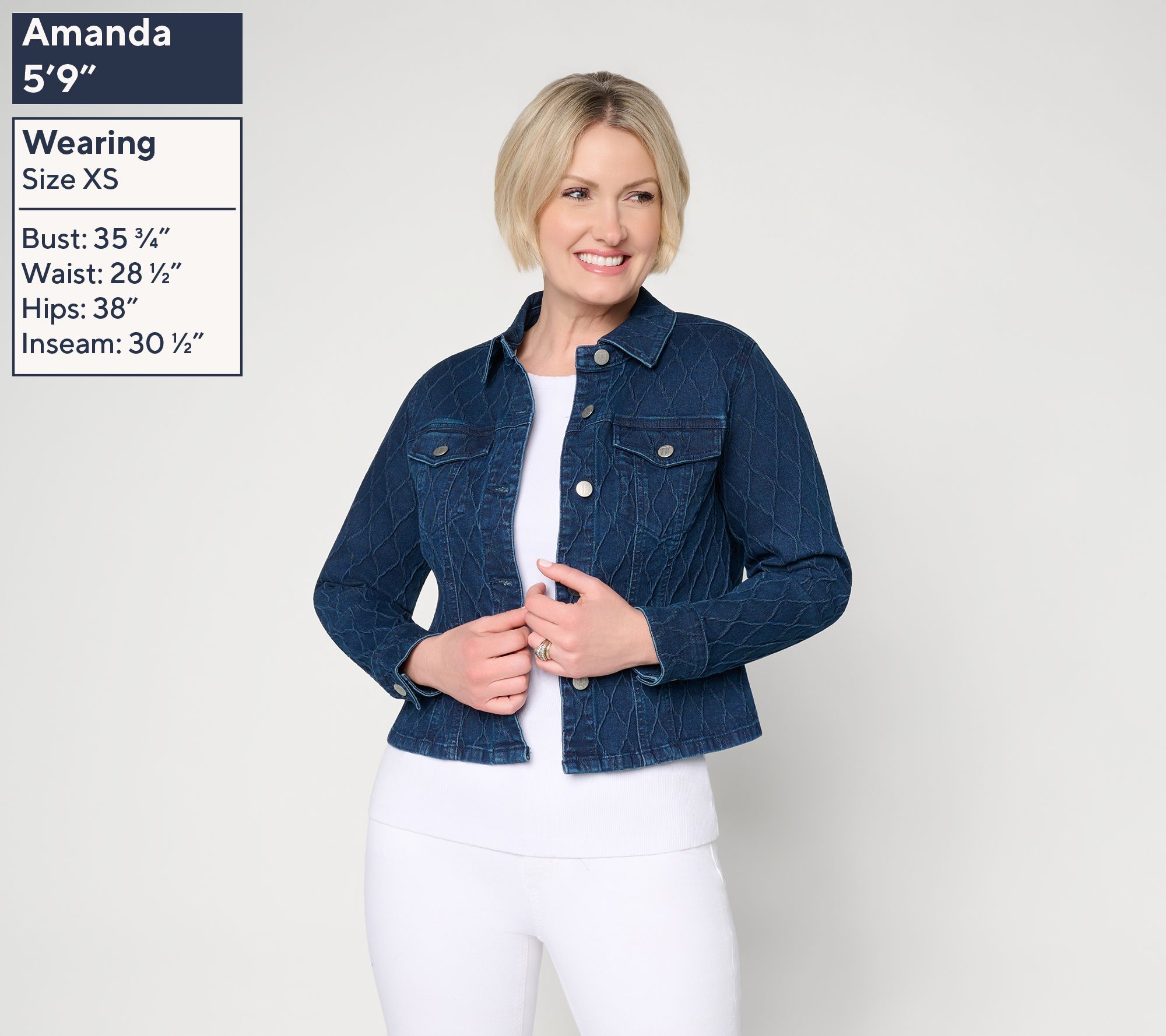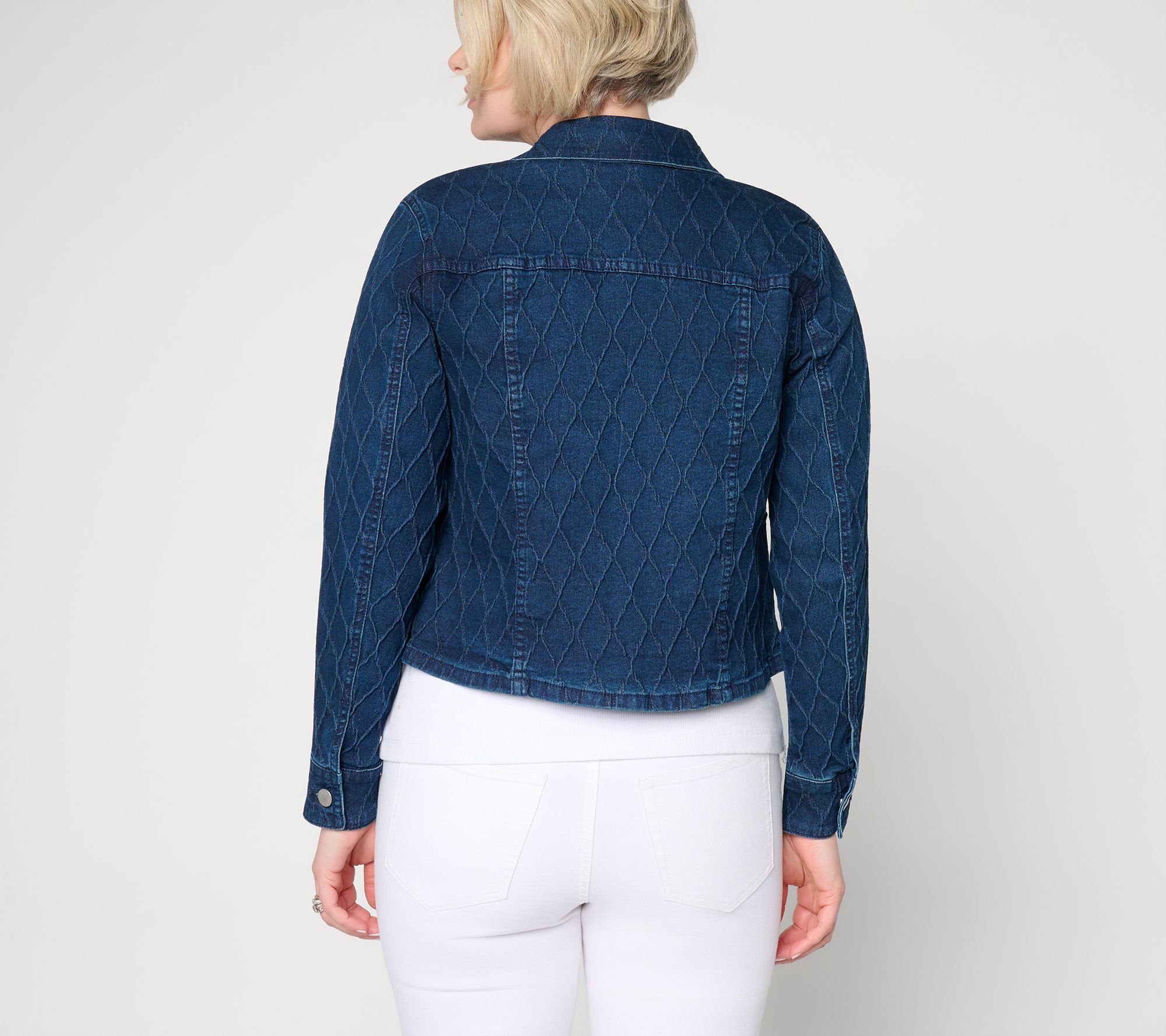 Fresh texture and contoured comfort come together in this denim jacket, making it the ultimate grab-and-go layer for mornings at the market or cool evenings out with friends. The jacquard quilting not only adds bold visual interest, but offers just the right fashion moment over existing closet favorites. From Women with Control®.