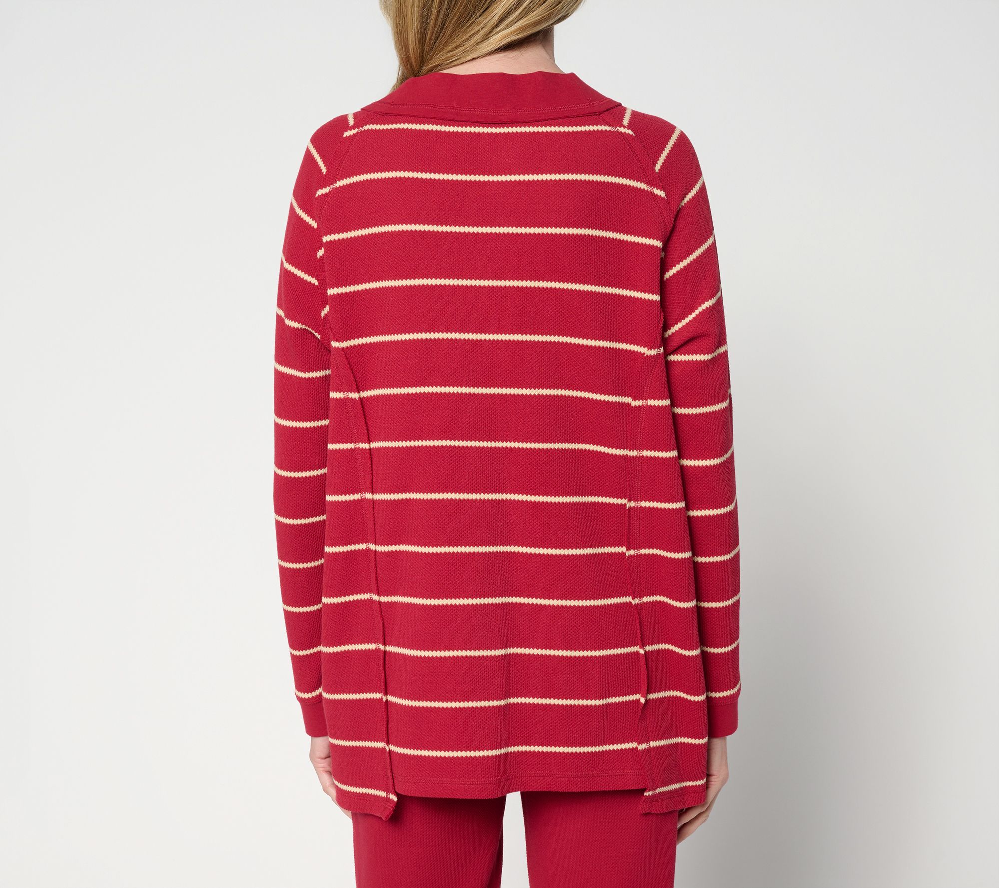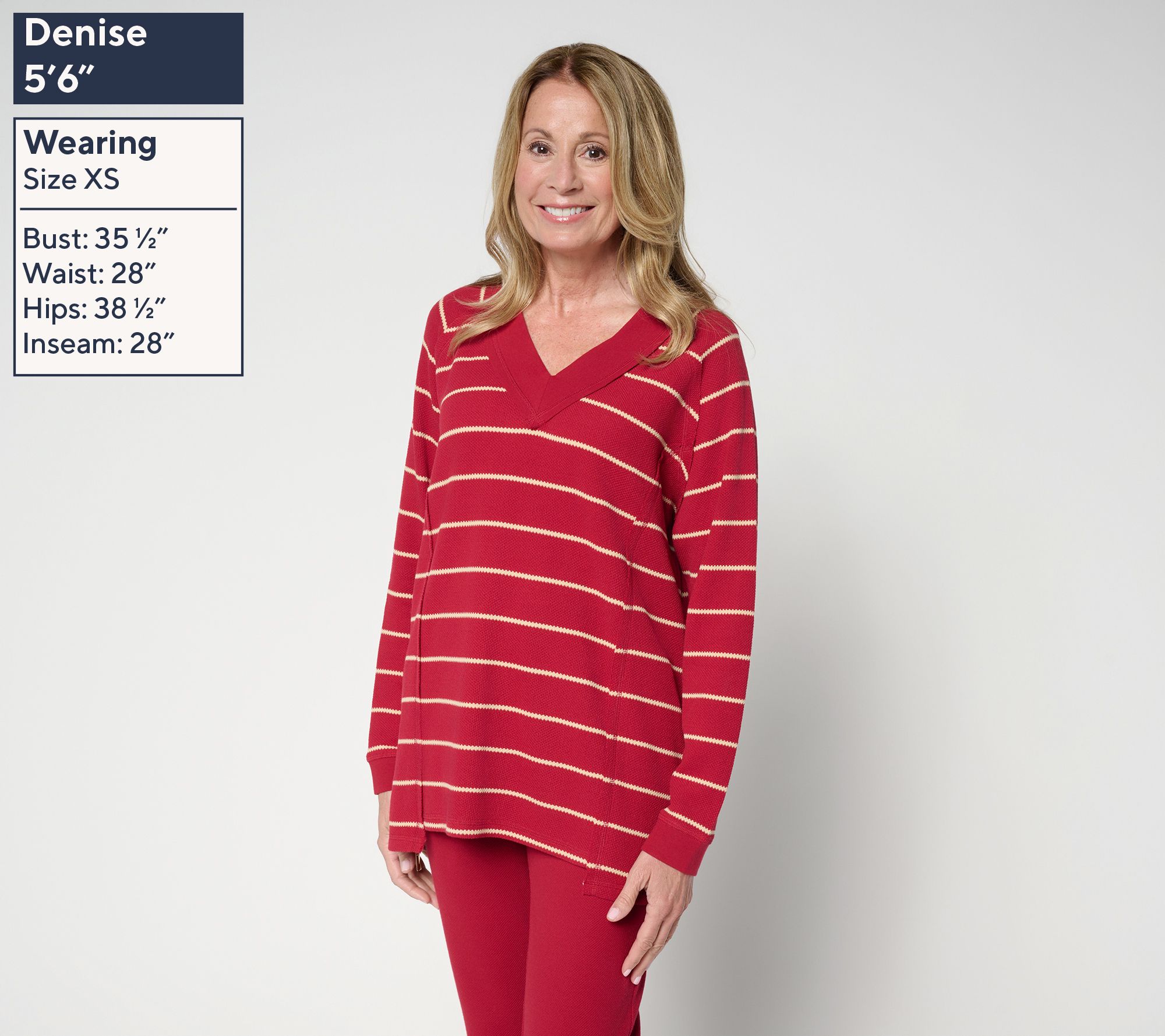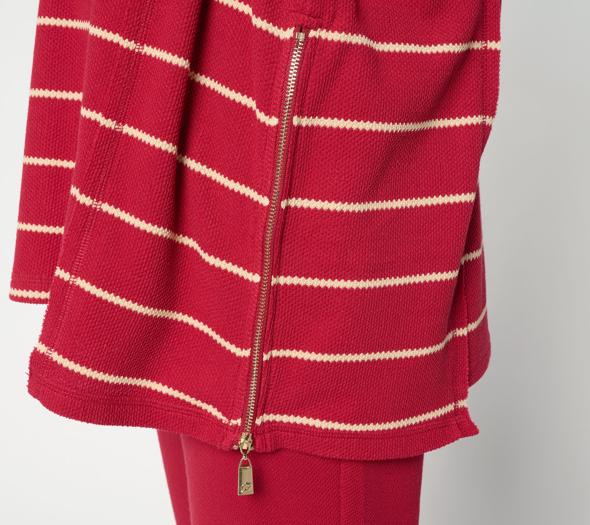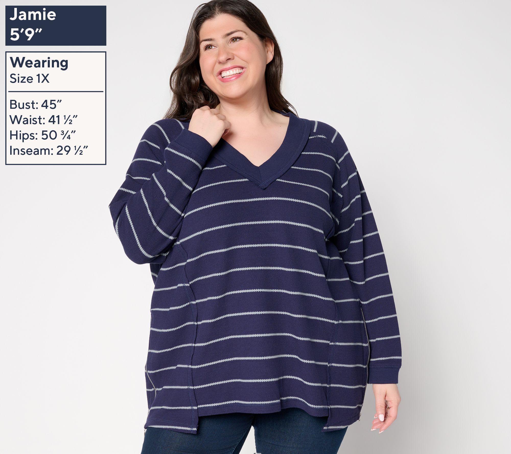 The moment you slip into this striped jacquard top with a generous length, cares just seem to ease up a little. Sink into the soft sumptuous knit, unzip the side seams, and pair with your favorite lived-in bottoms -- it's going to be a comfy day (or two). From Women with Control®.