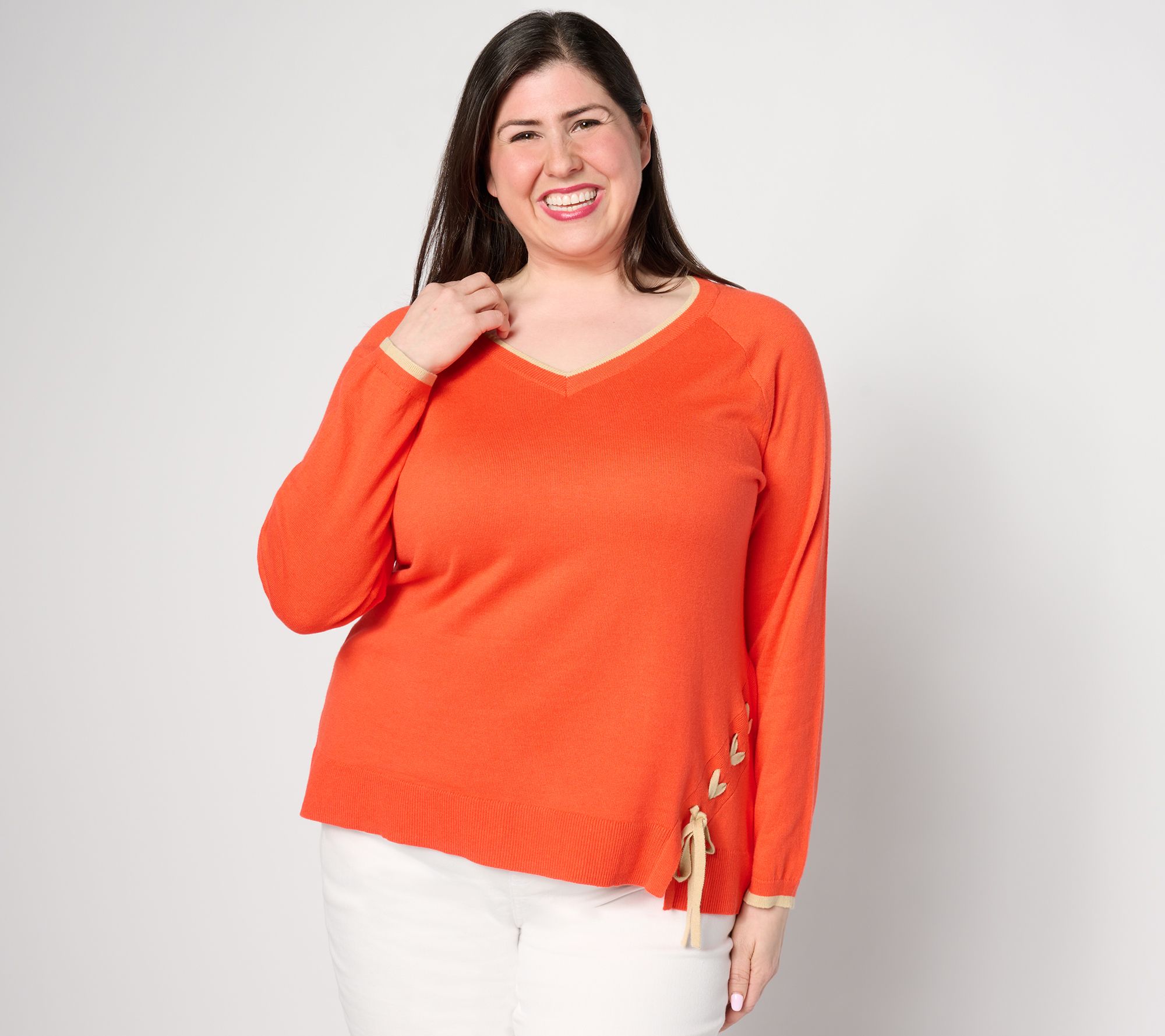 Your playful side is showing. A contrast lace-up detail gives this otherwise-classic sweater some cheeky personality. From Women with Control®.