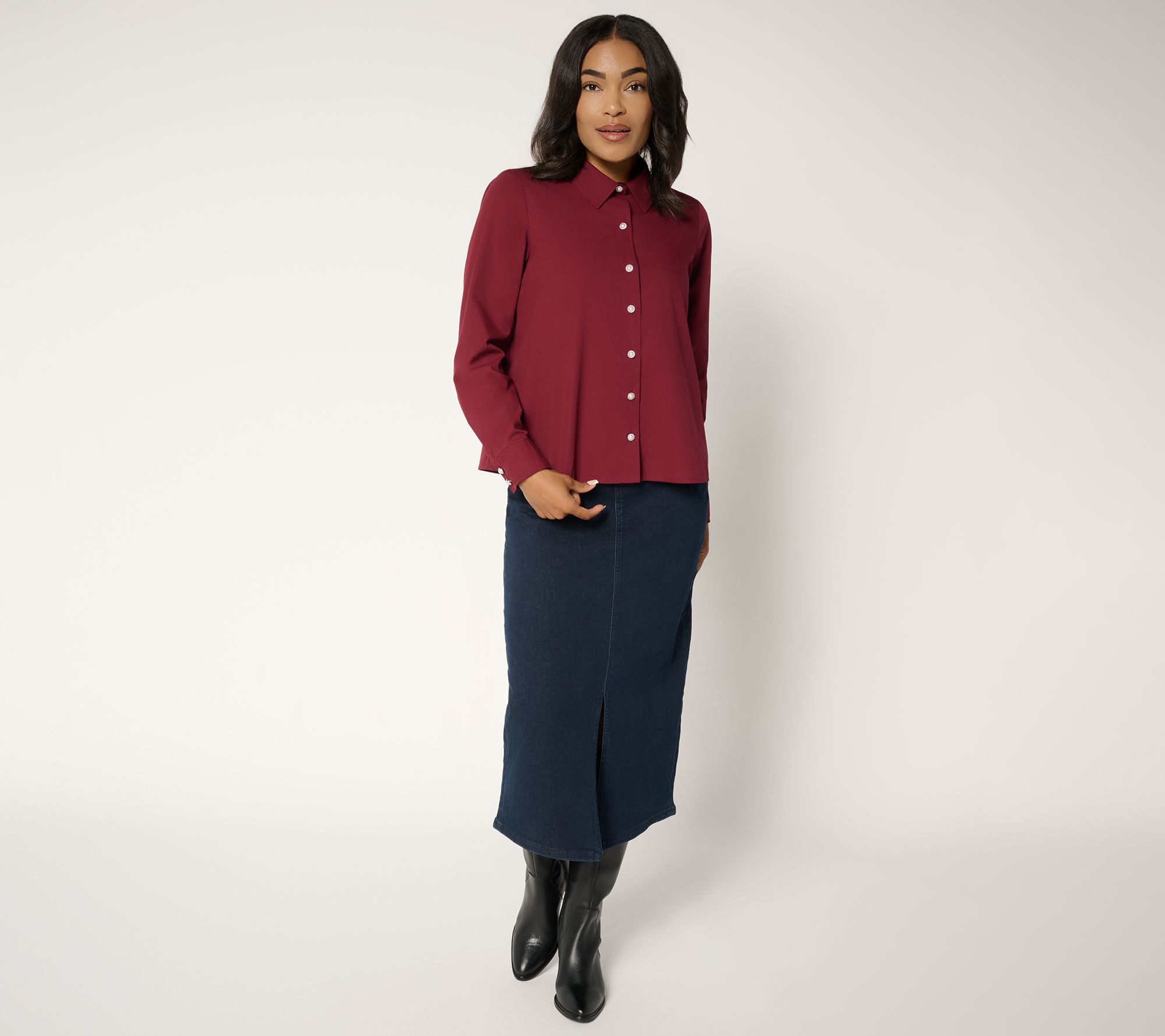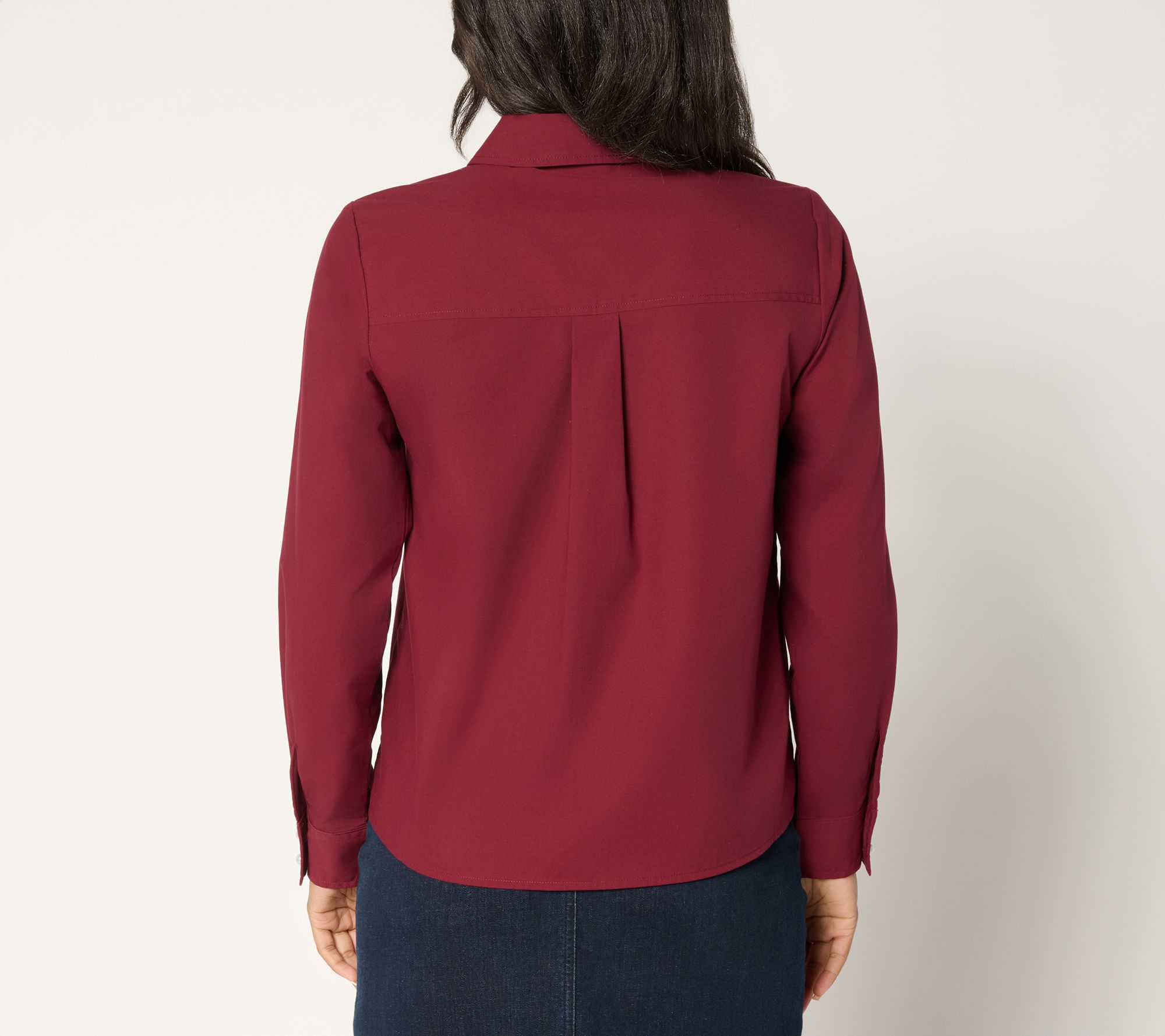 You're in charge! Classic meets modern in this boss lady button-down blouse, easily styled for work or weekend plans. The crisp woven poplin, pretty pearl-like buttons, and tailored cuffs offer a polished accent, while a back box pleat delivers extra comfort for your all-day wear. From Women with Control®.