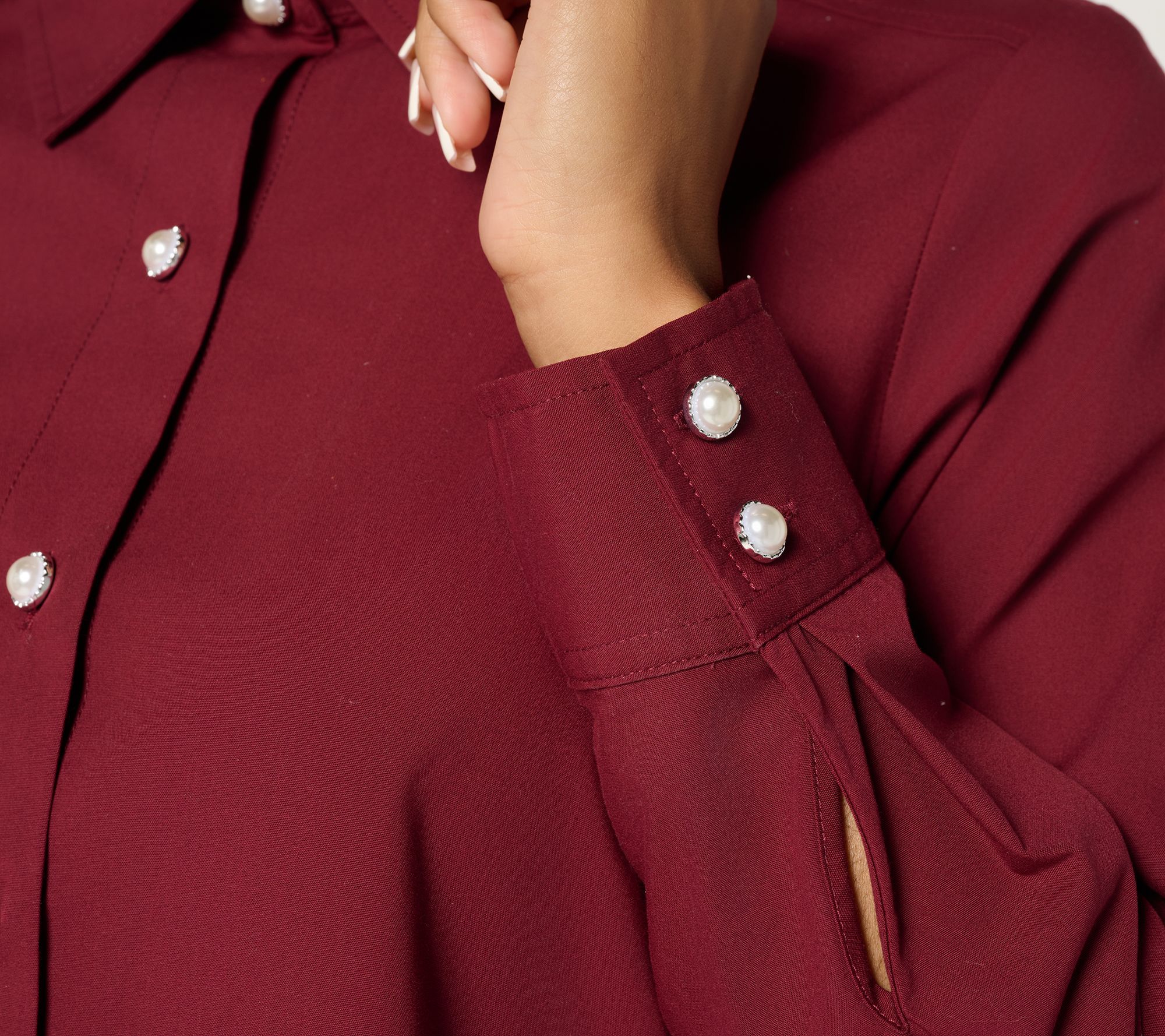 • Features: pearl-like button-front closure, back box pleat, long sleeves with button cuff and vent