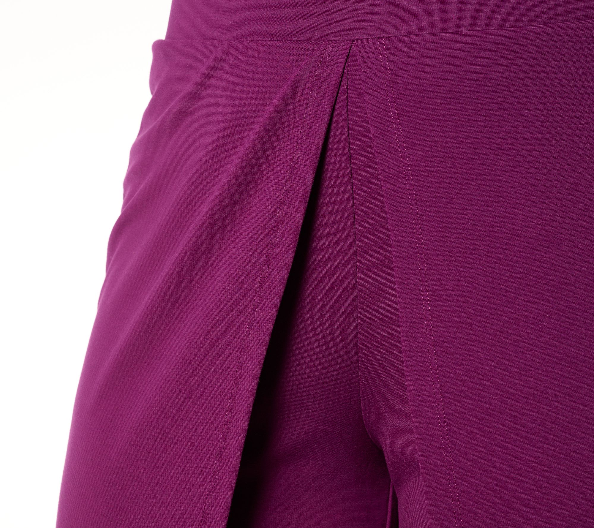 • Features: attached front panel at flat waistband, encased elastic back, pleat details, front slits