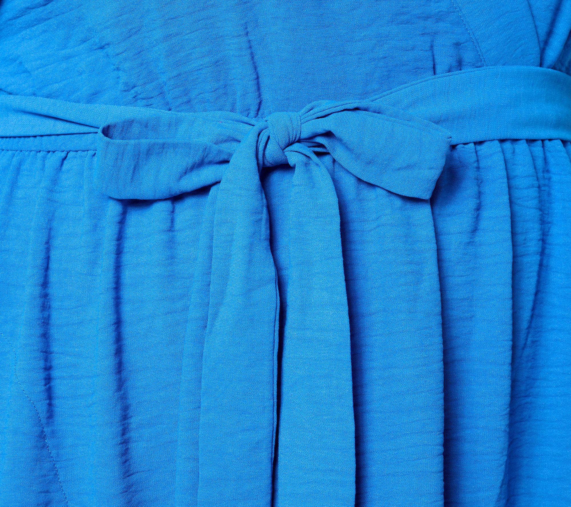 • Features: tacked faux wrap front, tunneled elastic at waist, removable self-tie belt, pockets