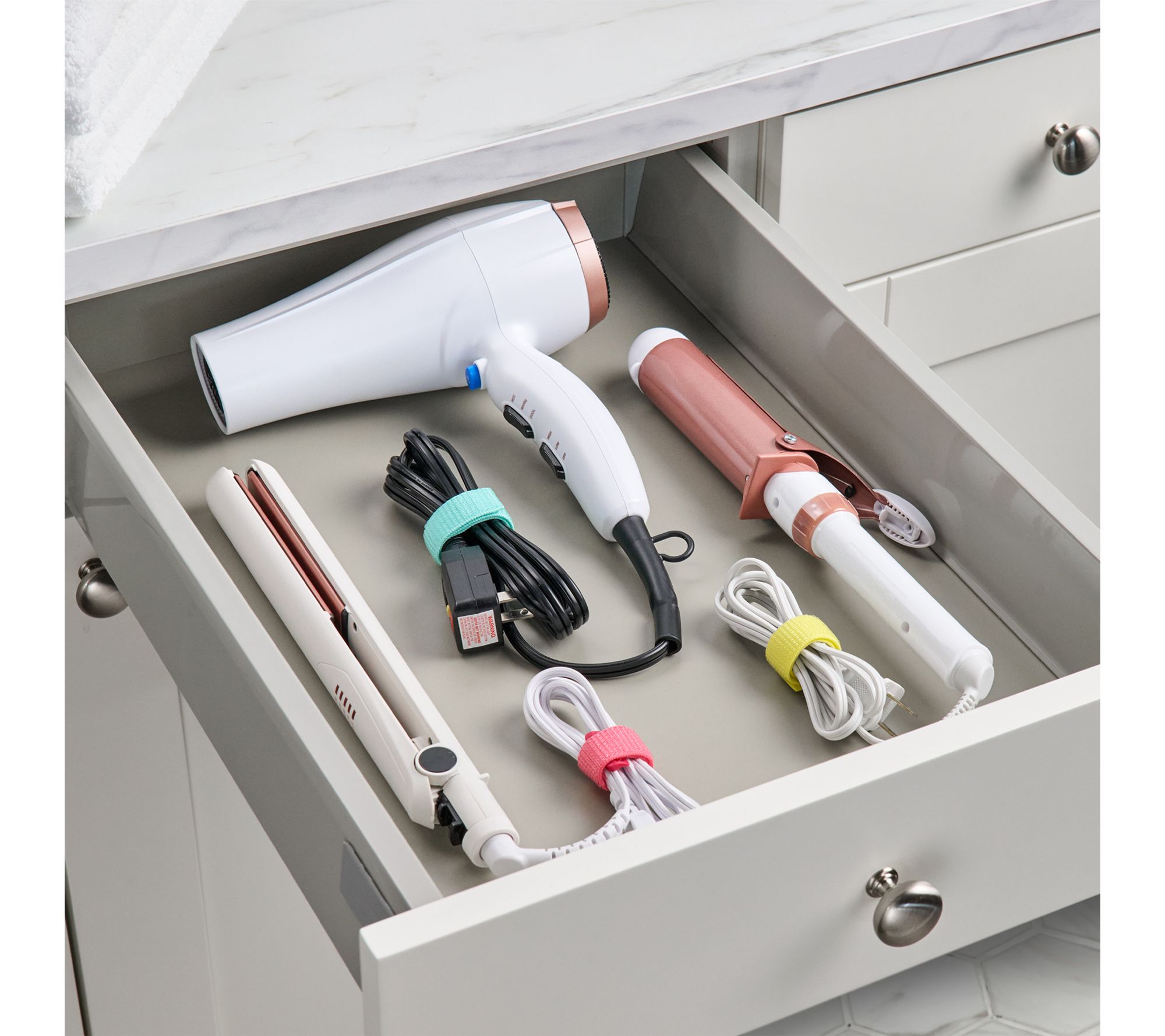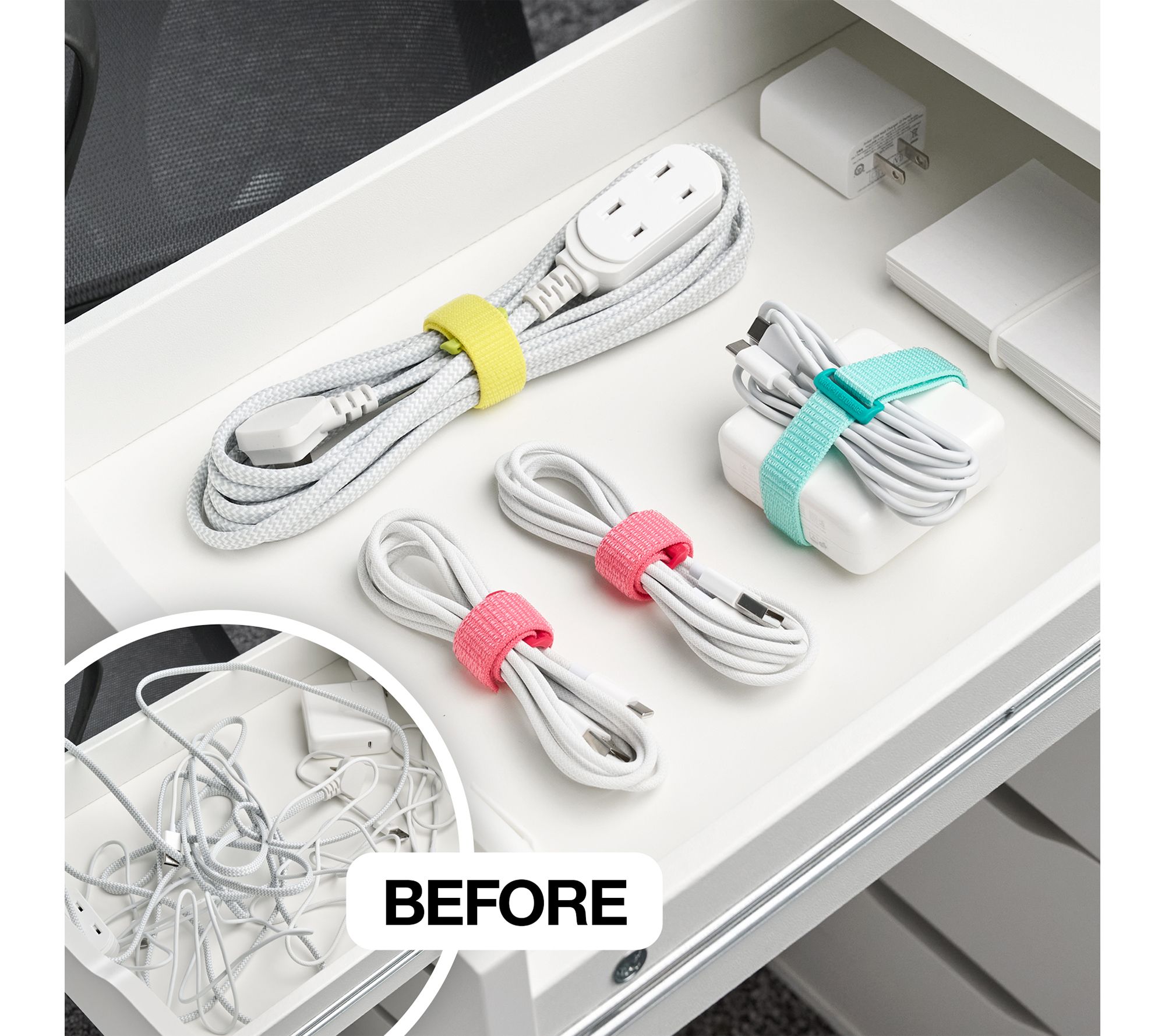 • Stores and organizes cords, cables, and wires