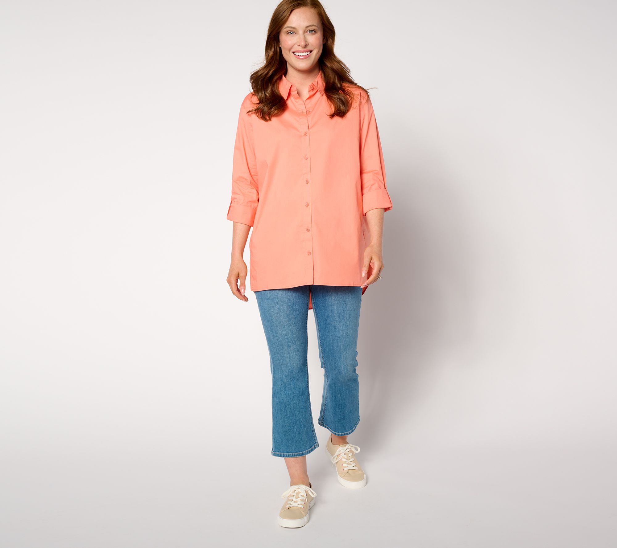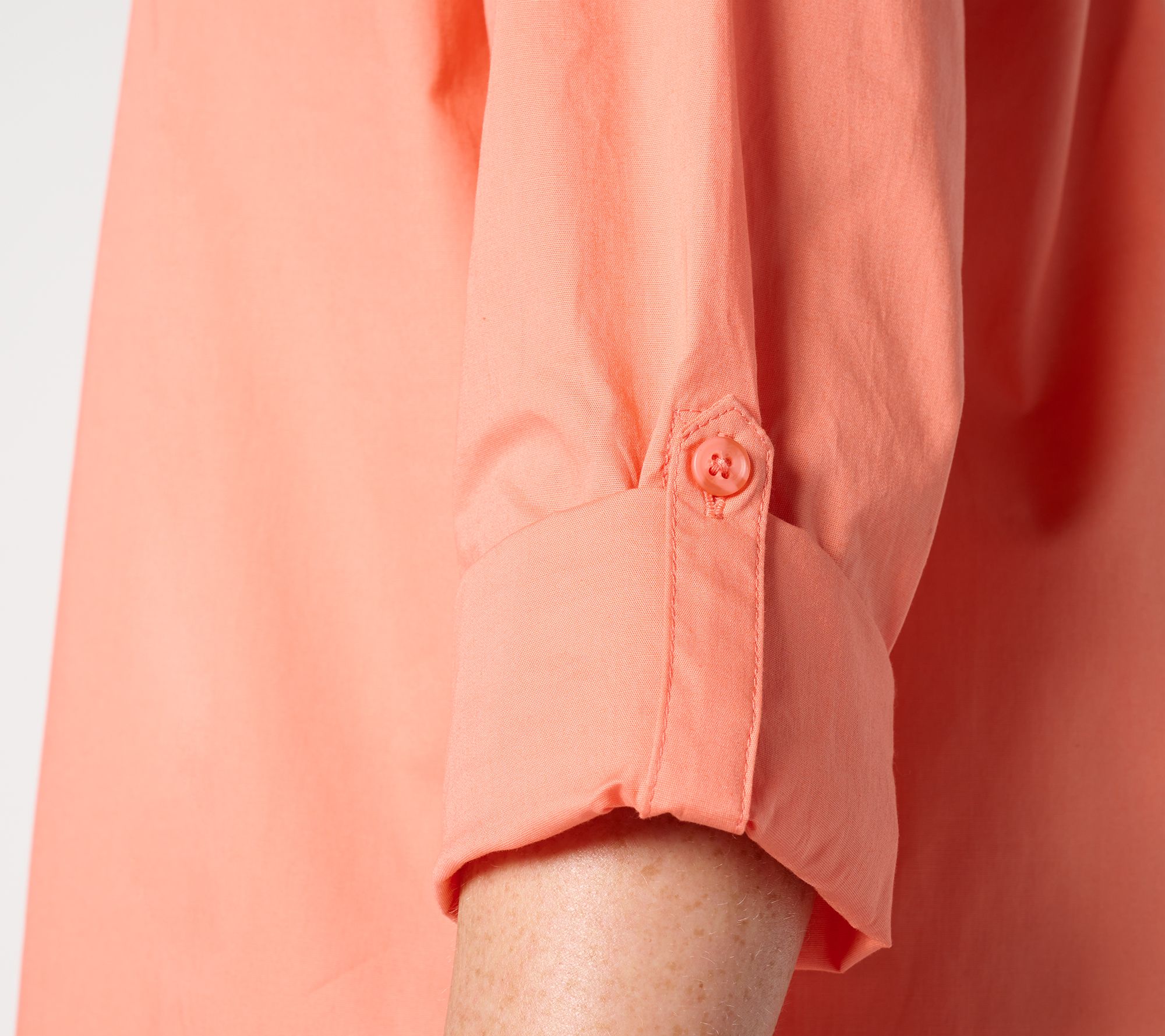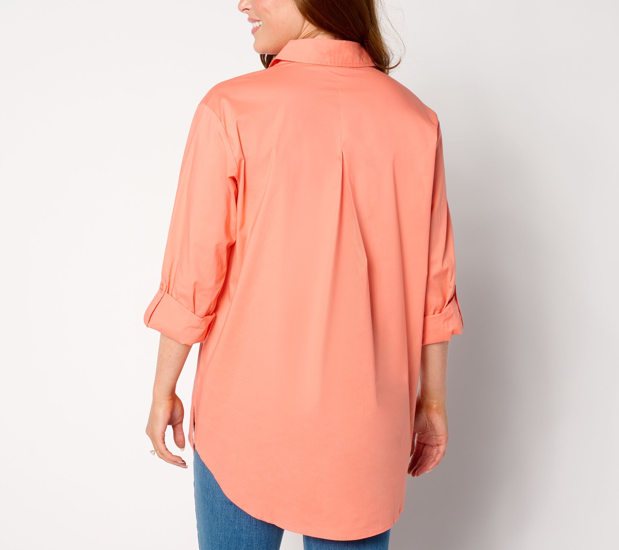 • Features: button-front closure, collar, long roll-tab sleeves, tunic length, hi-low hem, back pleat