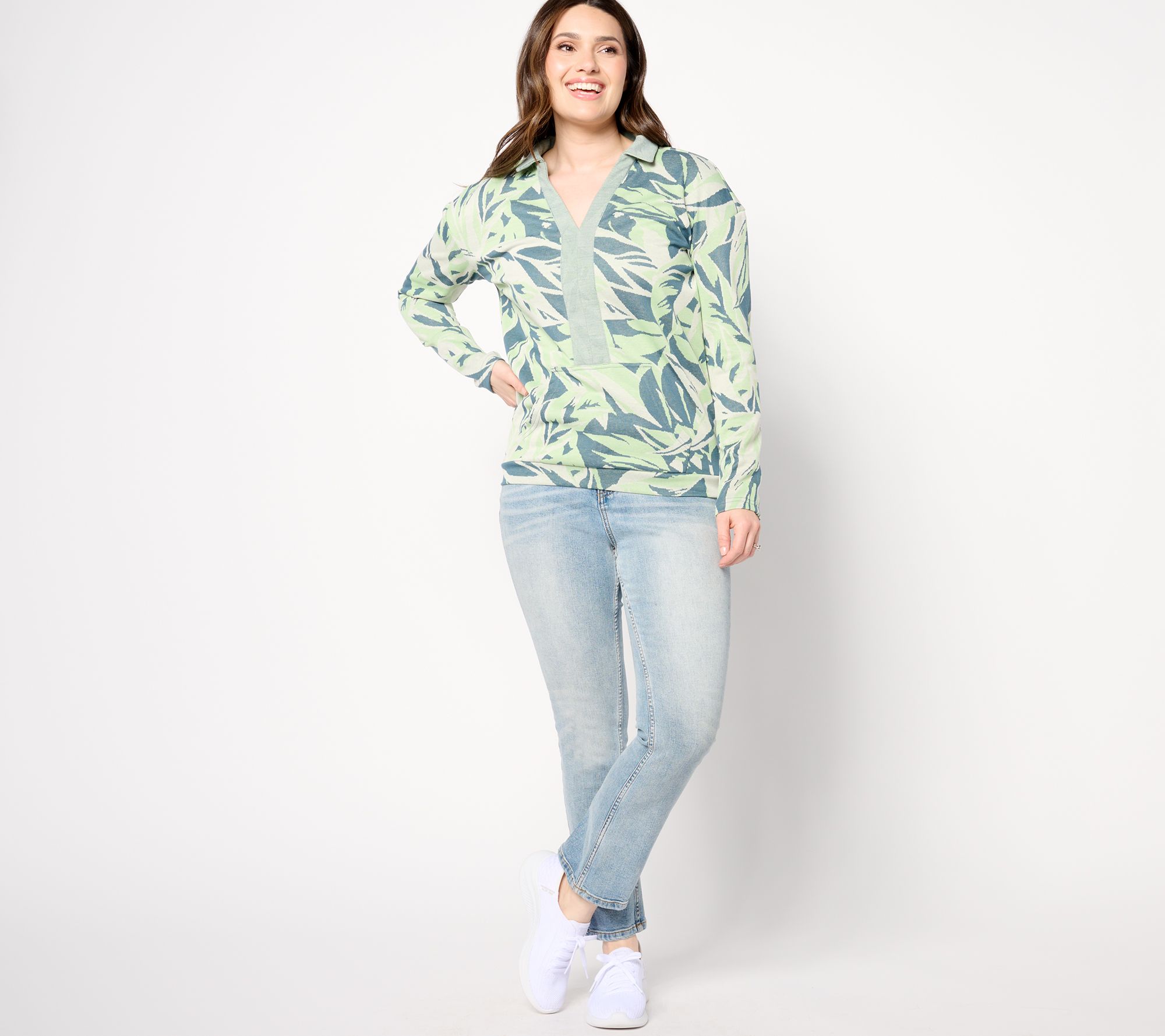 Fond of the frond? Pull on this palm jacquard top for cool coastal breezes and chilly desert nights. From zuda® Fashions.