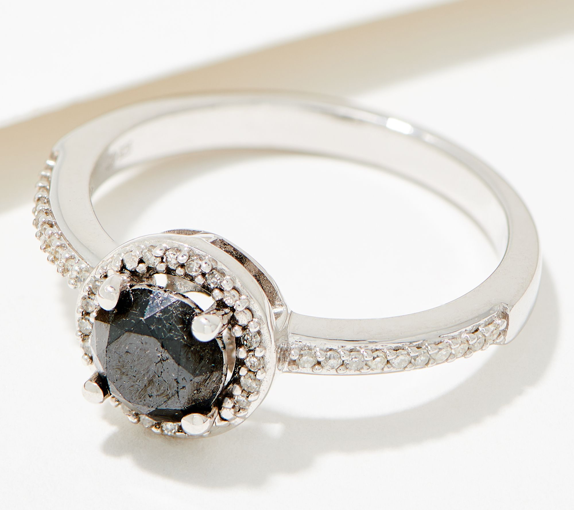 • Black, round full-cut diamond; white, round single-cut diamonds on halo and on shank; polished finish
