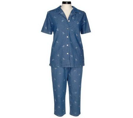 Flowers bloom all over this sweetly embroidered set. The design coordinates on the camp shirt and cropped pants for perfectly paired style. From Denim & Co.(R) Fashions.