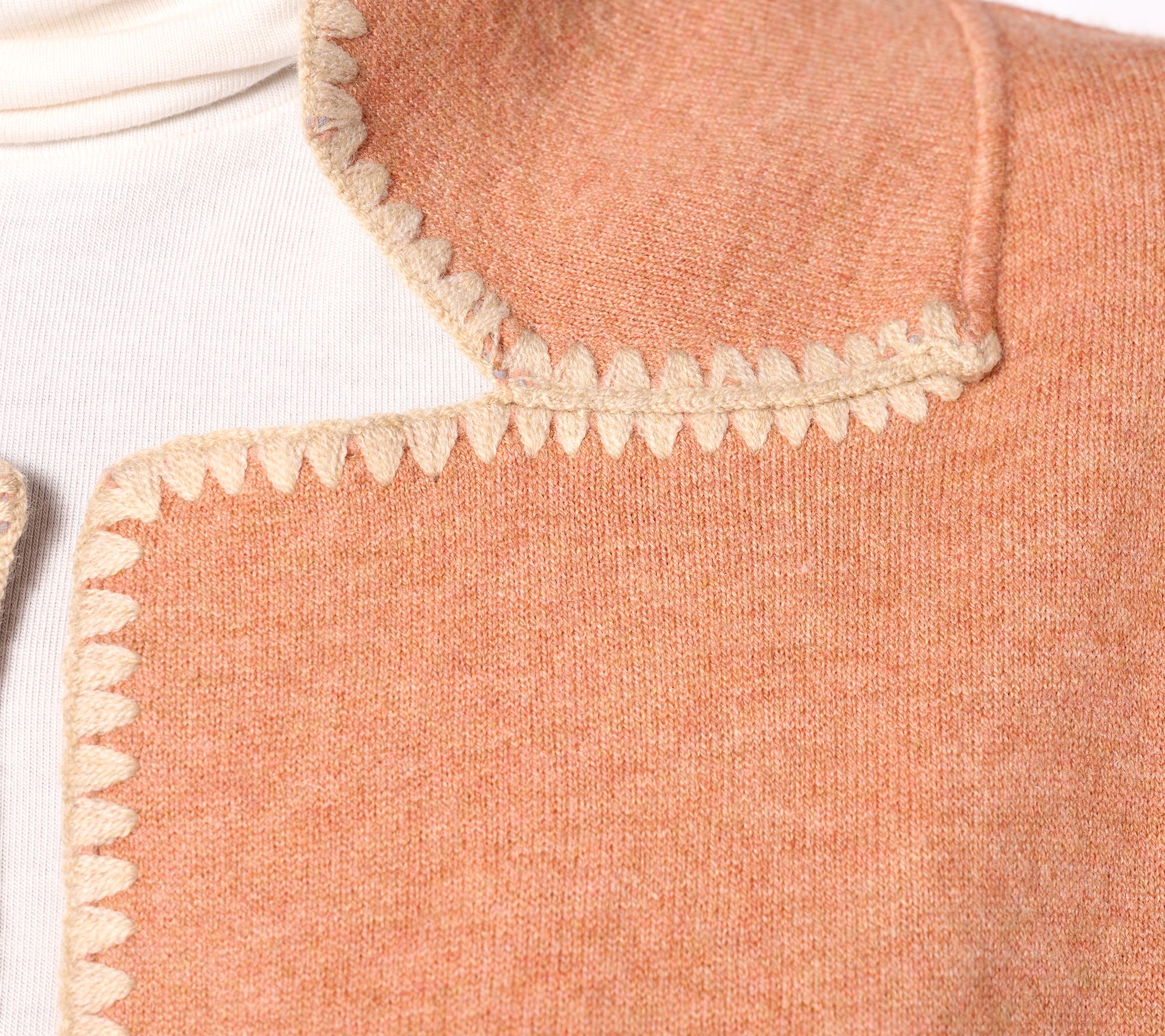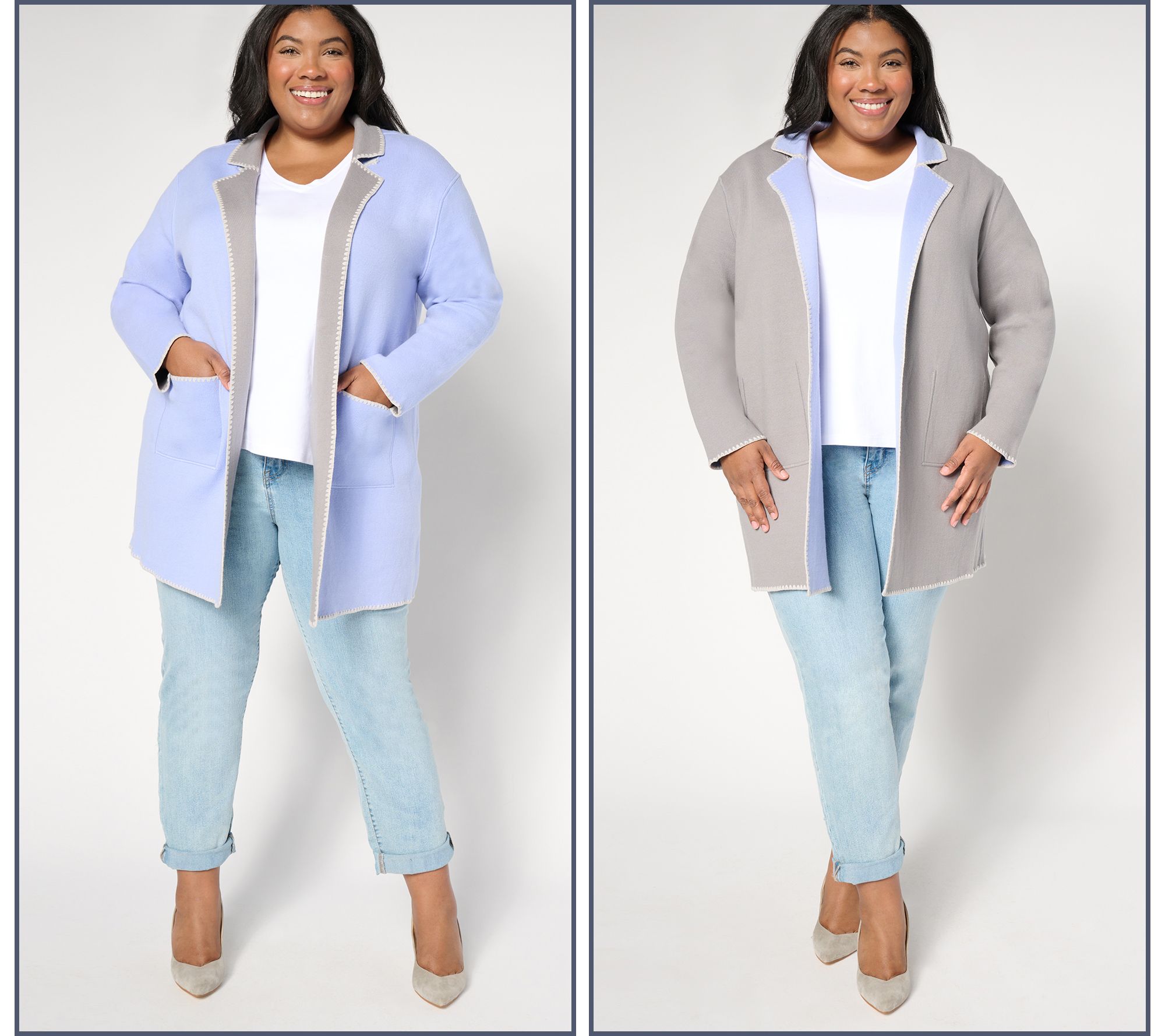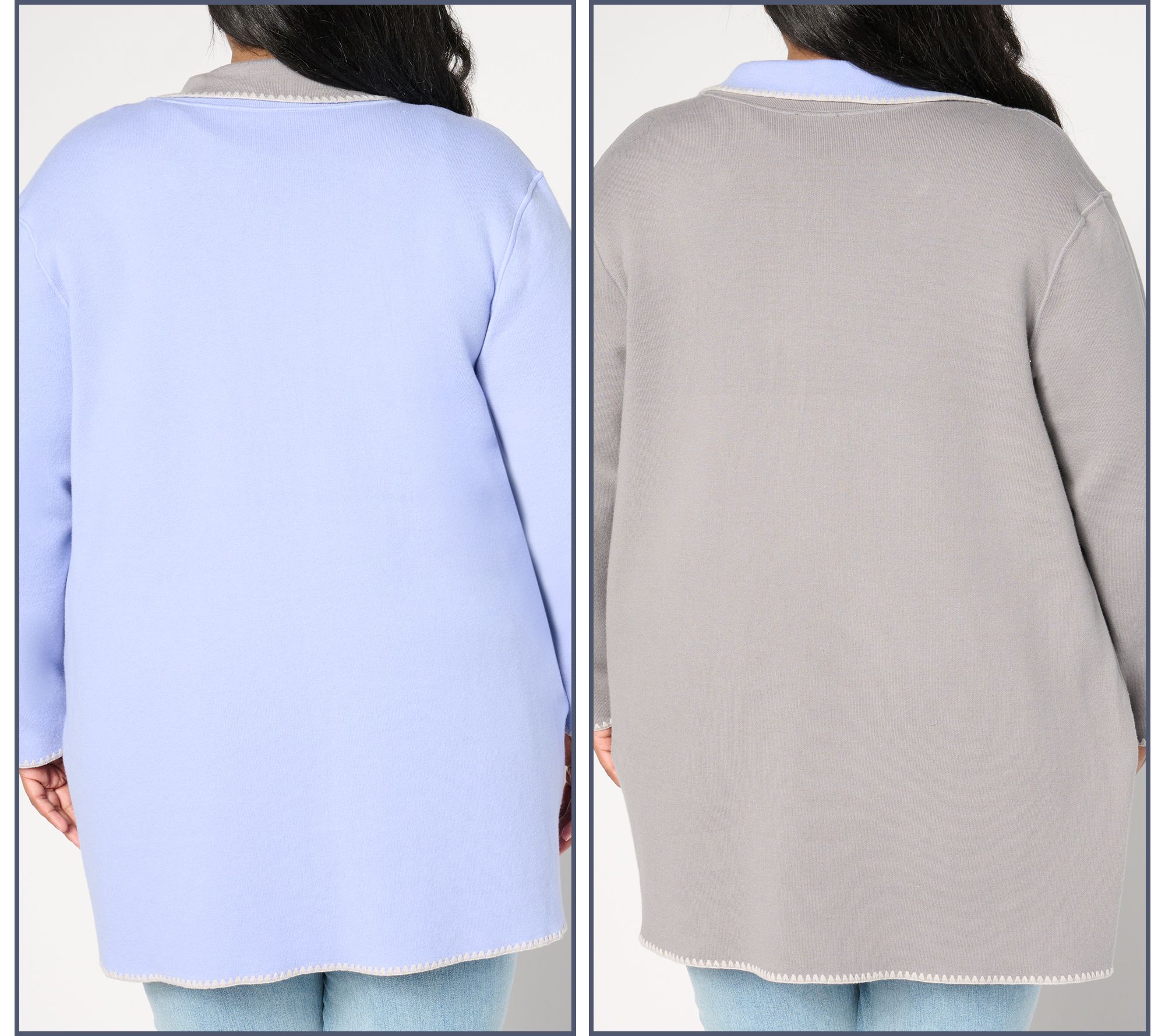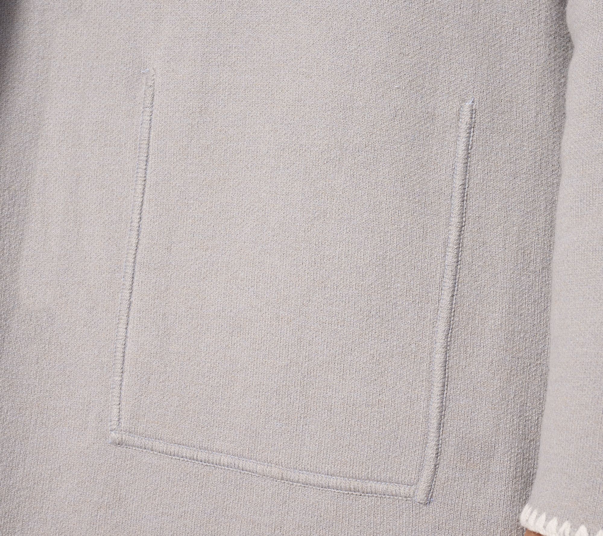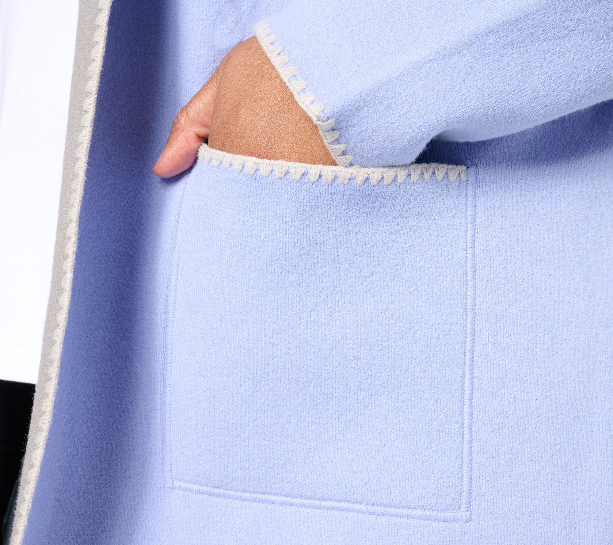 • Features: reversible style, pockets on one side, blanket stitch edge detailing, long sleeves, open-front design