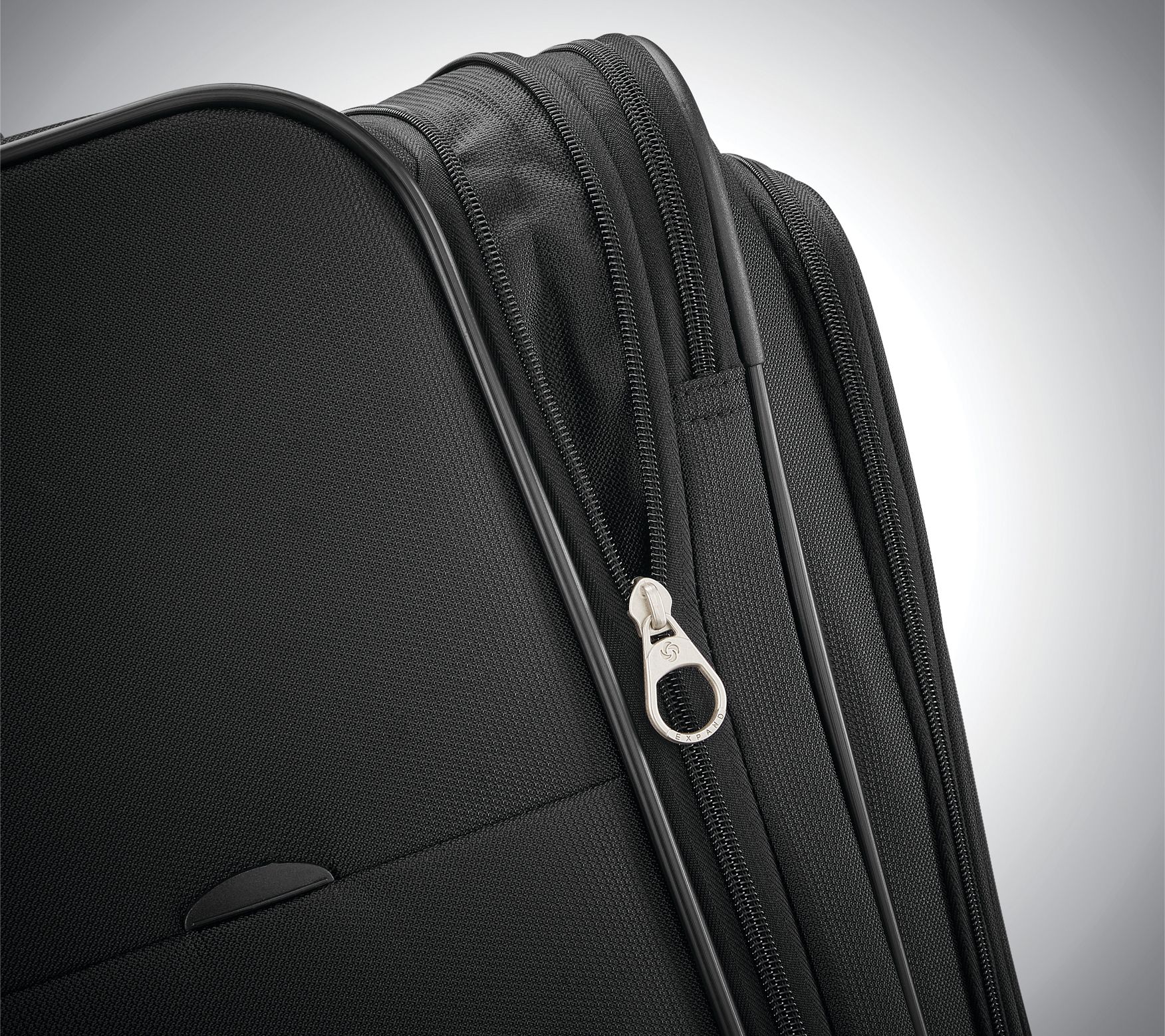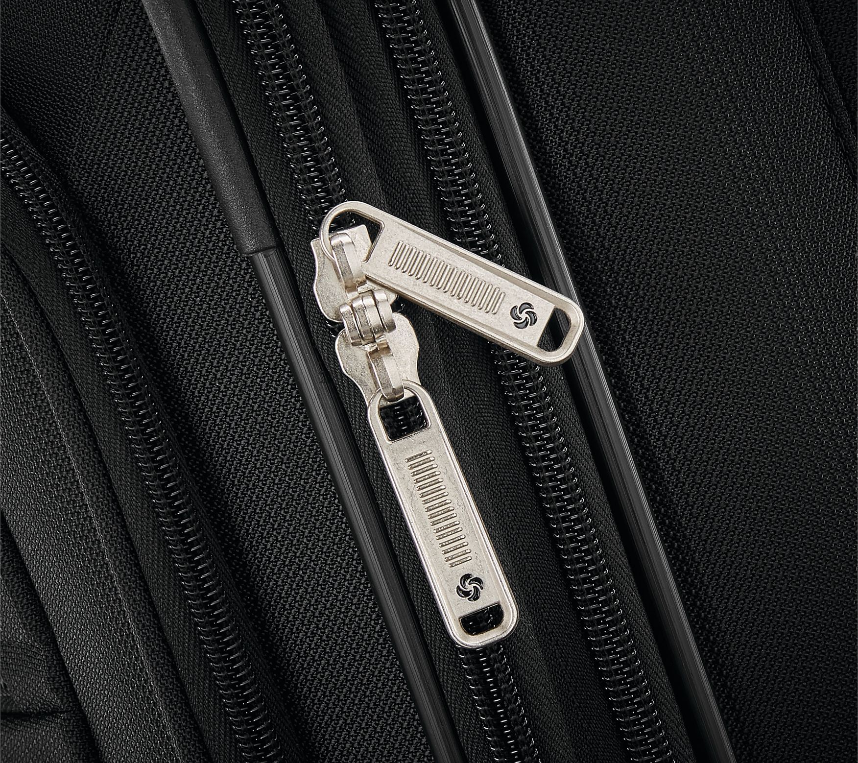 • Zipper closure, eight 360-degree spinner wheels, two zipper pockets, expandable, retractable ID tag, pull handle, carry handles