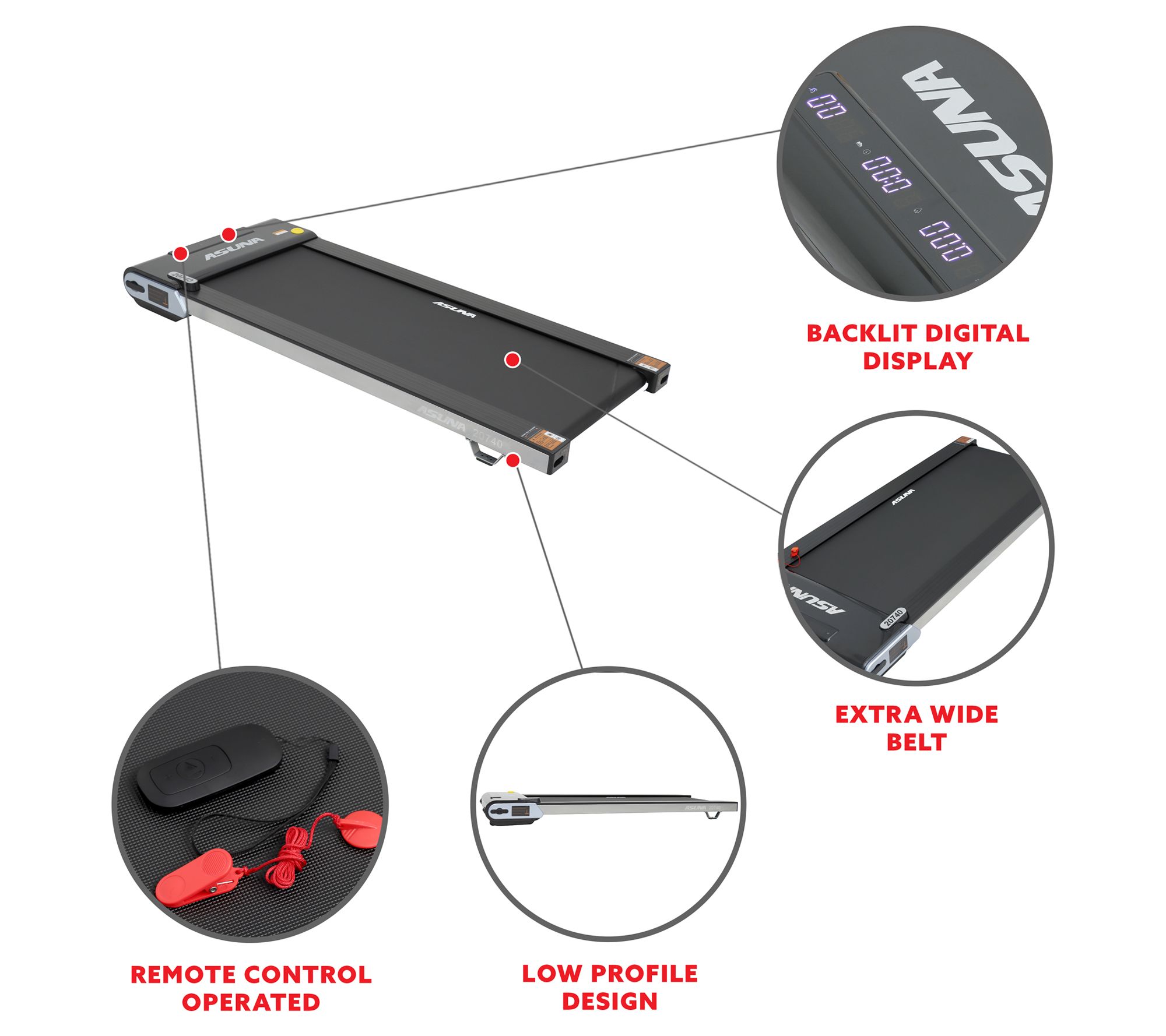 Adding an active lifestyle to your busy daily life is a cinch with the ASUNA 20740 Treadpad Slim Under-Desk Treadmill. Take a leisurely stroll or a brisk walk any time of day (or night) with a treadmill designed to fit in small spaces, under furniture, or even right in your office. The large digital display screen lets you easily view and track your fitness efforts including time, distance, calories, steps, and speed. From ASUNA.