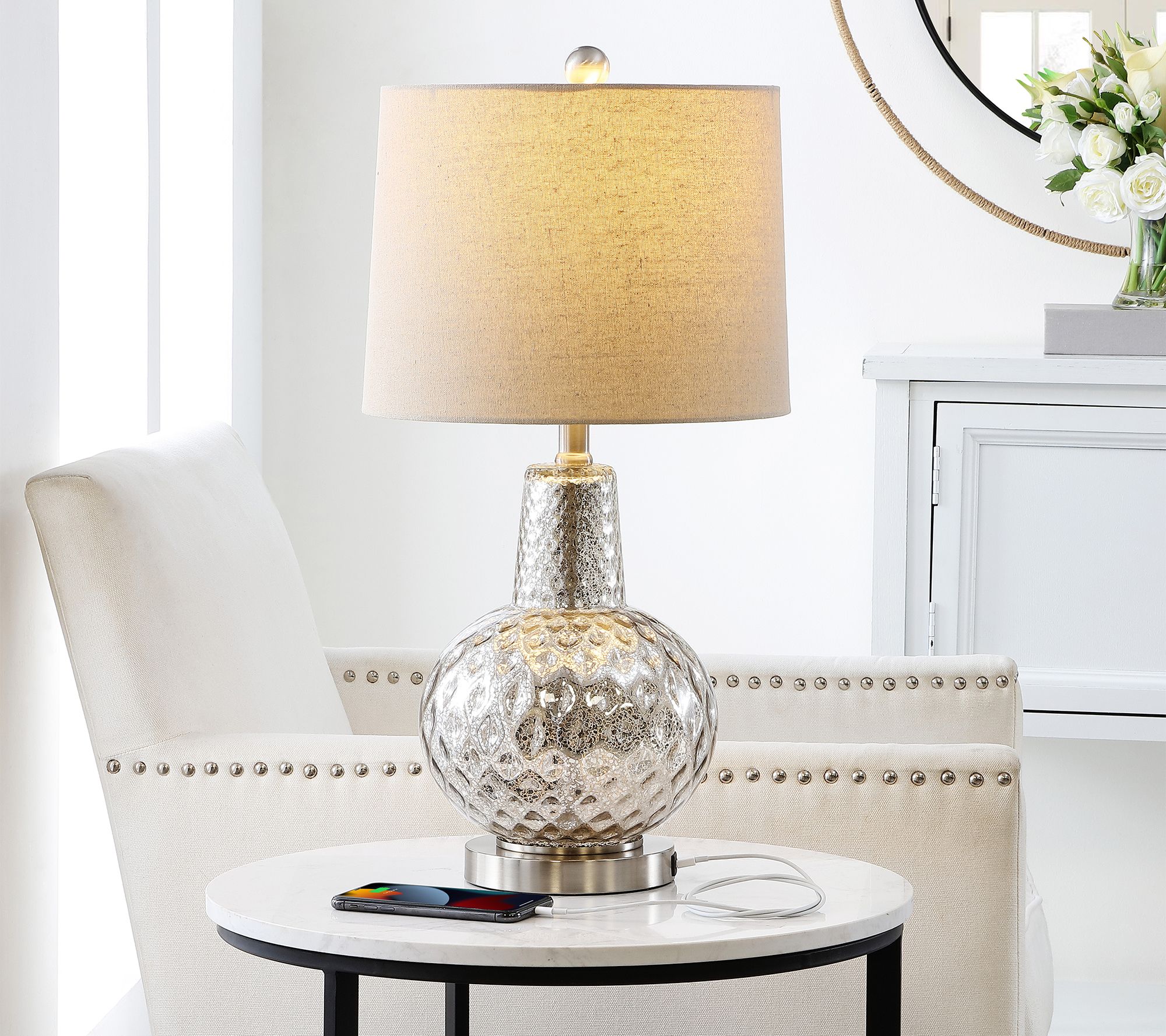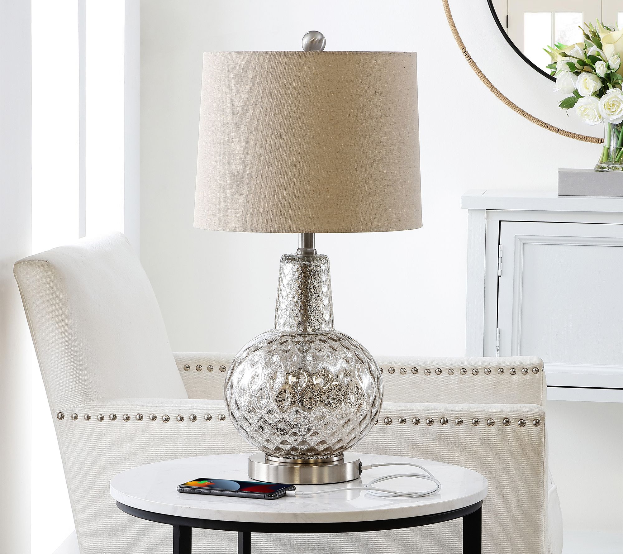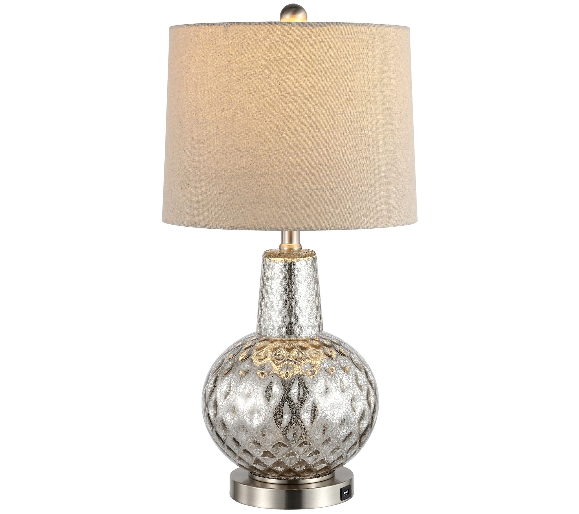 Let there be light! Bring soft illumination and sleek sophistication to your space with this modern table lamp featuring a shimmering mercury glass base and fabric shade. From Safavieh.
