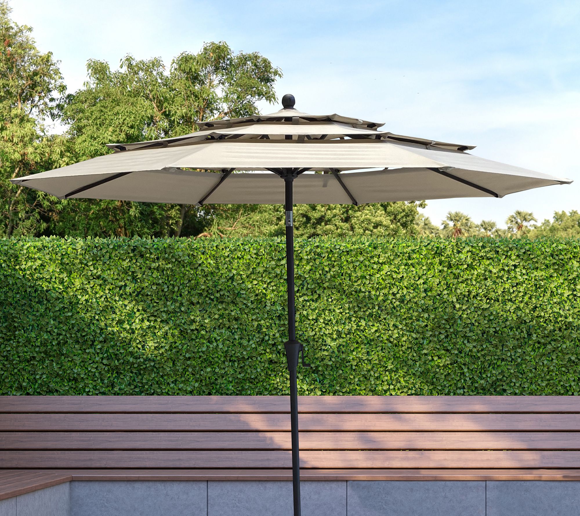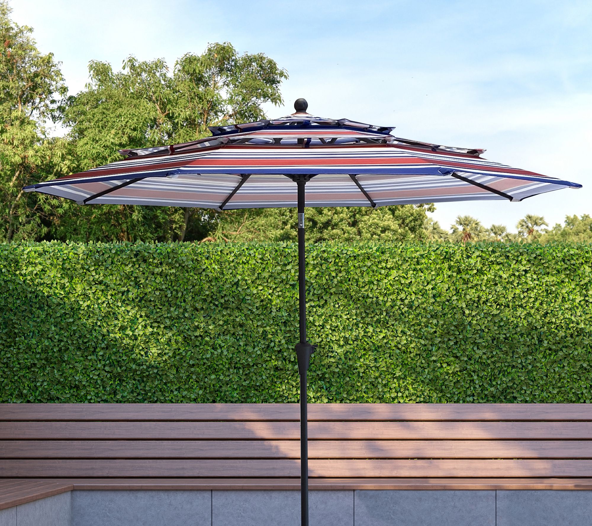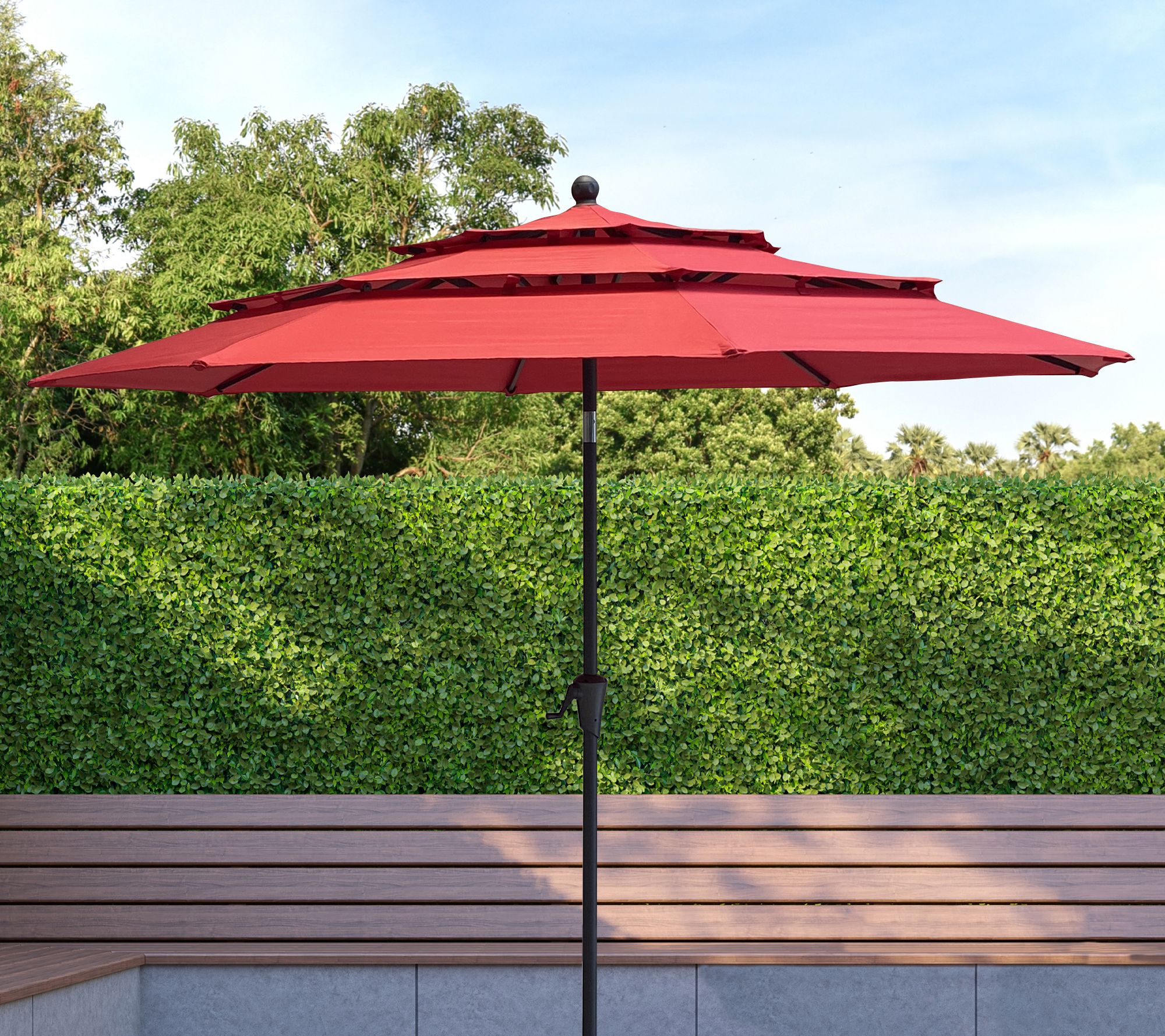 Shield those harsh rays and keep them from ruining sunny days. Transform your backyard into a shaded retreat with this 9'Diam resort-style triple-top patio umbrella. Push-button tilt lets you angle it where it's needed. From ATLeisure.