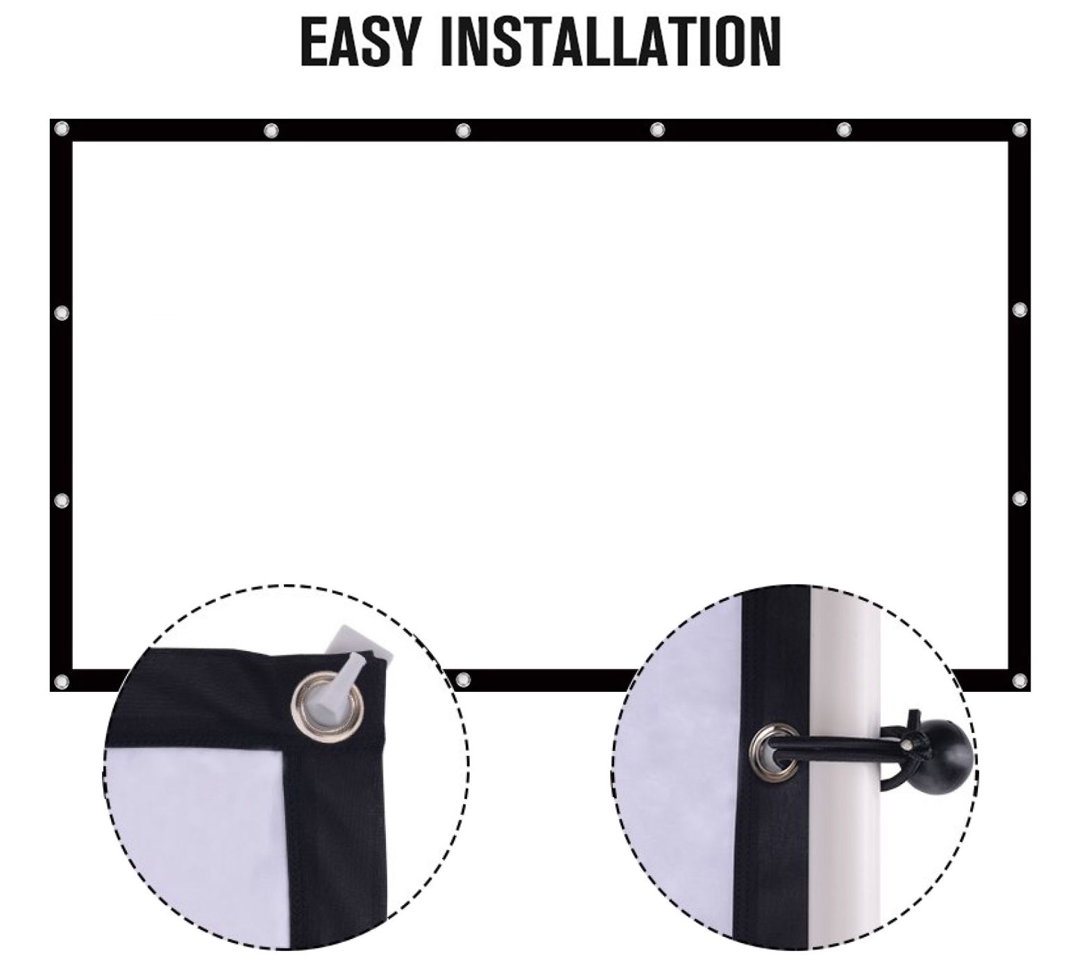• Includes projector screen with four bungee balls, two ropes, and eight adhesive hooks