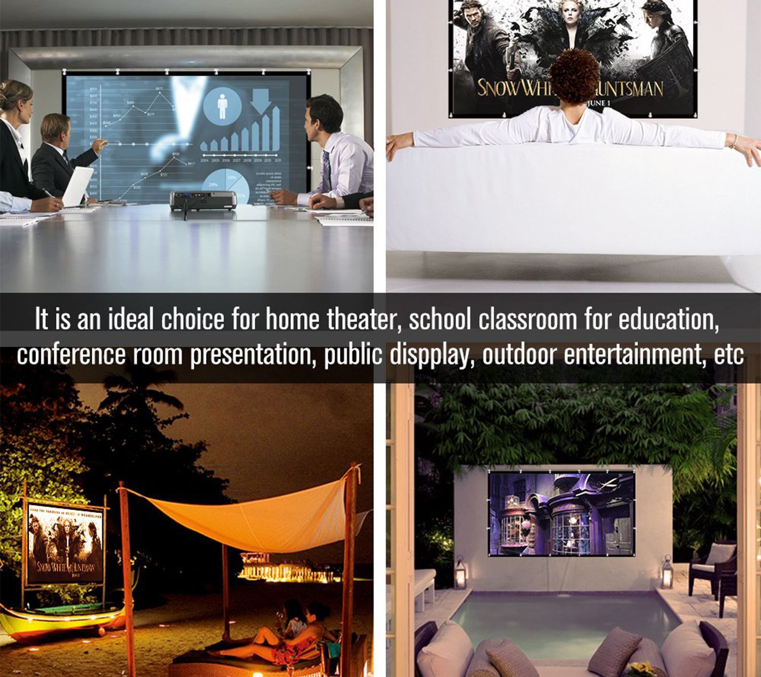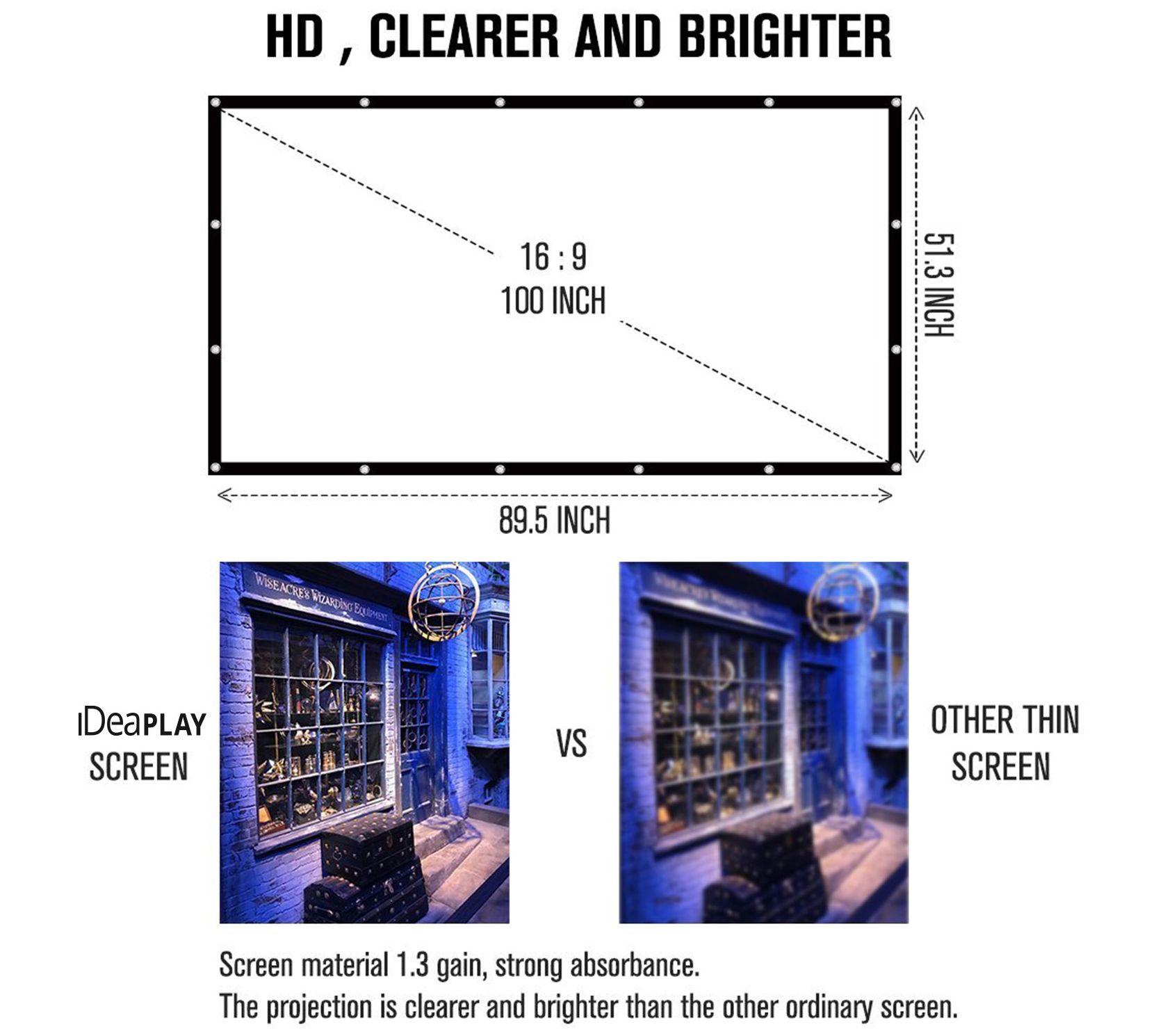 Crease-resistant and highly reflective, this screen is the perfect companion for your projector. The 16:9 widescreen format fits all high-definition videos, and the included universal hanging accessories allow for easy installation in almost all settings. From Atomicx.