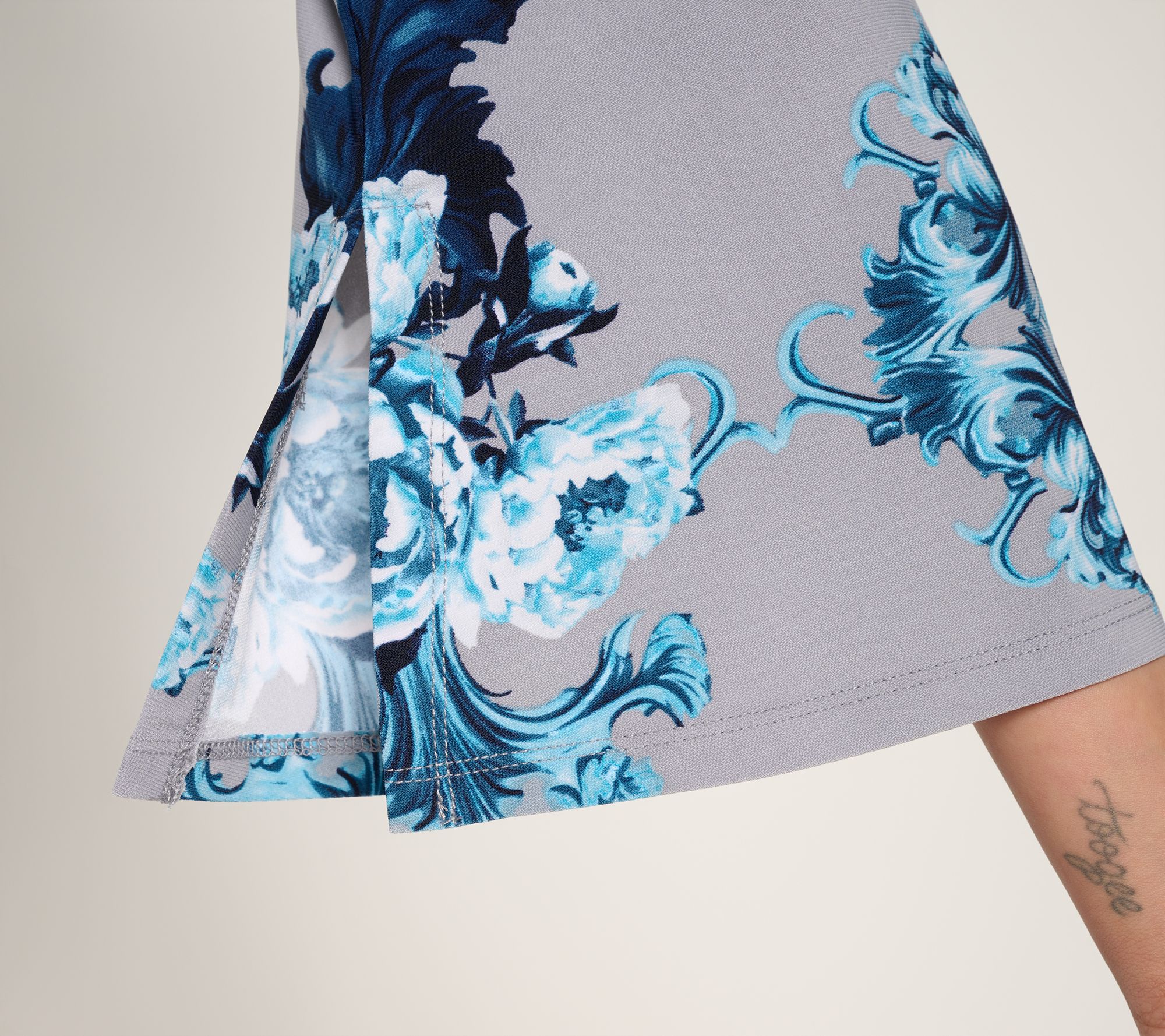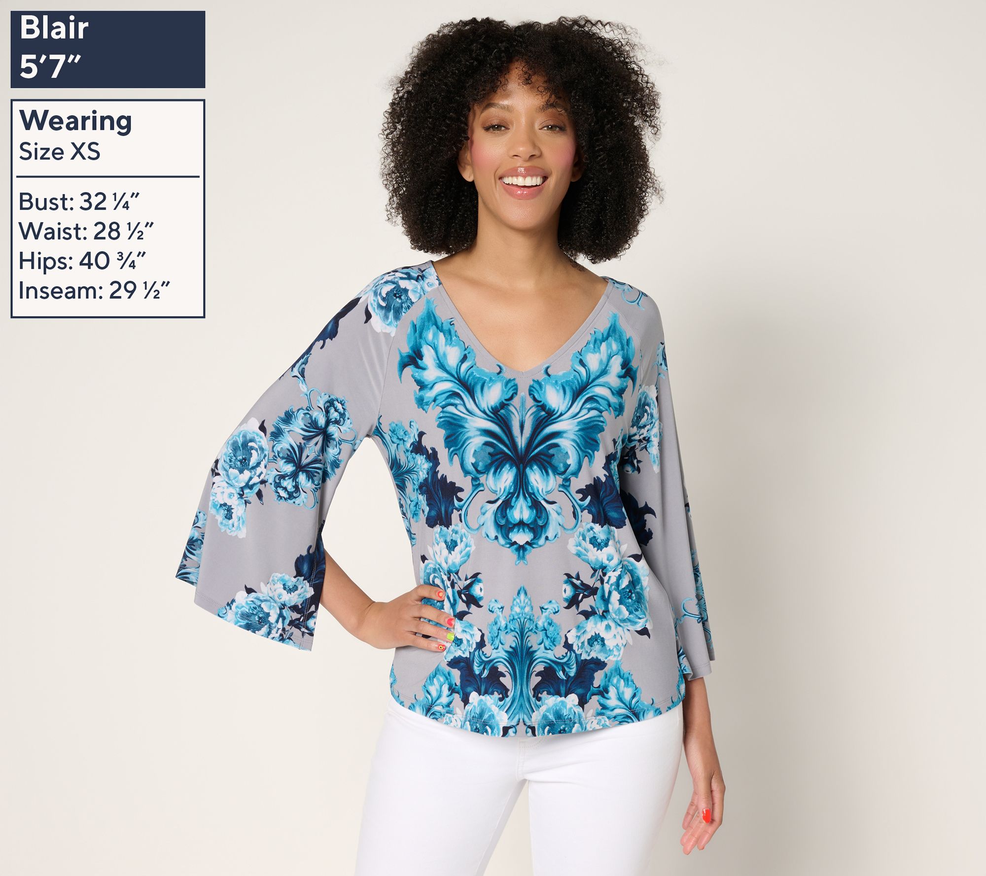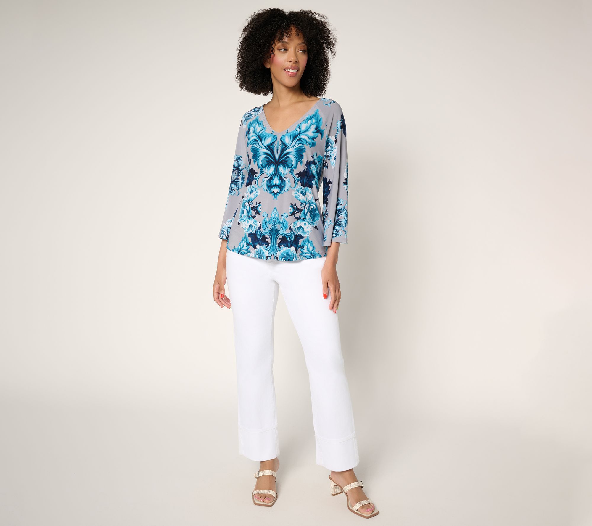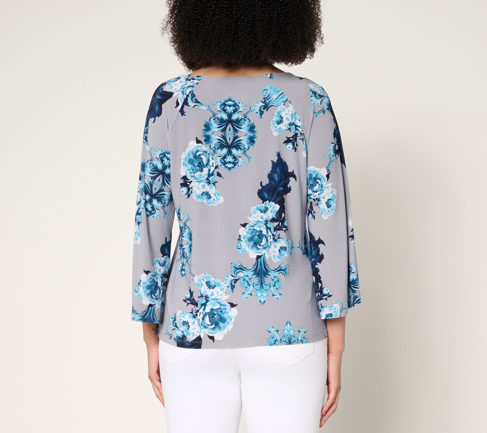 Features: allover print, 3/4-length raglan sleeves with inseam slits