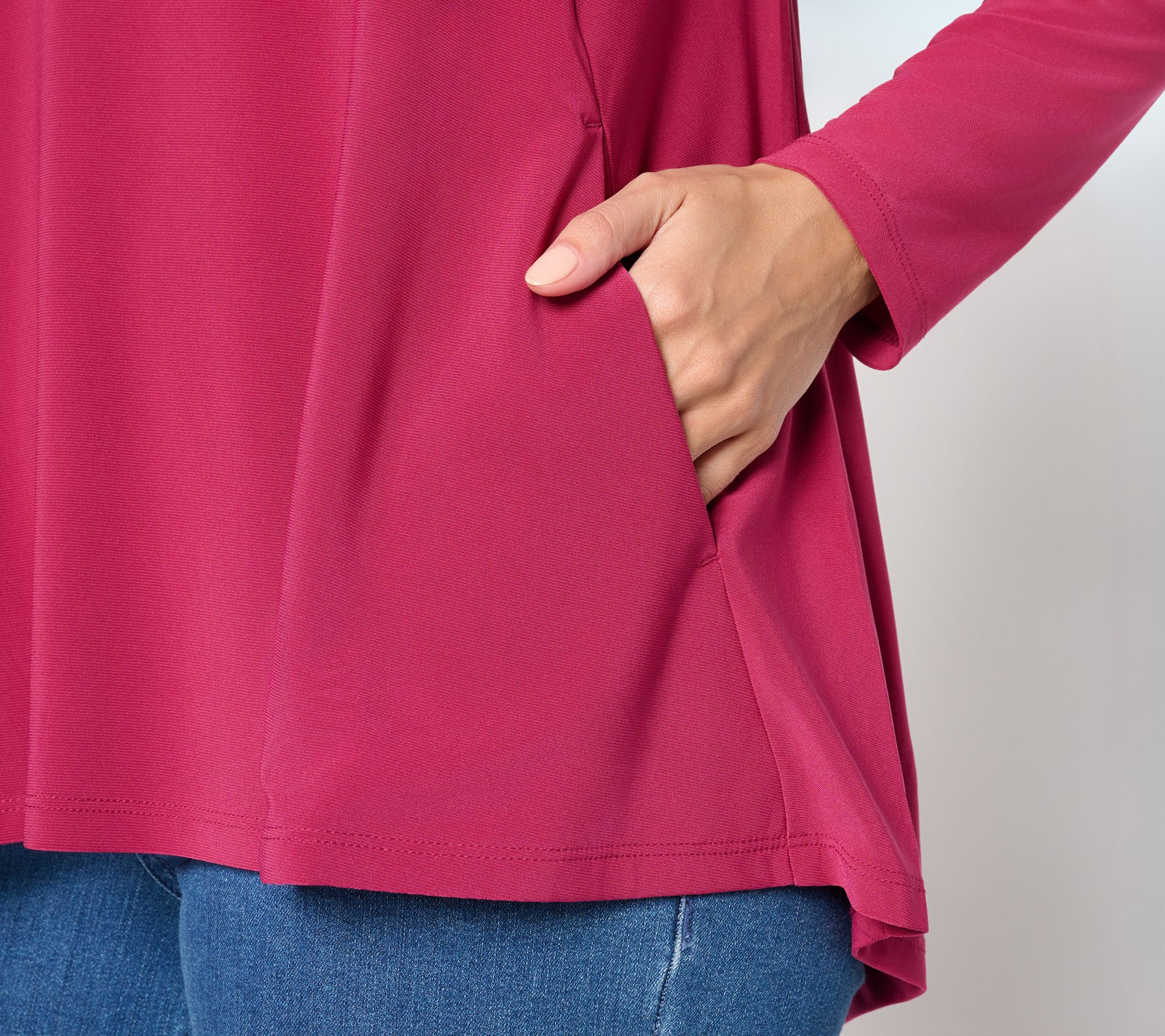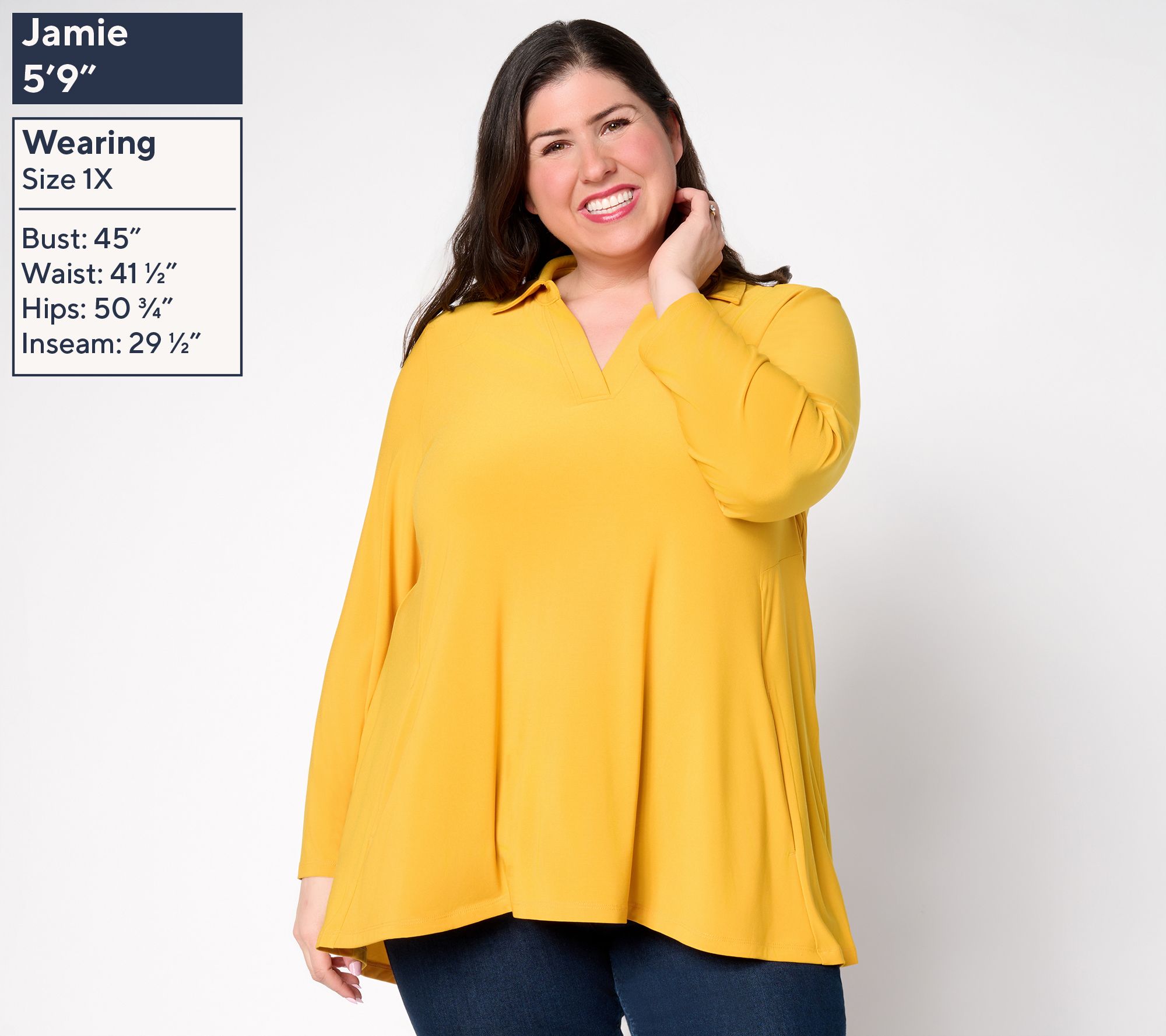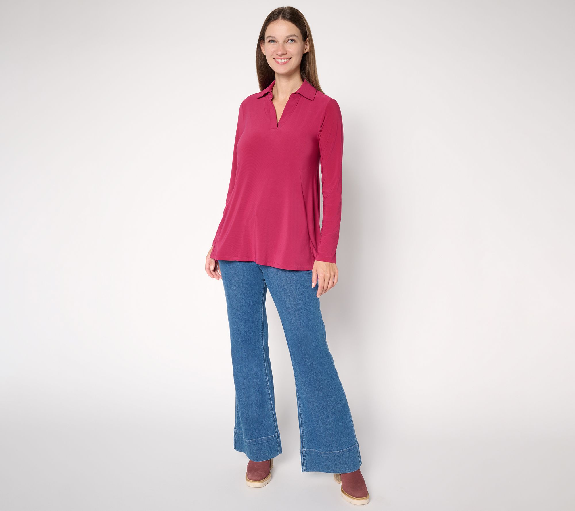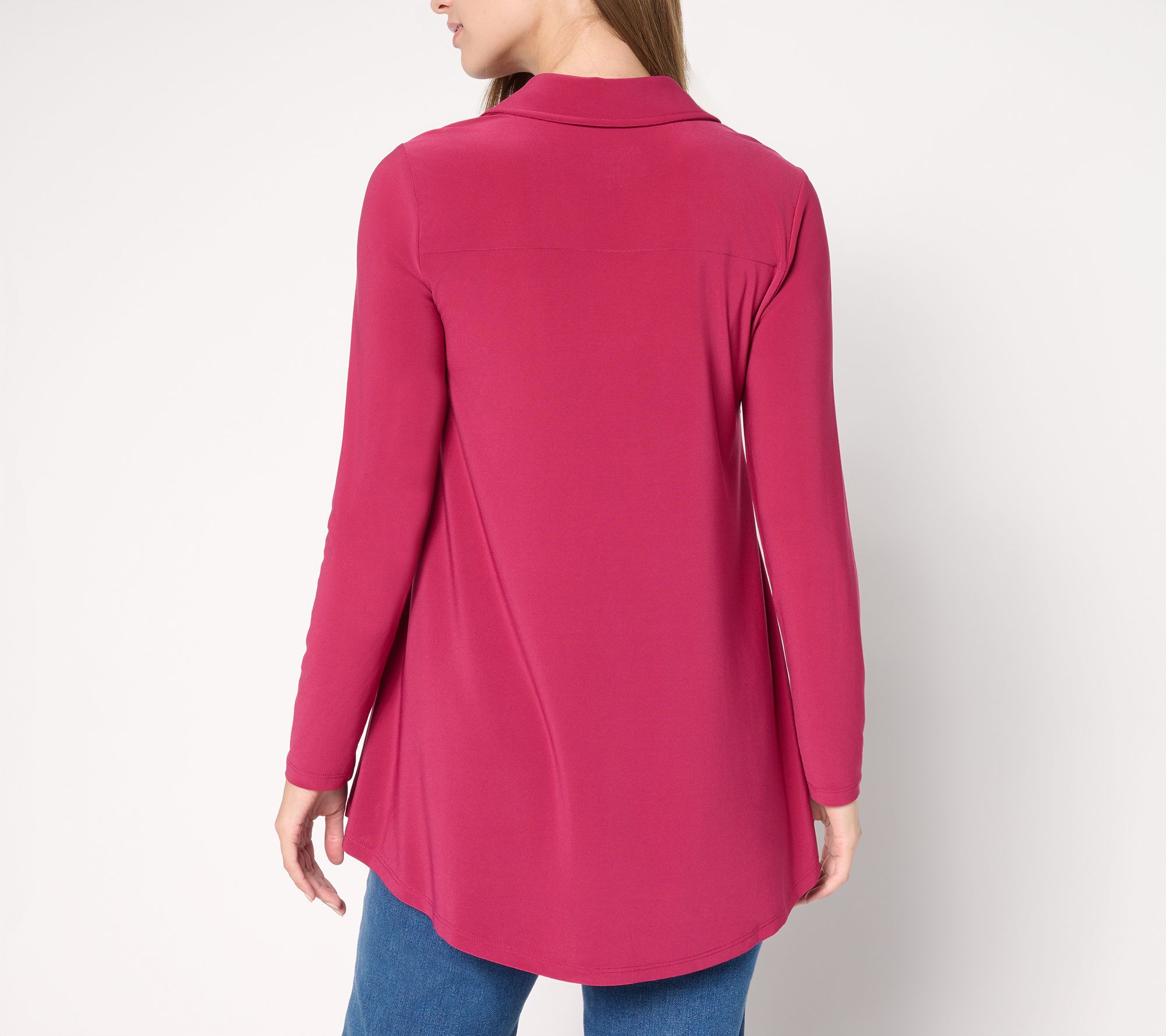 This versatile tunic creates a lively statement with its curved hi-low hem, offering effortless drape that works as well with casual jeans as it does with tailored trousers. The split neckline and point collar add modern polish, while the semi-fitted silhouette keeps comfort at the forefront from morning to evening. From Women with Control®.