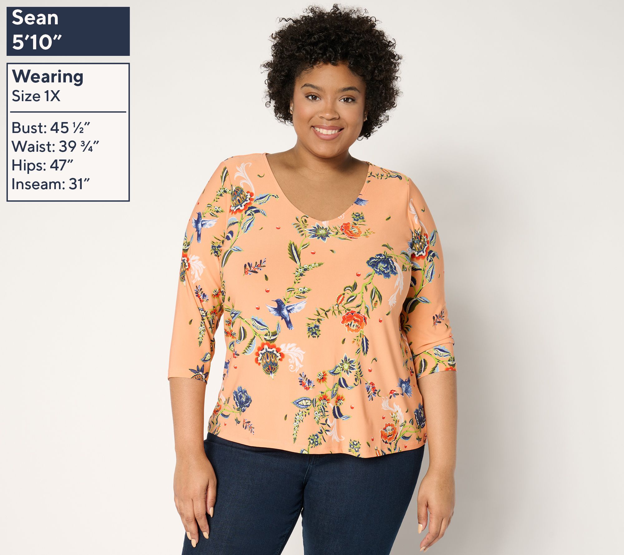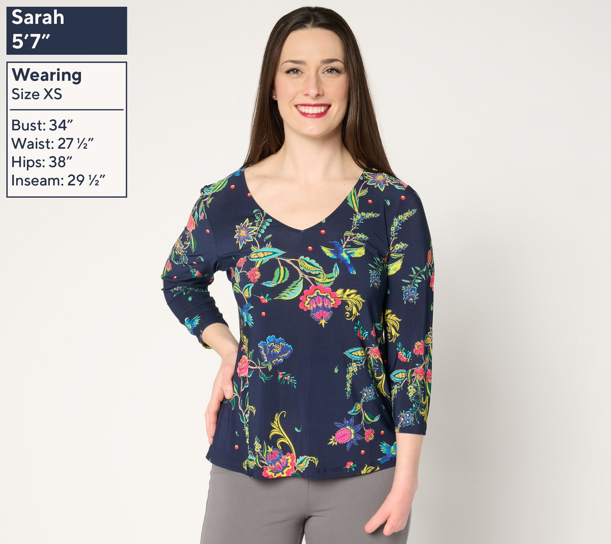 Top Features: V-neckline, 3/4-length sleeves, floral print