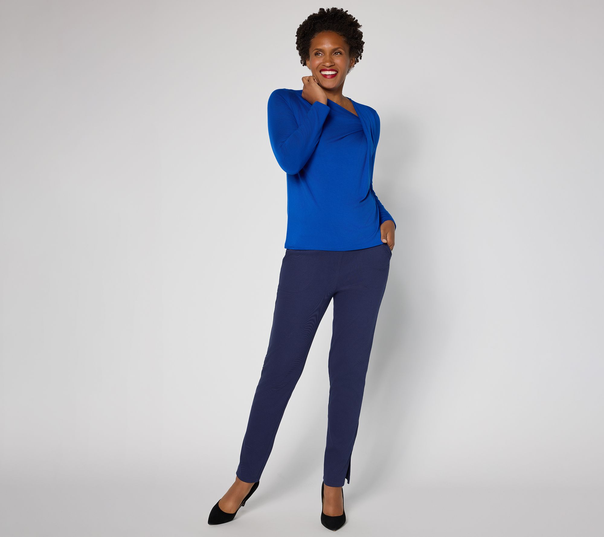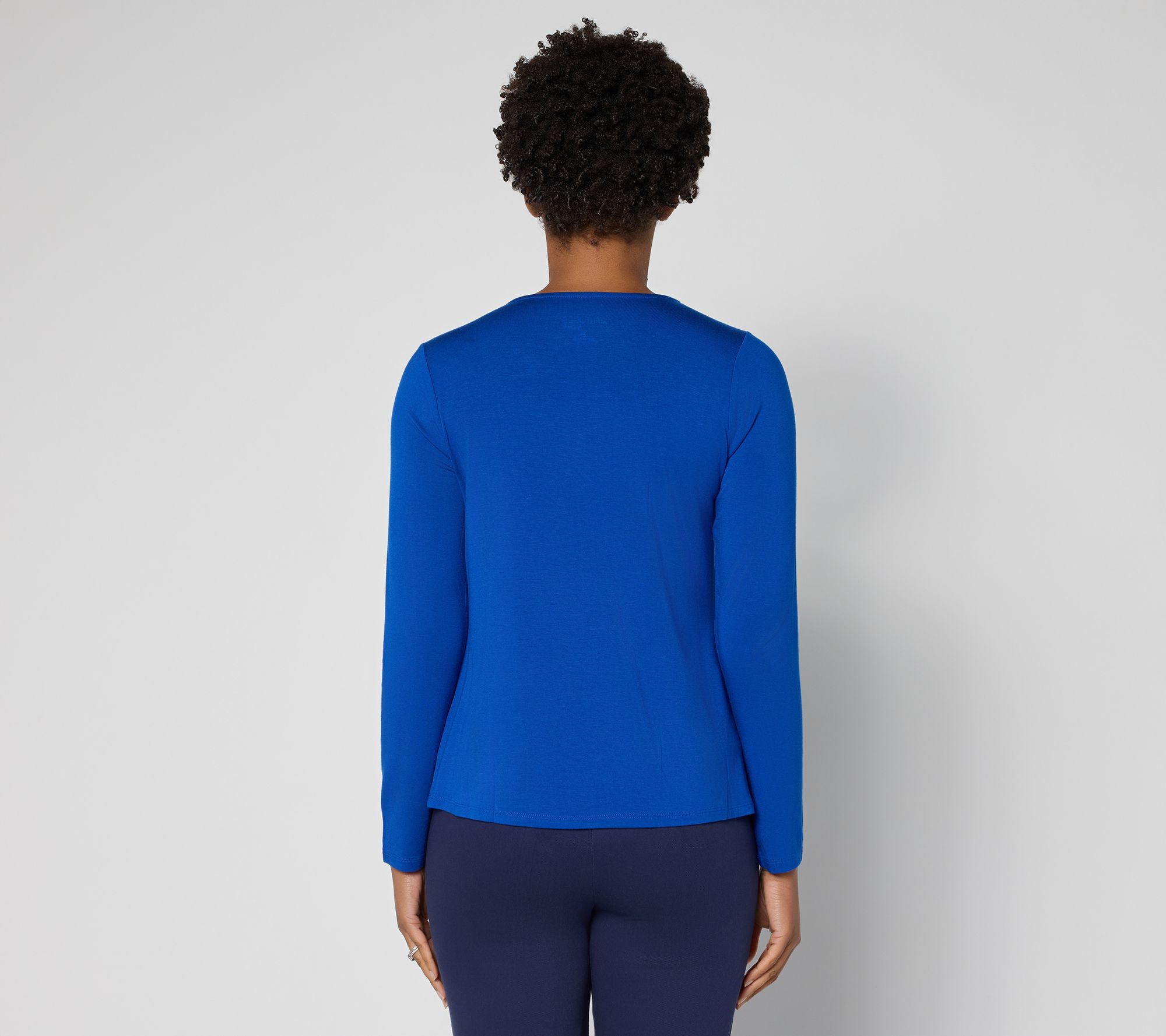 Embrace easy sophistication with this knit top, designed with a twist at the neckline for subtle flair and long sleeves for extended comfort on busy days. The semi-fitted silhouette and straight hem give a tailored look whether styled with slacks for work or denim on weekends. From Women with Control®.