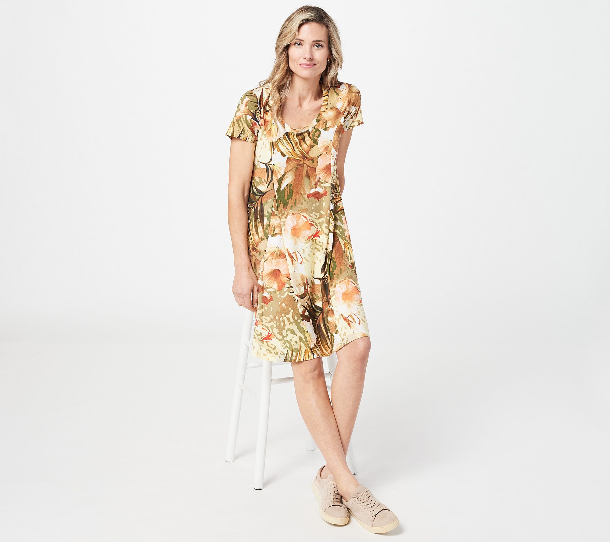A vacay-vibe print and flattering godet pleats make us want to book a one-way ticket to this Como Jersey knit dress -- are you coming? From Women with Control®.