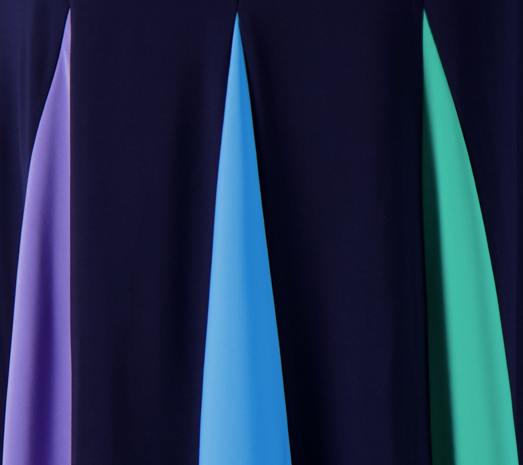 Features: sleeveless, solid color dress with assorted color godets at hemline, pockets