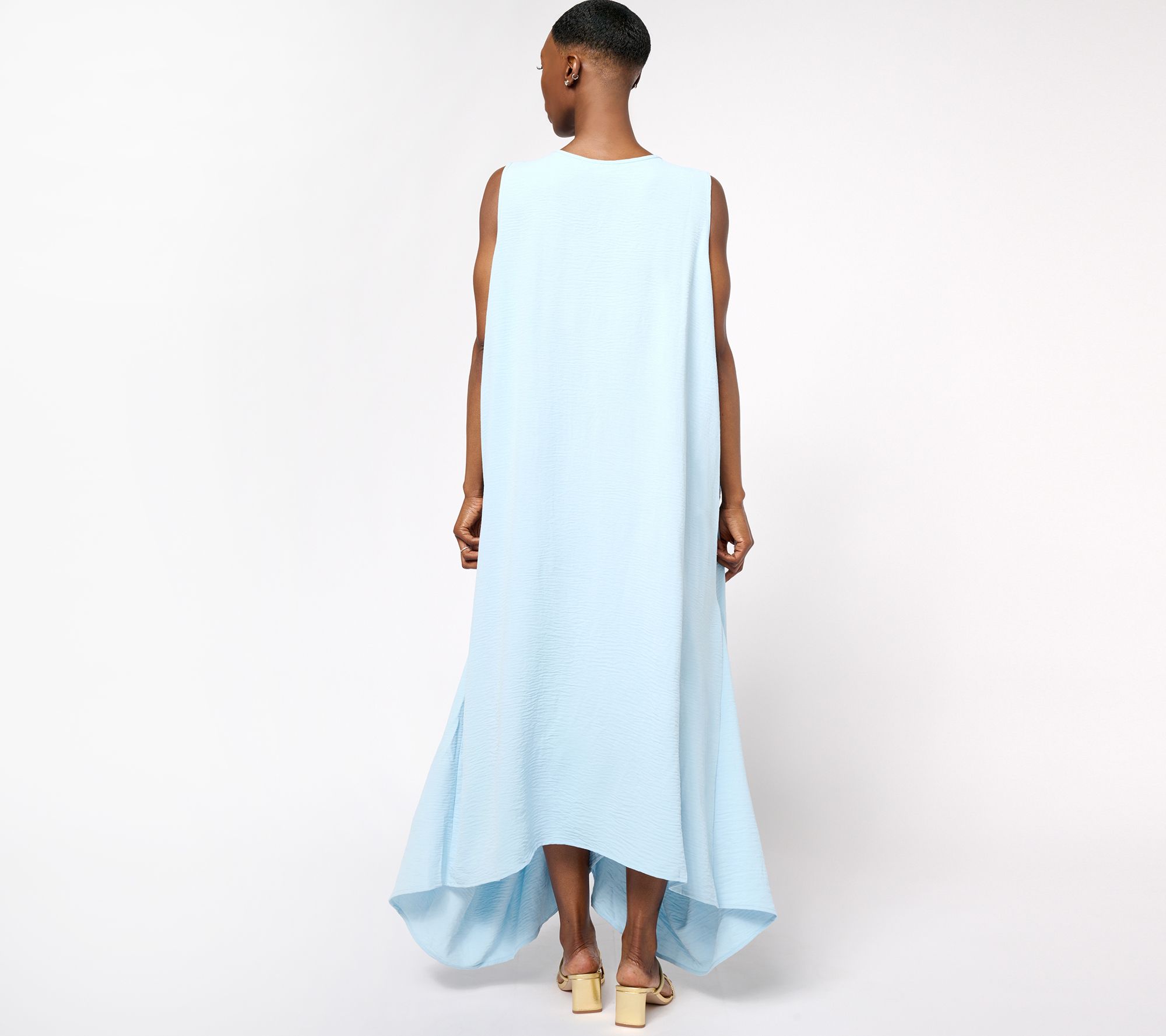 Features: textured, V-neck, sleeveless, front pockets, bias hem