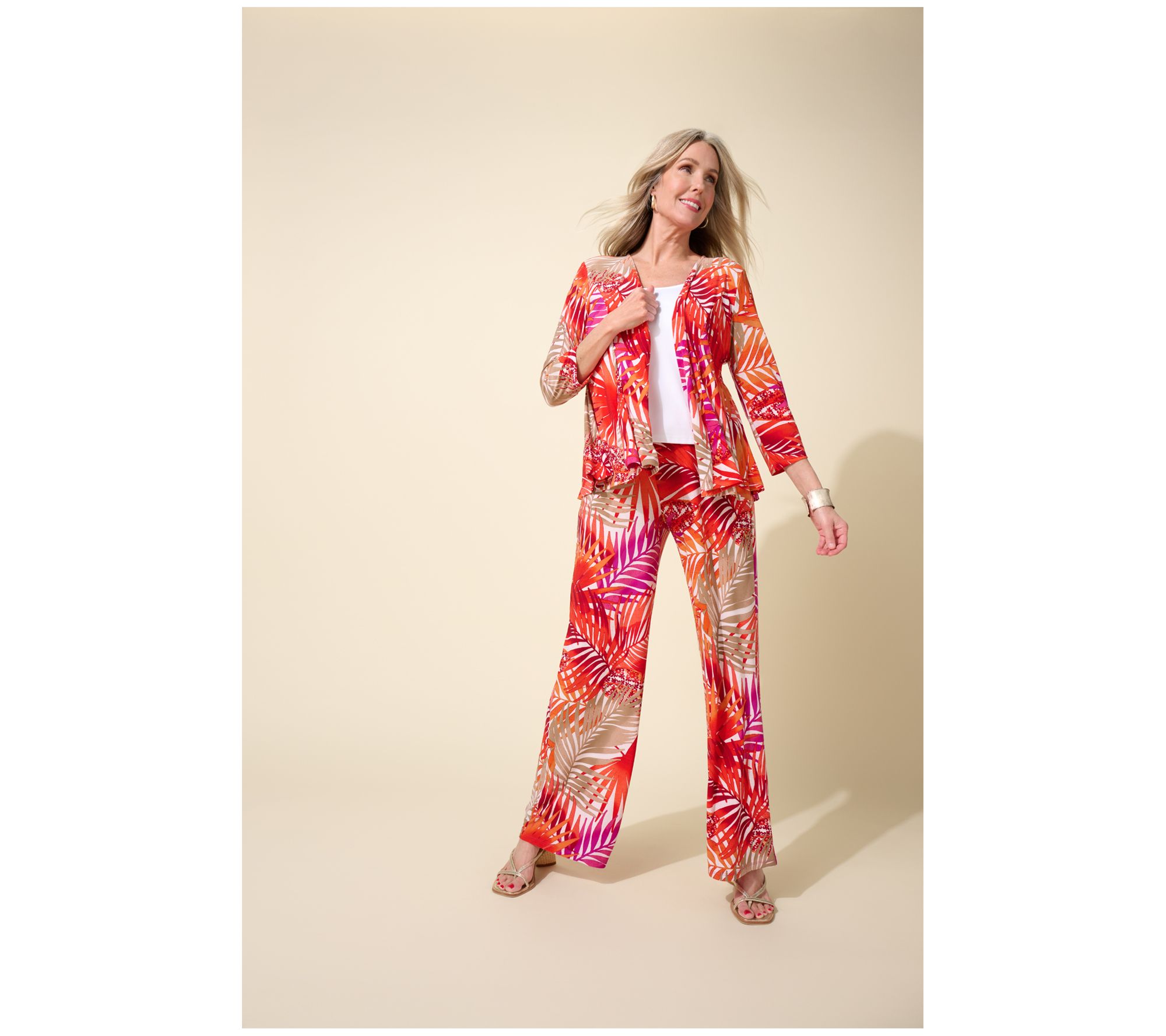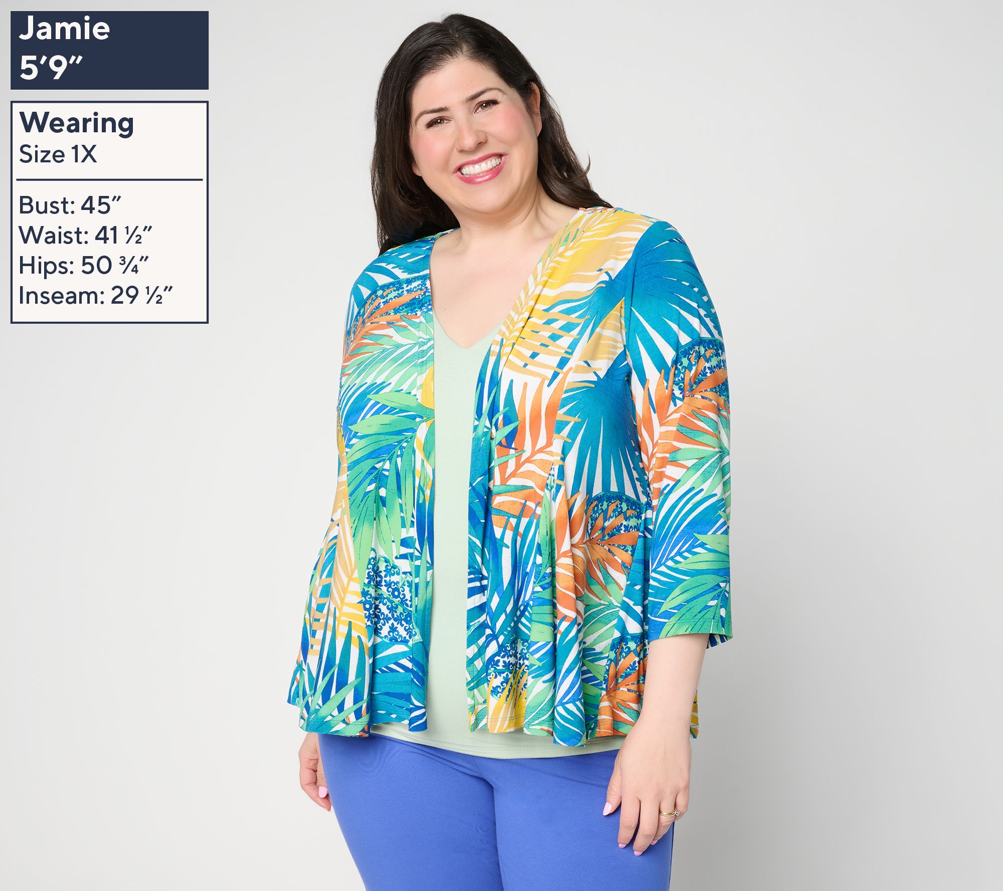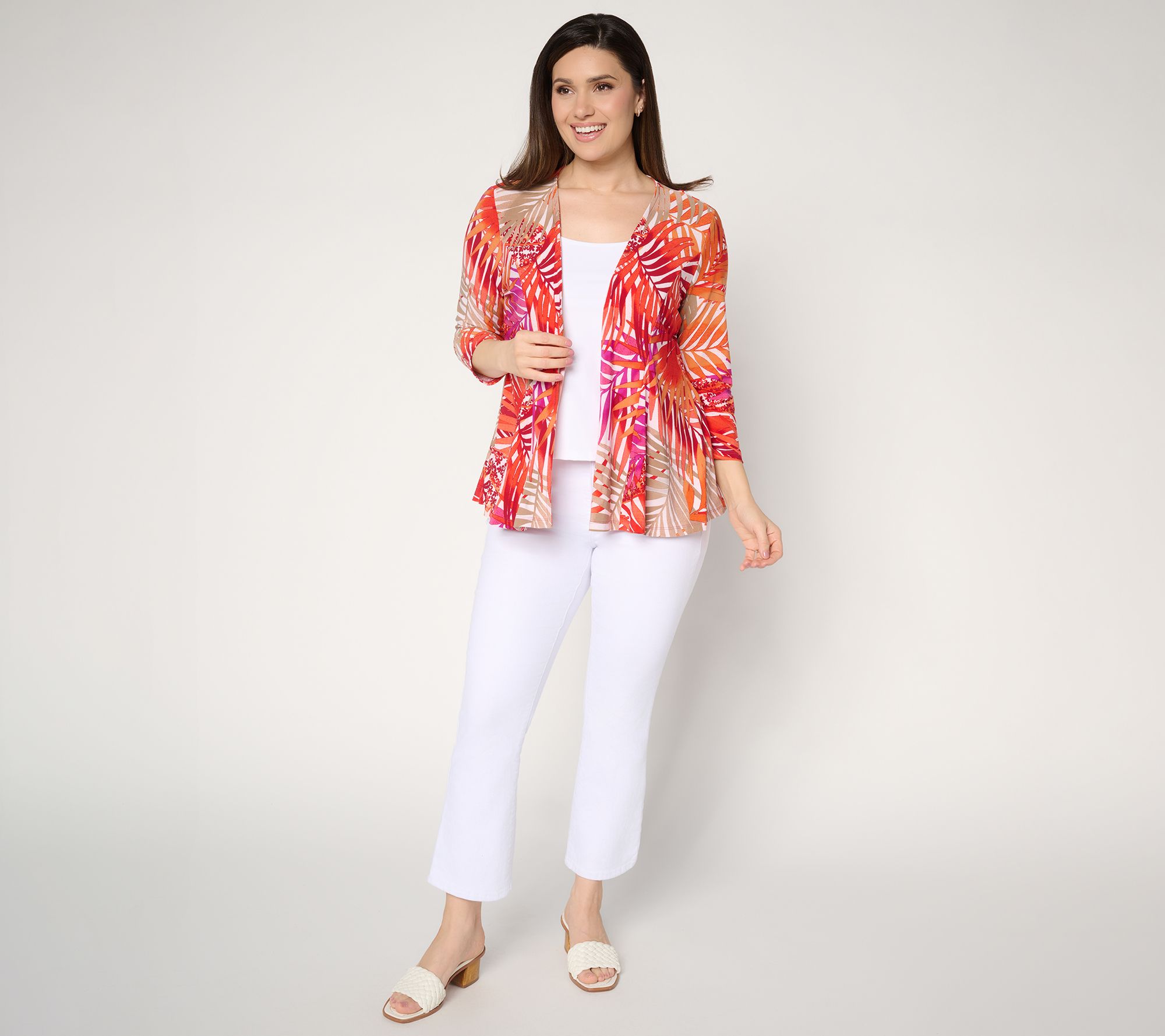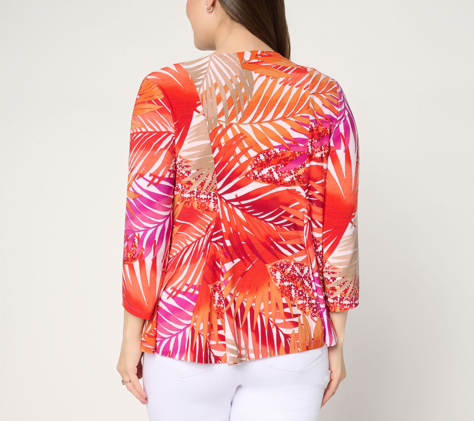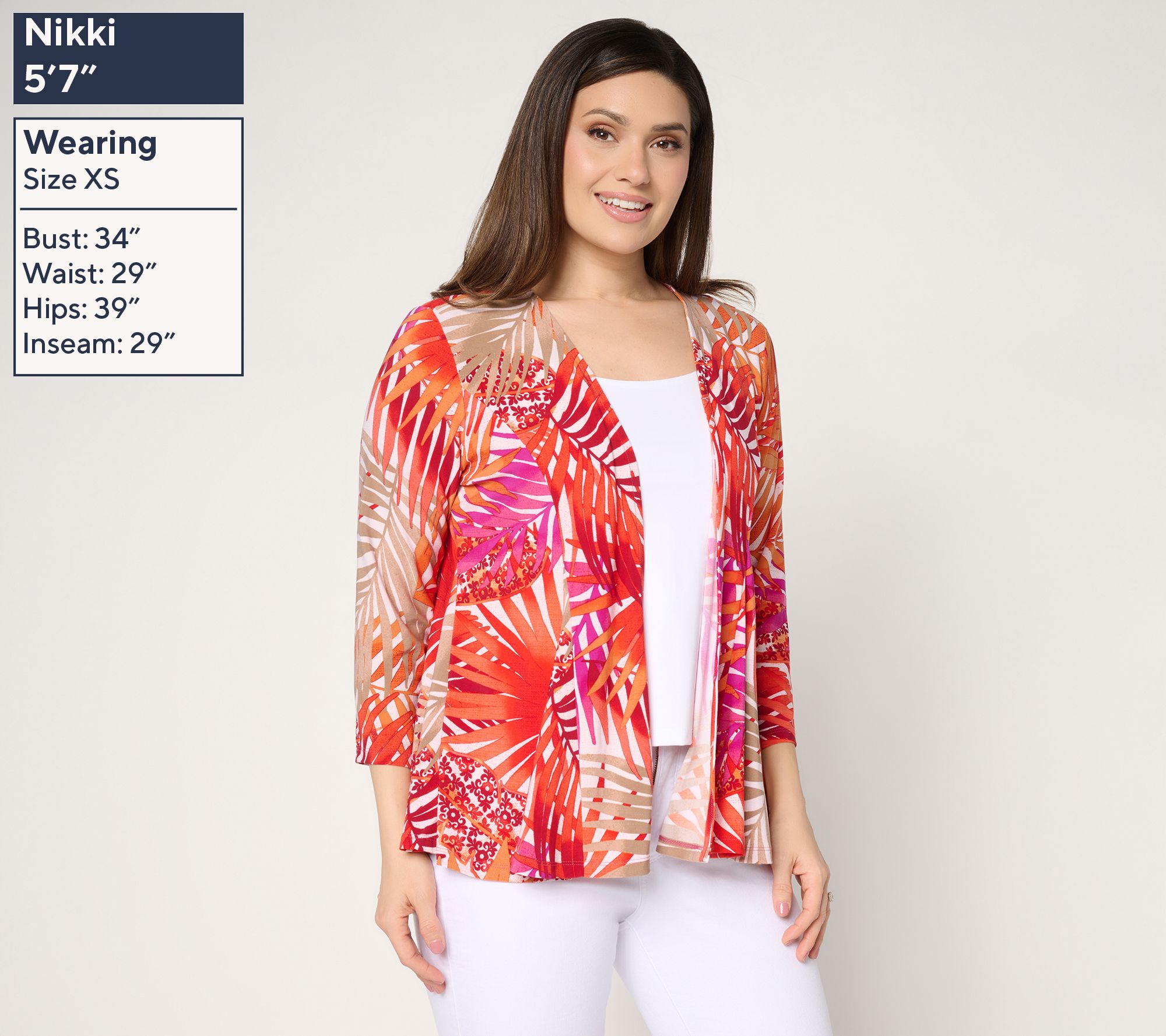 • Features: printed topper, 3/4-length sleeves, open front