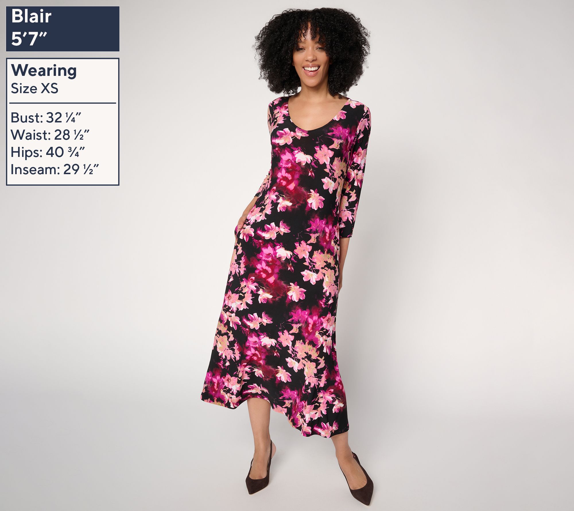Features: midi length, fit-and-flare silhouette, on-seam pockets, center back seam