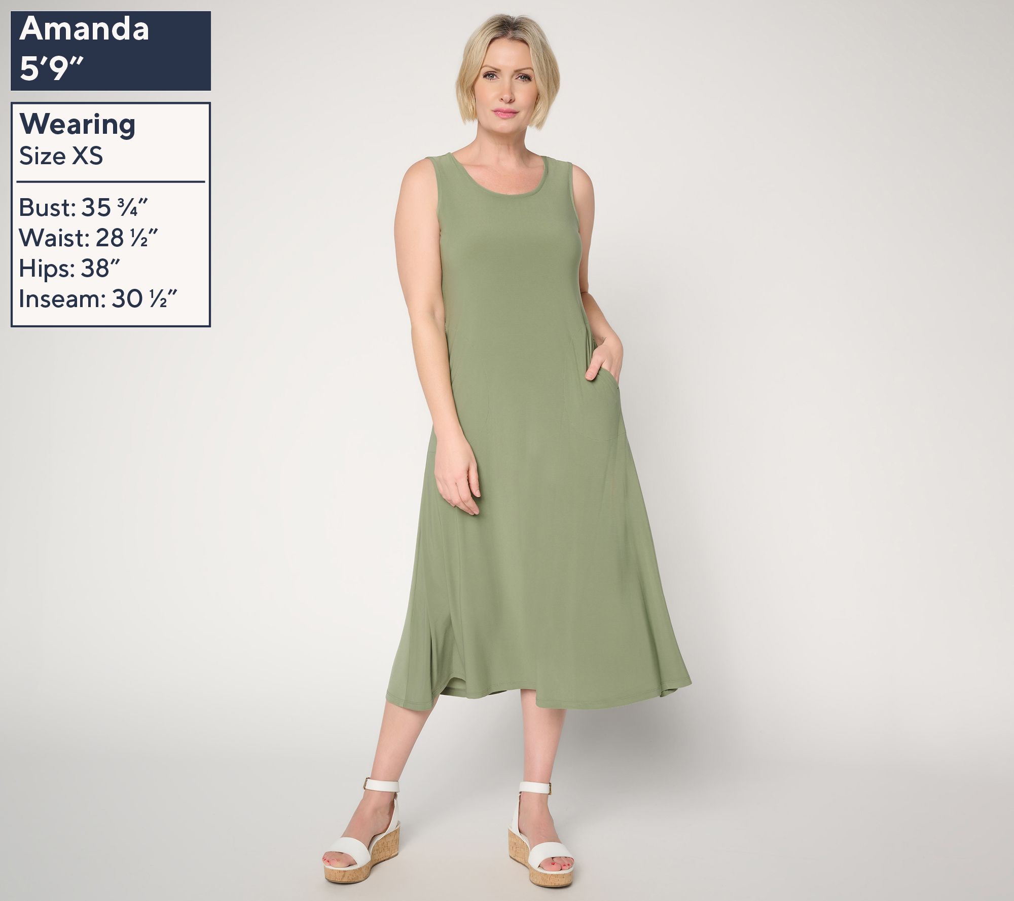 • Sleeveless Dress Features: solid color, scoop neckline, midi length, side-seam pockets