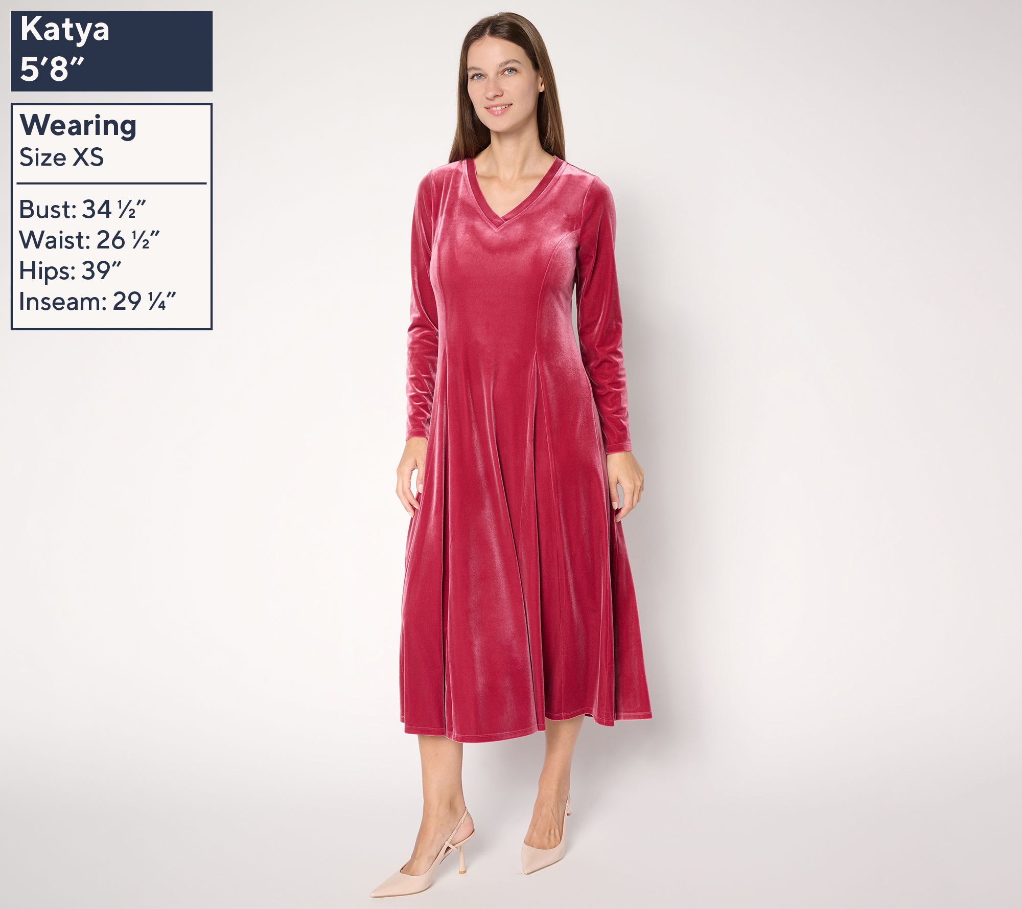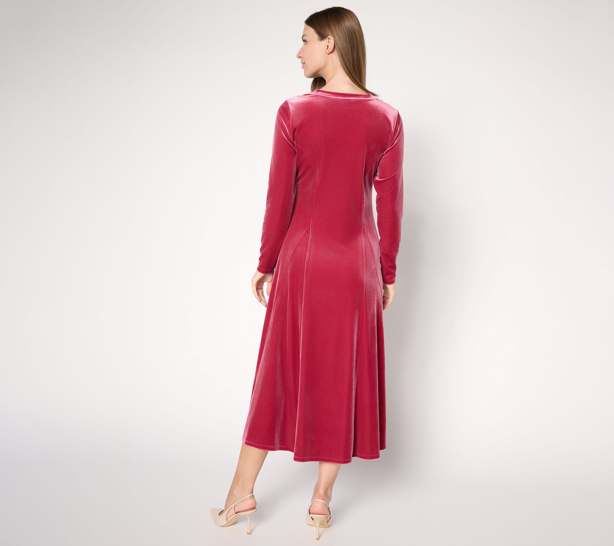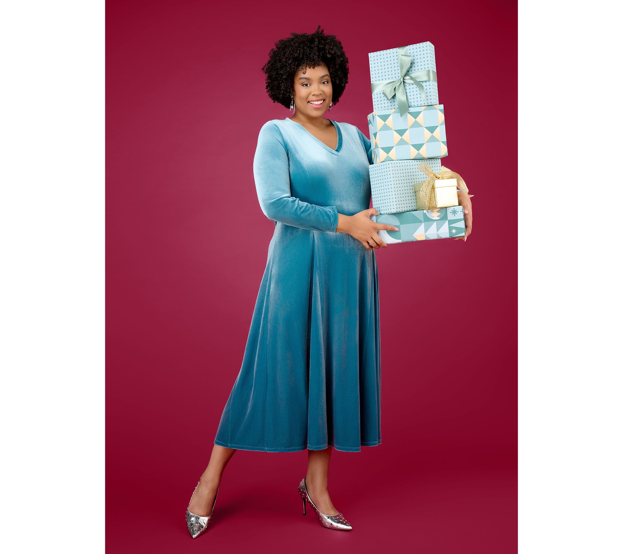 Whether the celebration's been planned for two years or 10 minutes via text, this gorgeous knit velvet dress from the Attitudes by Renee® Collection has you party-pretty in no time at all. Will there be a grand entrance with gifts in hand? A functional and flattering midi length and long sleeves let you sweep in with comfortable coverage -- perfect for bending to hug the littles or greet the pup. Will there be a dance floor moment? The fabric's beautiful sheen and godet skirt highlight every spin, slide, and sway. Will there be adjusting, twisting, or overly restrictive shapewear? No, no, and no -- the graceful fit lets you focus on the festivities. Cheers! From Women with Control®.