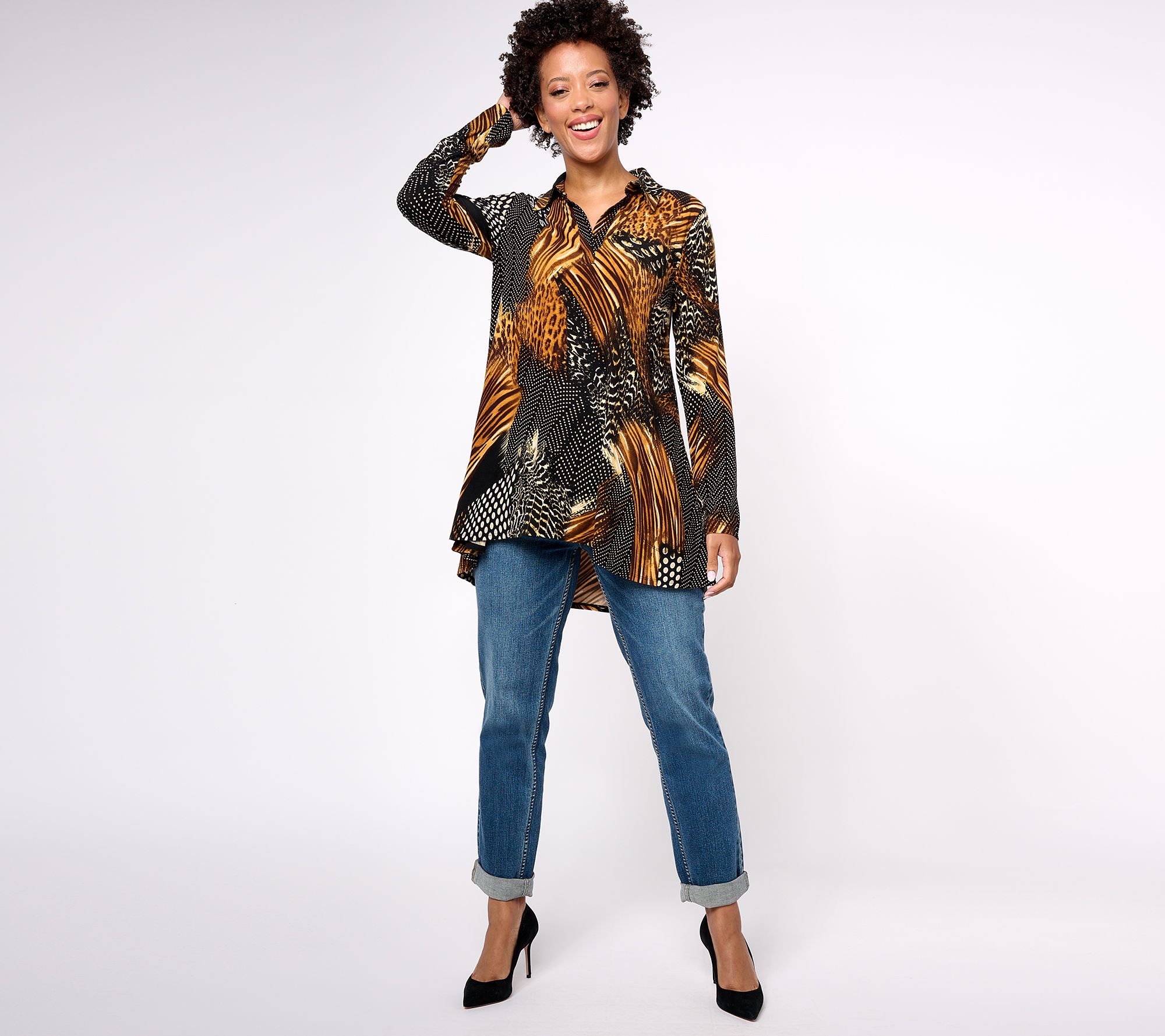 Breeze through your day in this floaty top, covered in an eye-catching mixed print that will surely keep heads turned in your direction. Team it with jeans and heels for date night or a fun outing with the girls. From Women with Control®.
