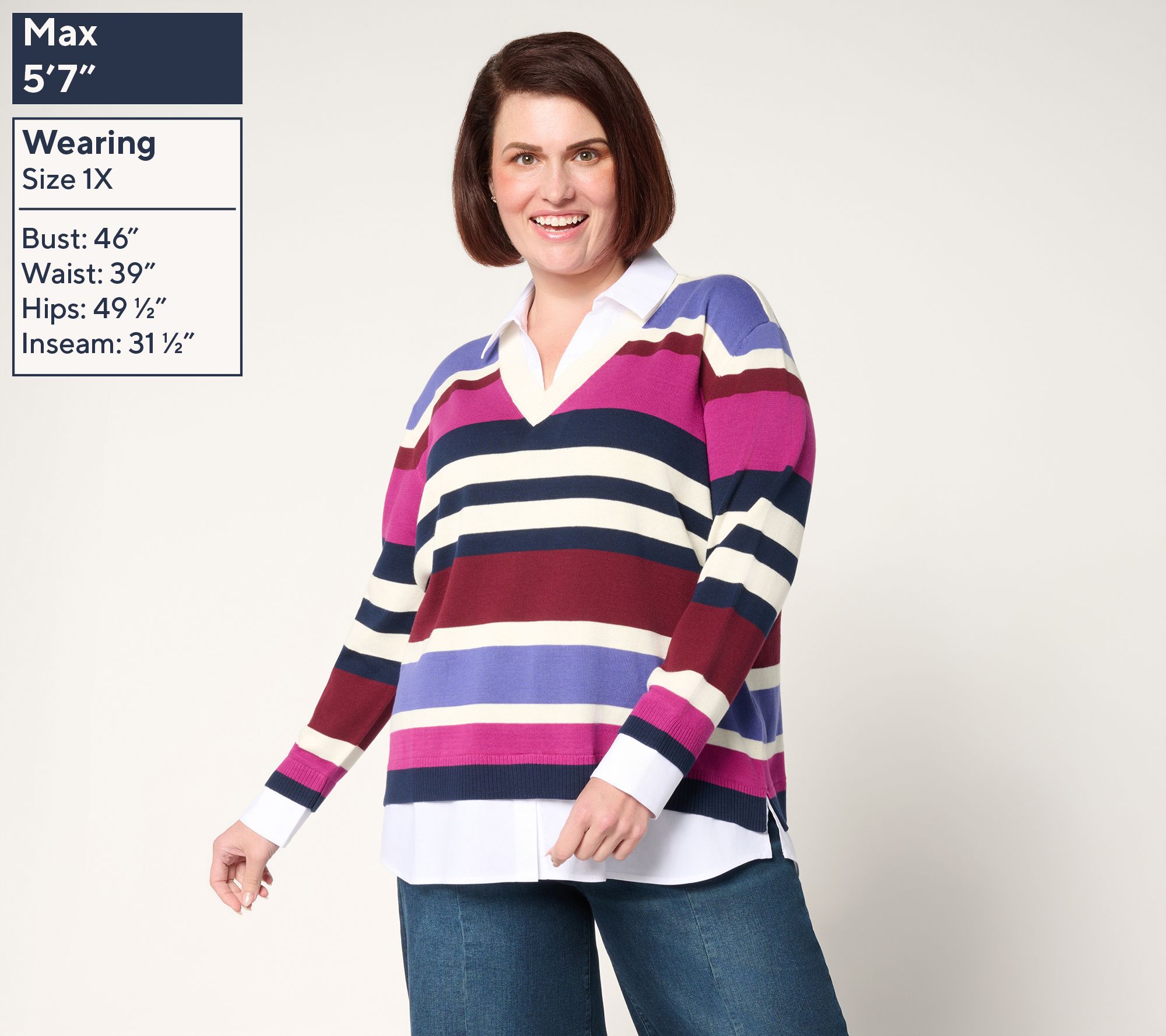 When a layered look calls your name, this striped sweater twofer steps in -- no extra styling required. With its crisp poplin collar, cuffs, and shirt-tail hem, it offers a smart-dressed effect in one easy piece. Pair it with tailored trousers for workdays or jeans for a spirited weekend vibe. From Women with Control®.