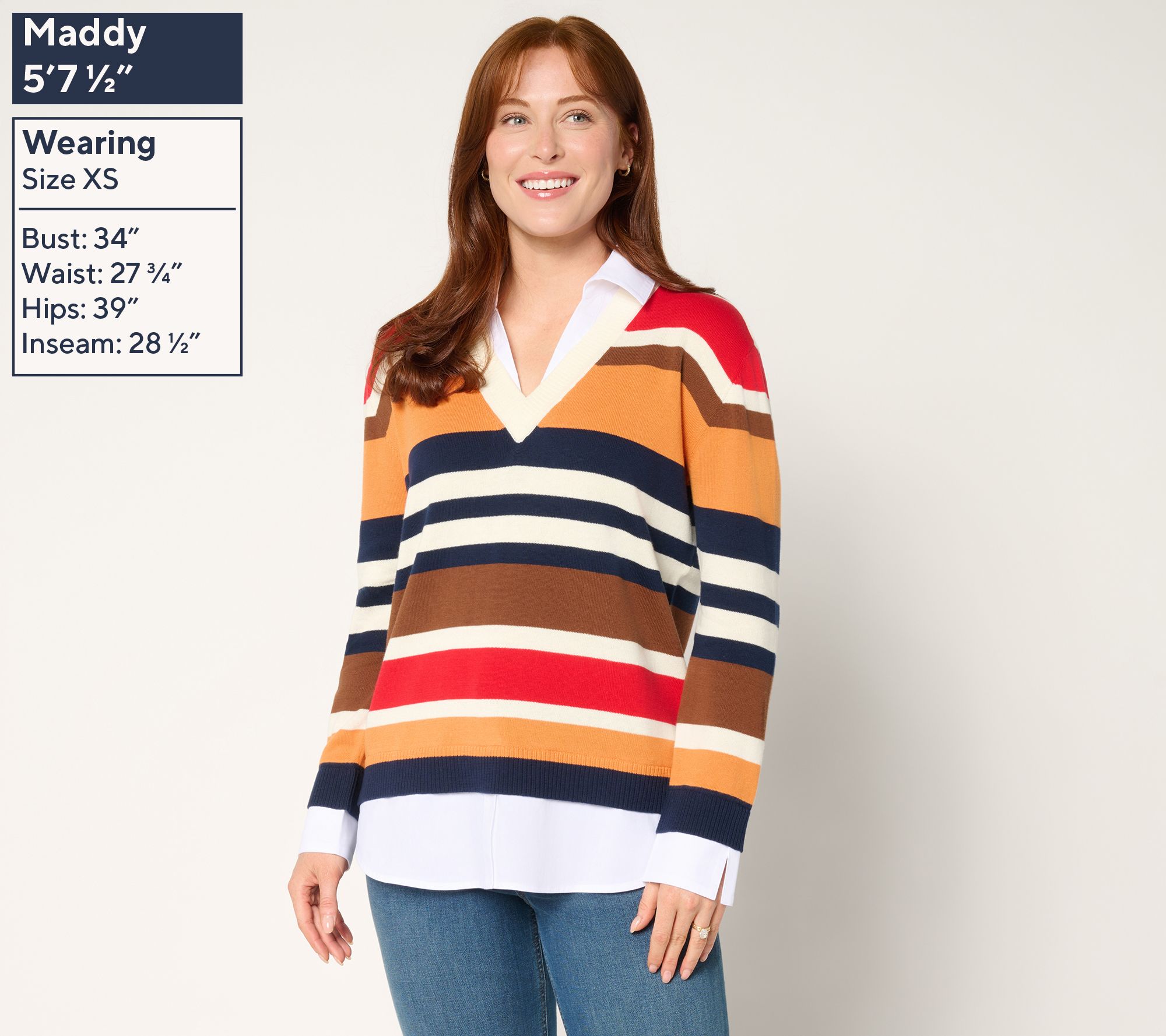 Features: striped sweater twofer, collared neck, long sleeves with cuffs, shirt-tail hem
