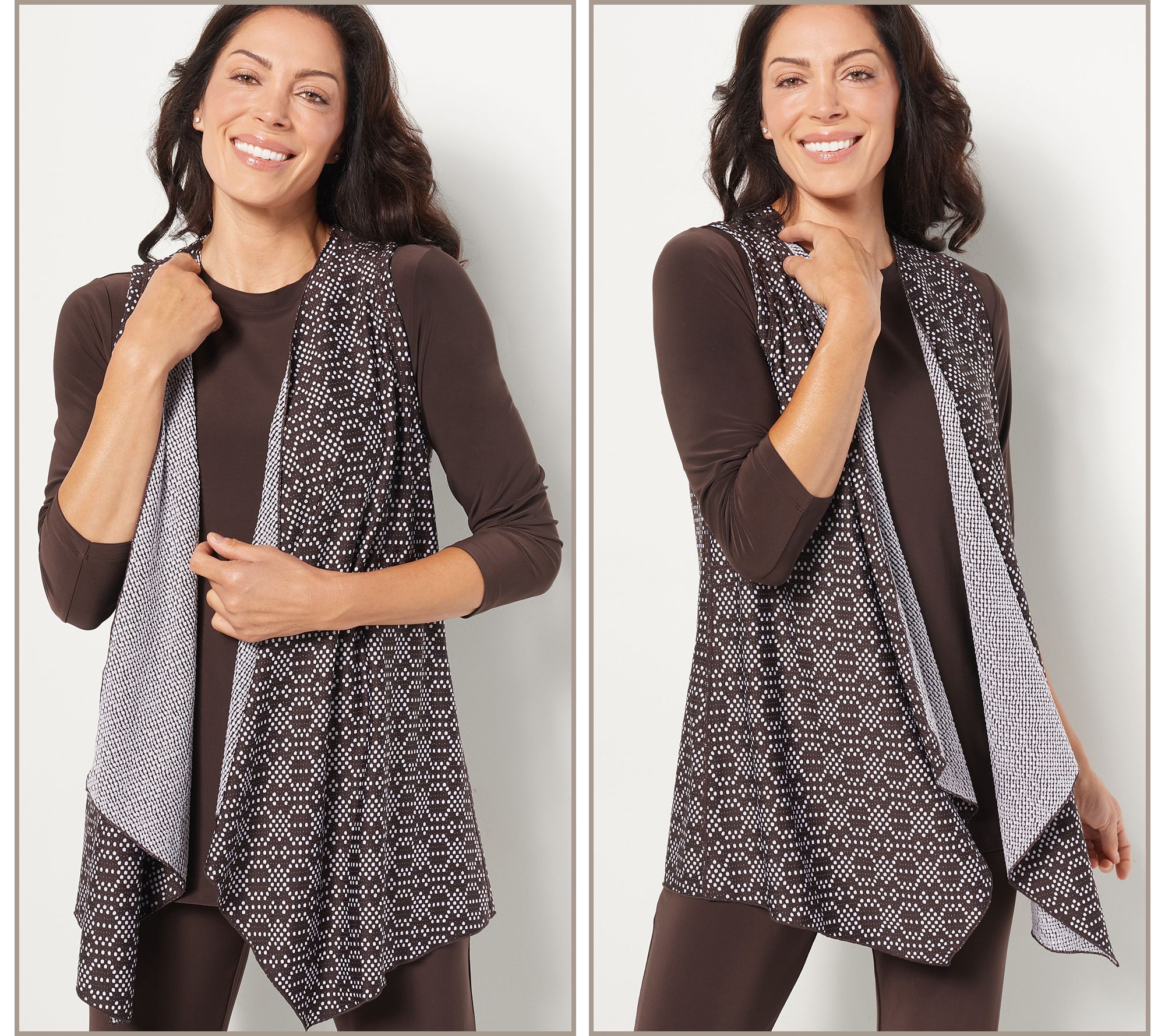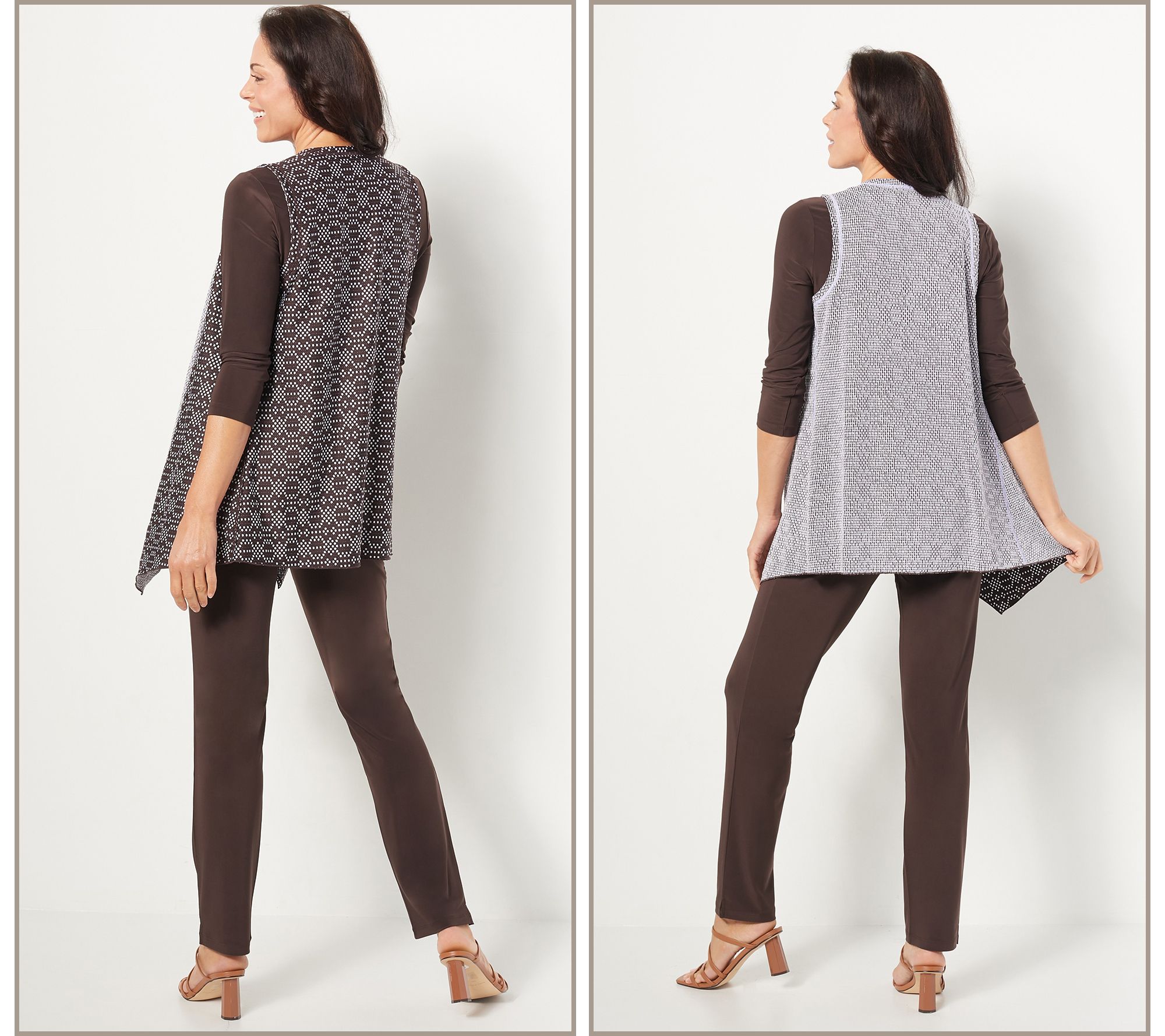 Say goodbye to painstaking try-ons in front of the mirror. Thanks to Renee, you're on time for the party, and wow-ing in this fabulous three-piece set. Wear the pieces together for a polished look or mix-and-match with other items in your closet. The best part? This reversible vest helps you reap double the style benefits. From Women with Control®.