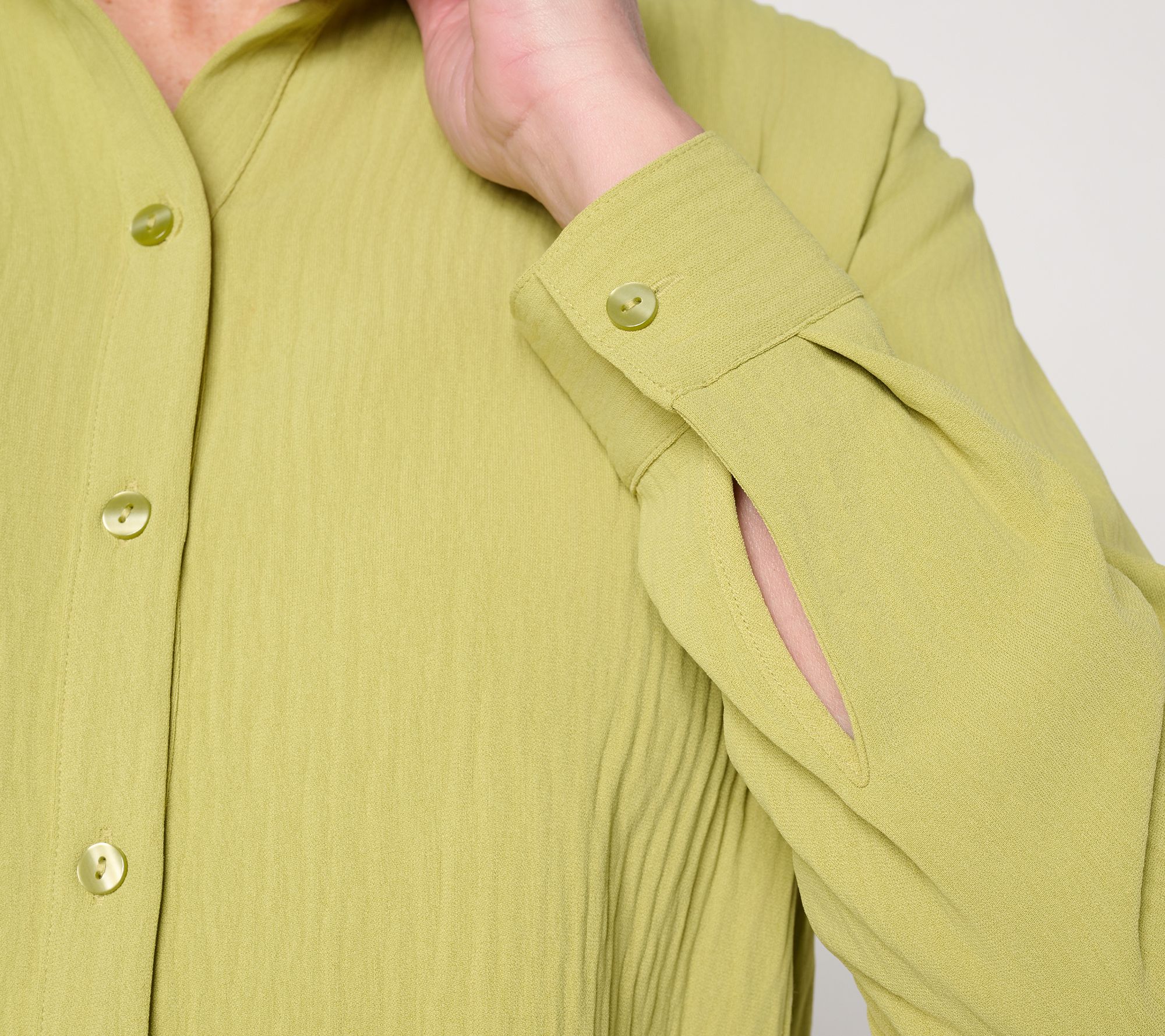 Features: two-ply self collar and collarband with snaps, self ruffle at hem