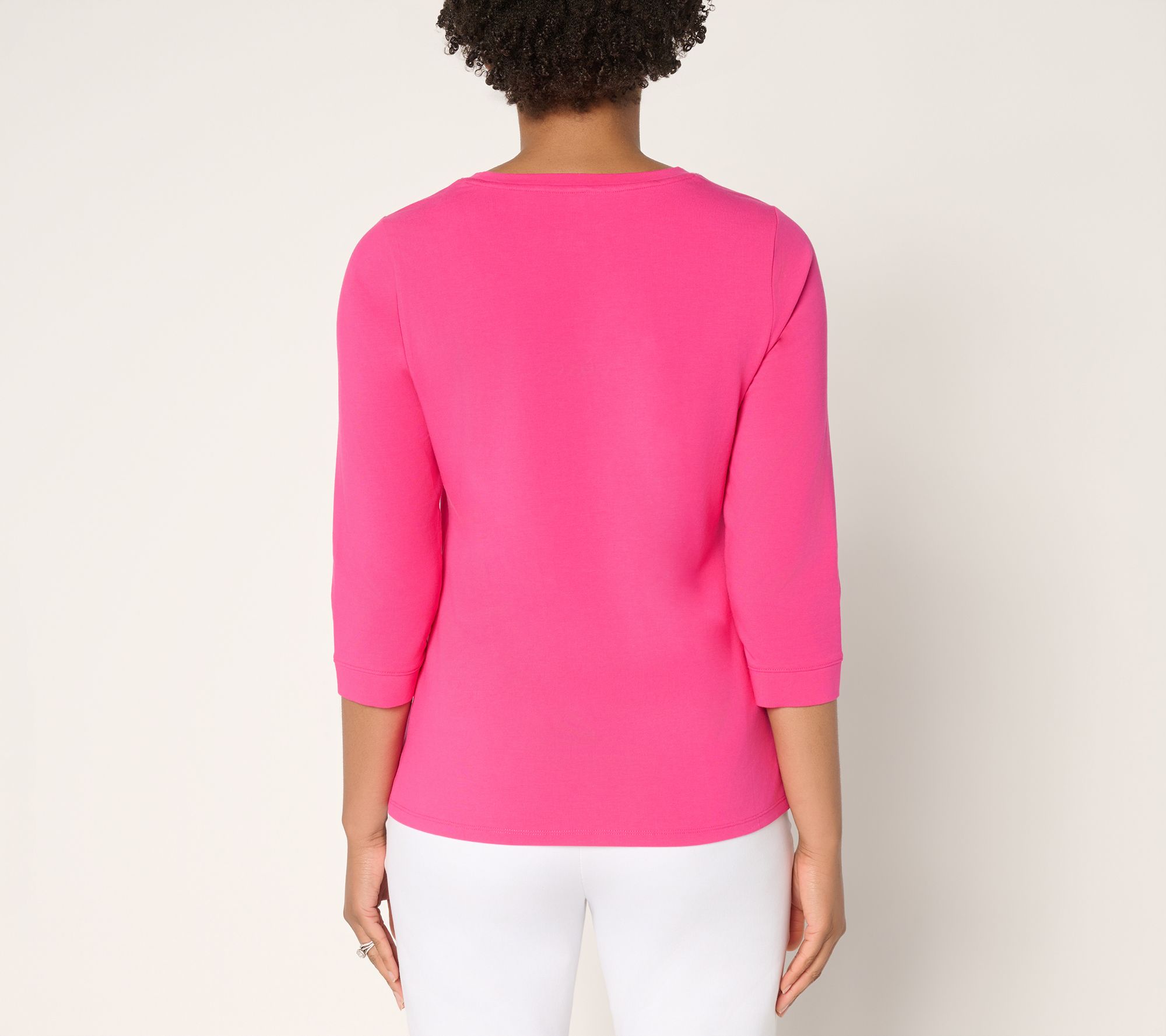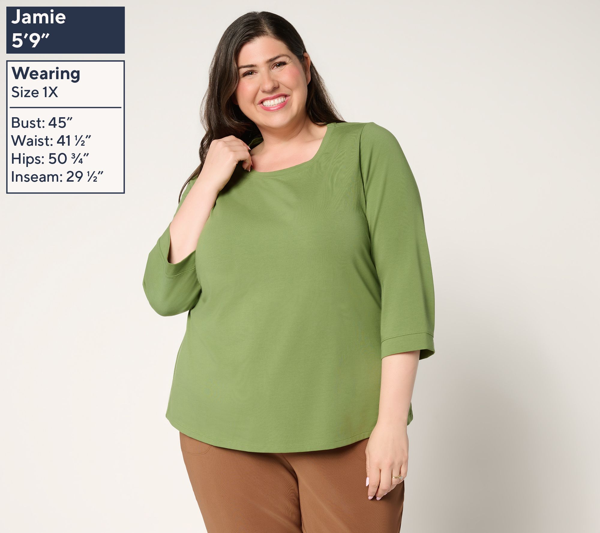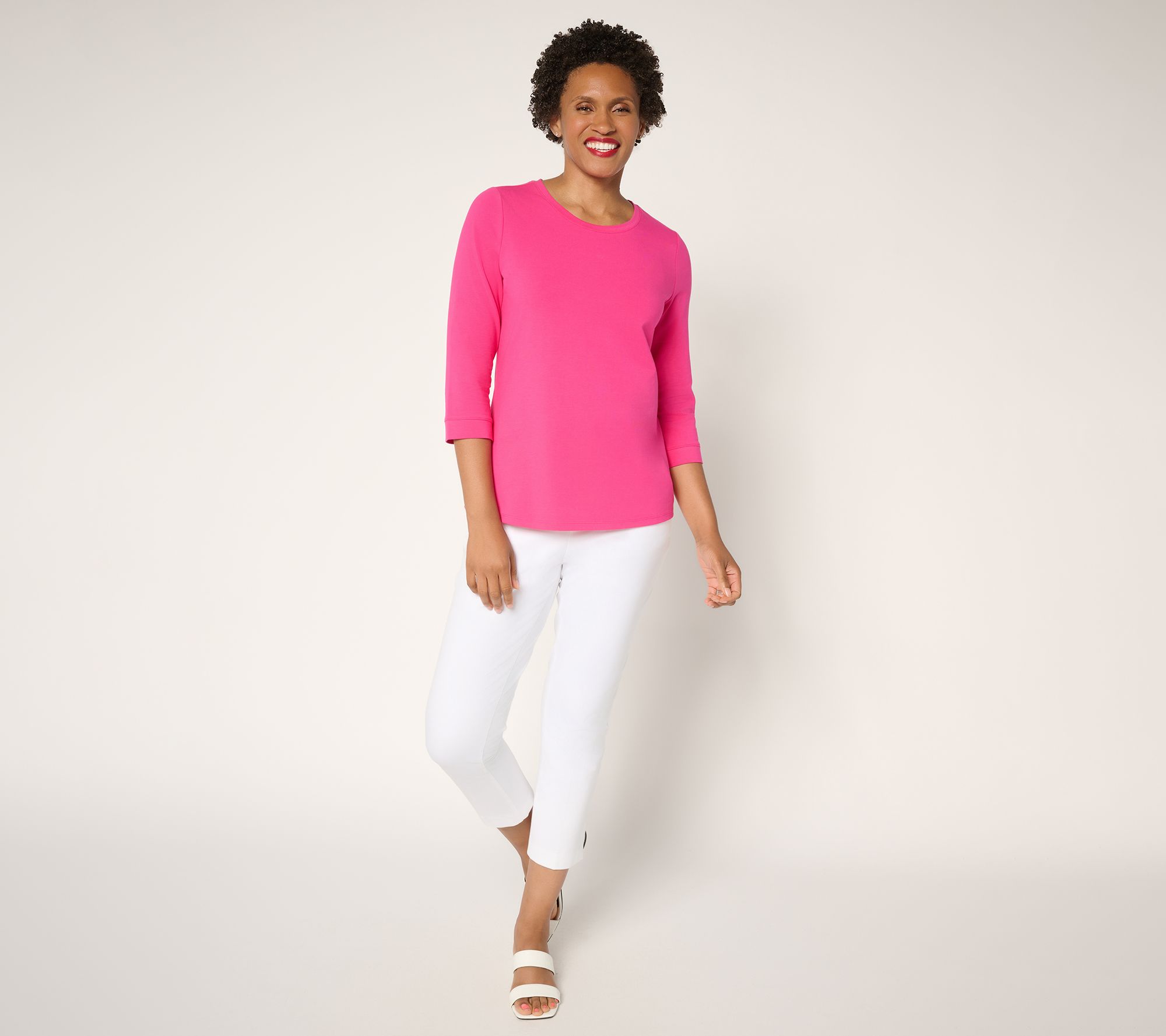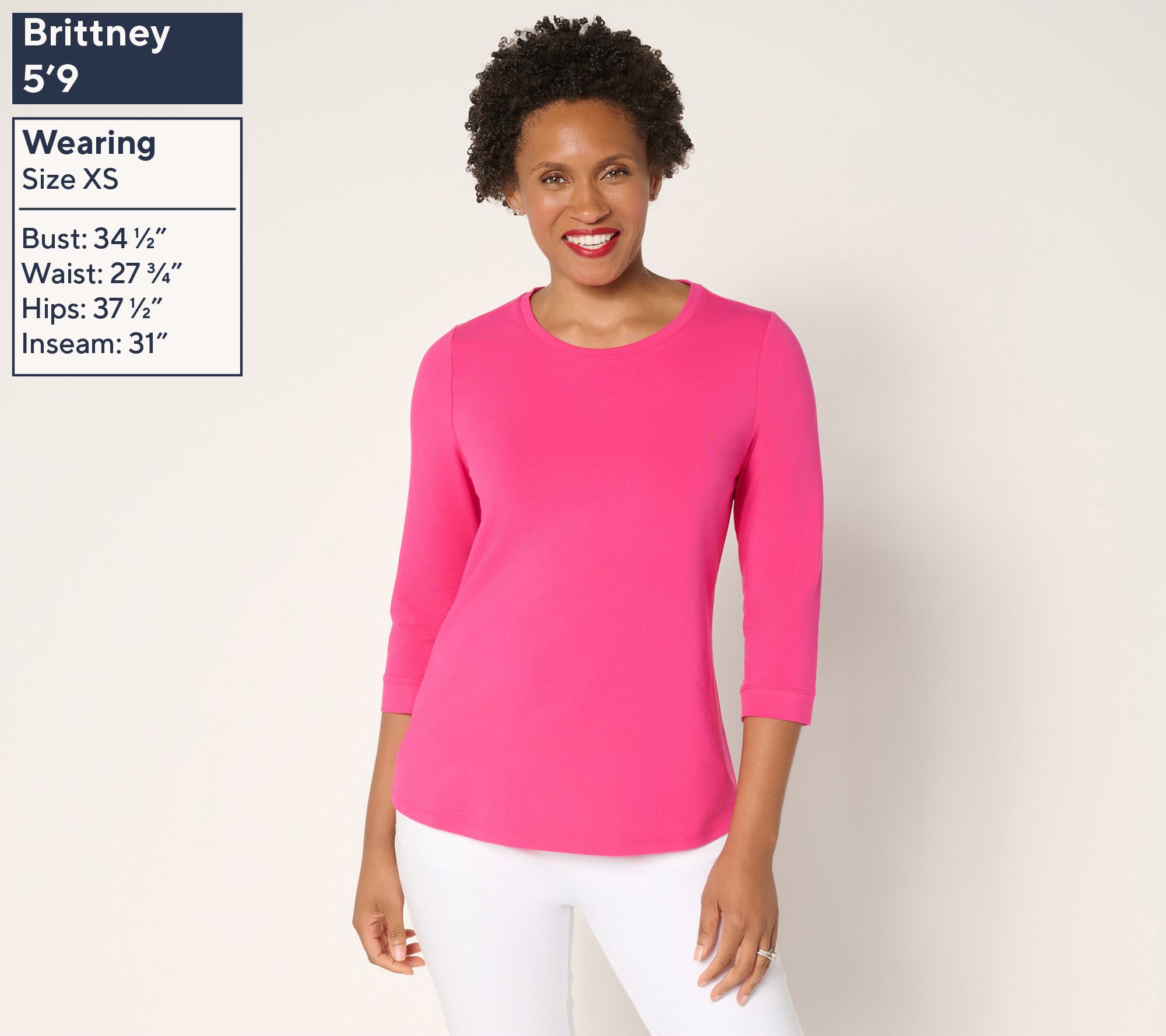 Perfect for morning errands or weekend coffee runs, this washed cotton top brings a laid-back feel with its soft stretch, rounded neckline, and easy 3/4-length sleeves. The semi-fitted silhouette follows your shape with comfortable ease, while the relaxed sleeves offer effortless movement as you go about your day. From Women with Control®.