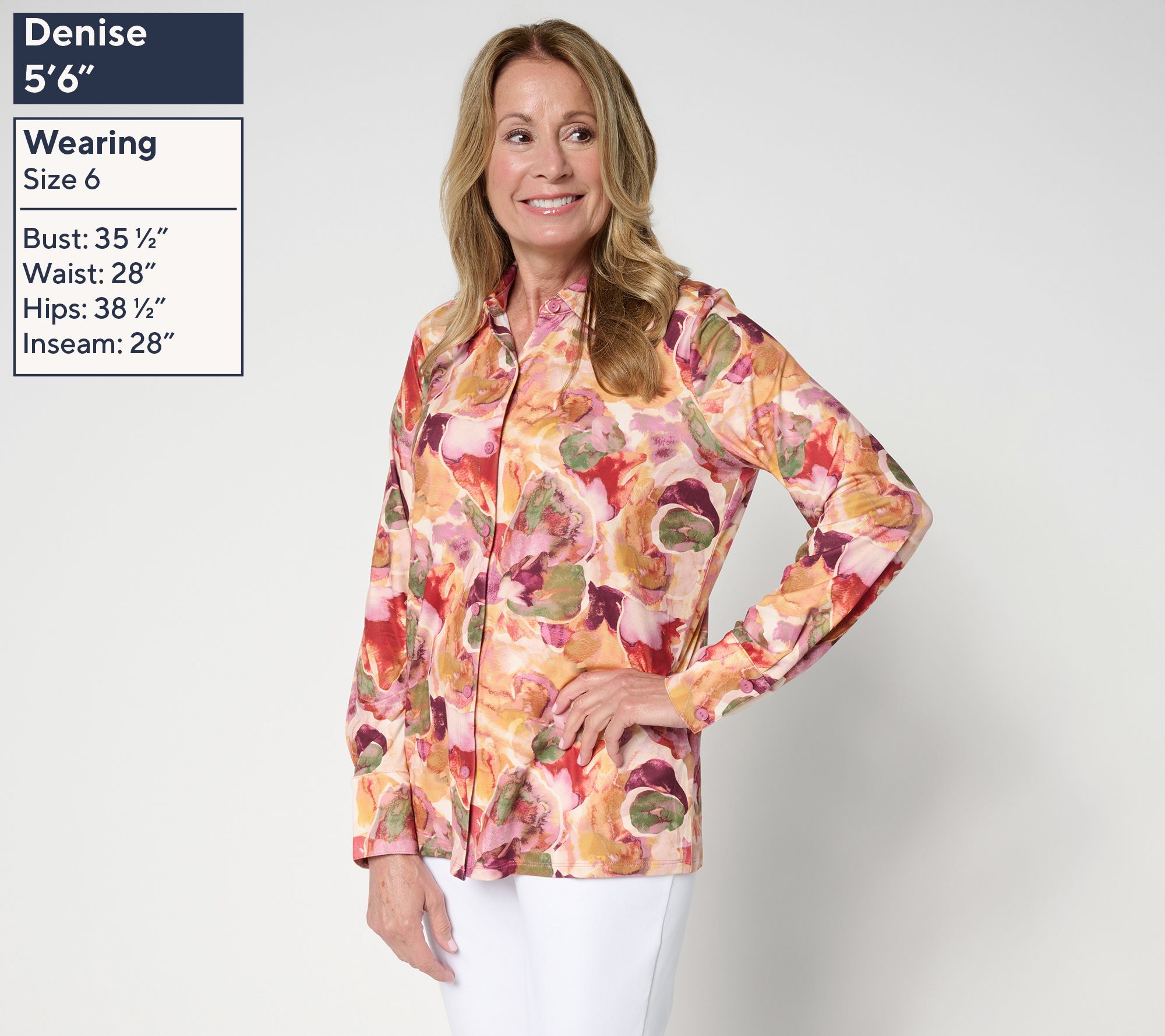 Looks like a blouse, feels like a knit! Crafted in Yummy Jersey, this button-down shirt delights on dress-up and dress-down days alike. Whether you're heading off to work or meeting friends for daily lattes, its subtle, smart details (like a polished collar and inverted back pleat) seamlessly balance comfort with a leveled-up look. Try it alone or as a light layer over your favorite tank. From Women with Control®.