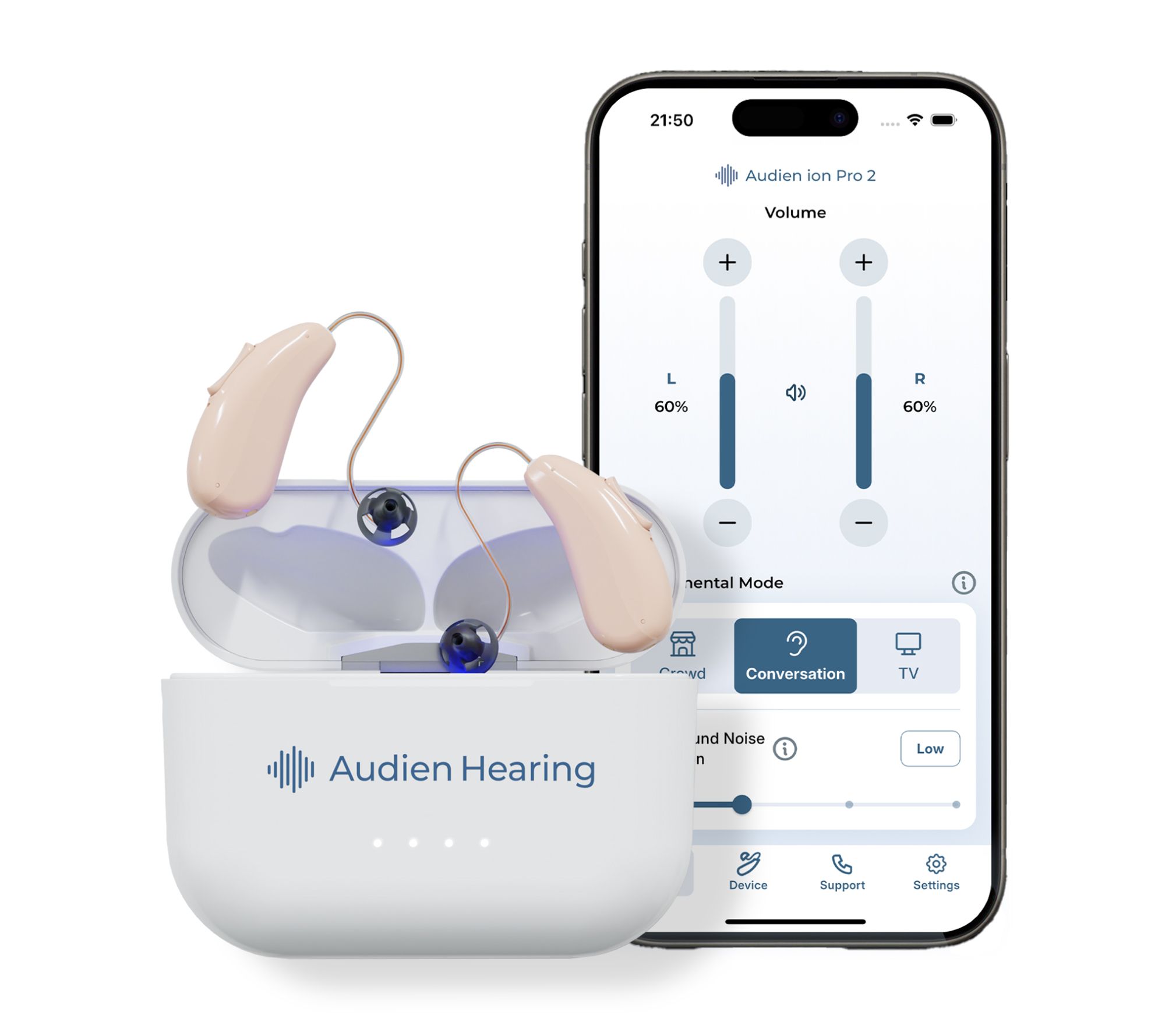 Take control of your hearing experience with the Audien ion Pro 2 hearing aids. Boasting a comfortable and discreet fit and an easy-to-use app, you can find the perfect hearing setting with six custom profiles so you can effortlessly stream phone calls, music, and video audio directly from your phone. From Audien.