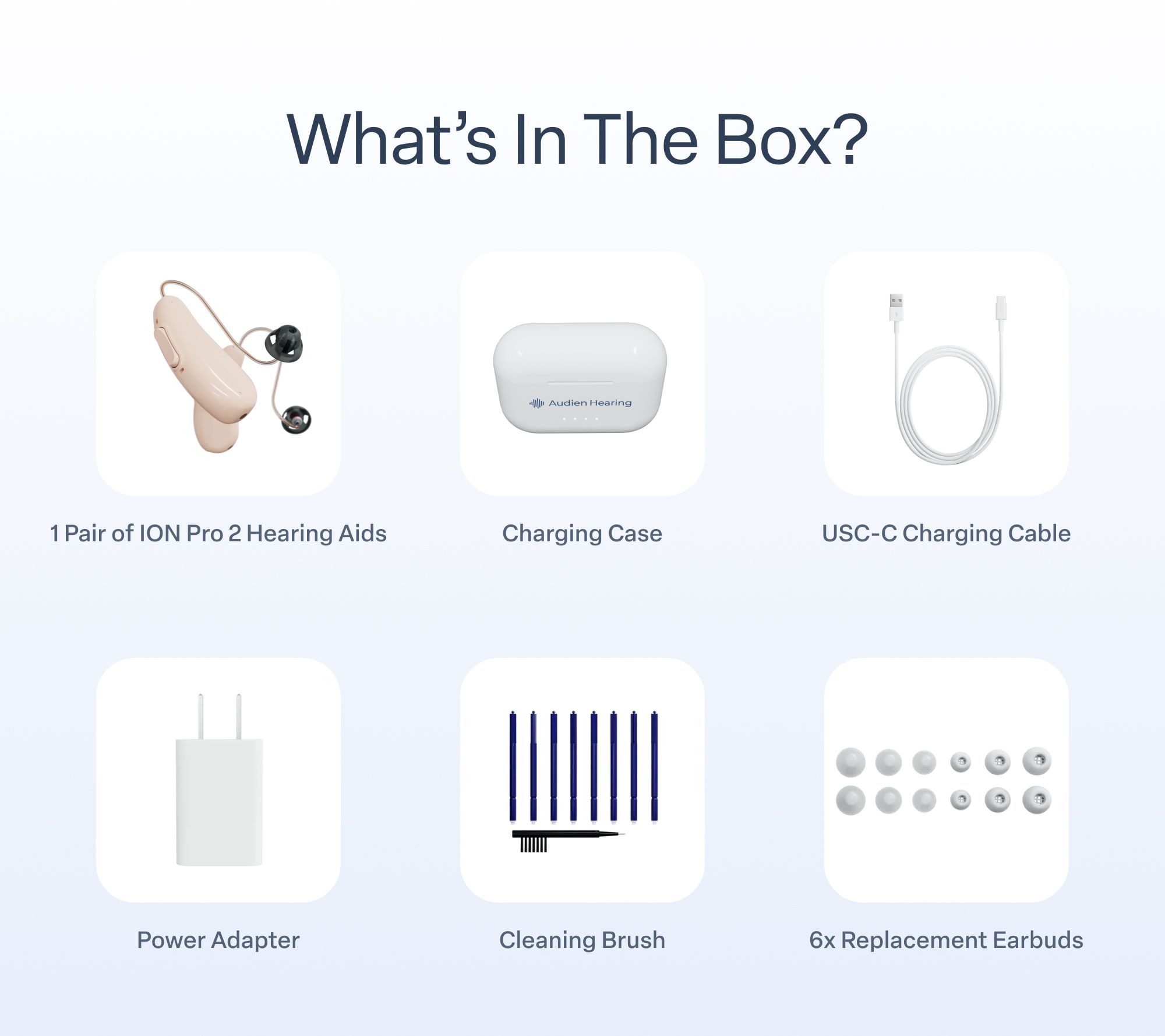 Includes two ion Pro 2 hearing aids (one pair), portable charging case, USB-C charging cable, power adapter, and maintenance kit; one-year protection plan; and hearing specialist appointment