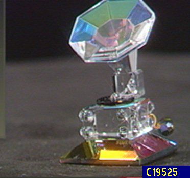 Made of 30% austrian crystal. Features a clear crystal multi- faced. speaker; crystal needle resting on black disc turntable. Metal side- crank accented with rainbow crystal handle. Set atop a rainbow crystal mirrored base which casts brilliant color. Meas. Approx. 7/8"L x 7/8"W x 1-1/2"H. (Made in USA)