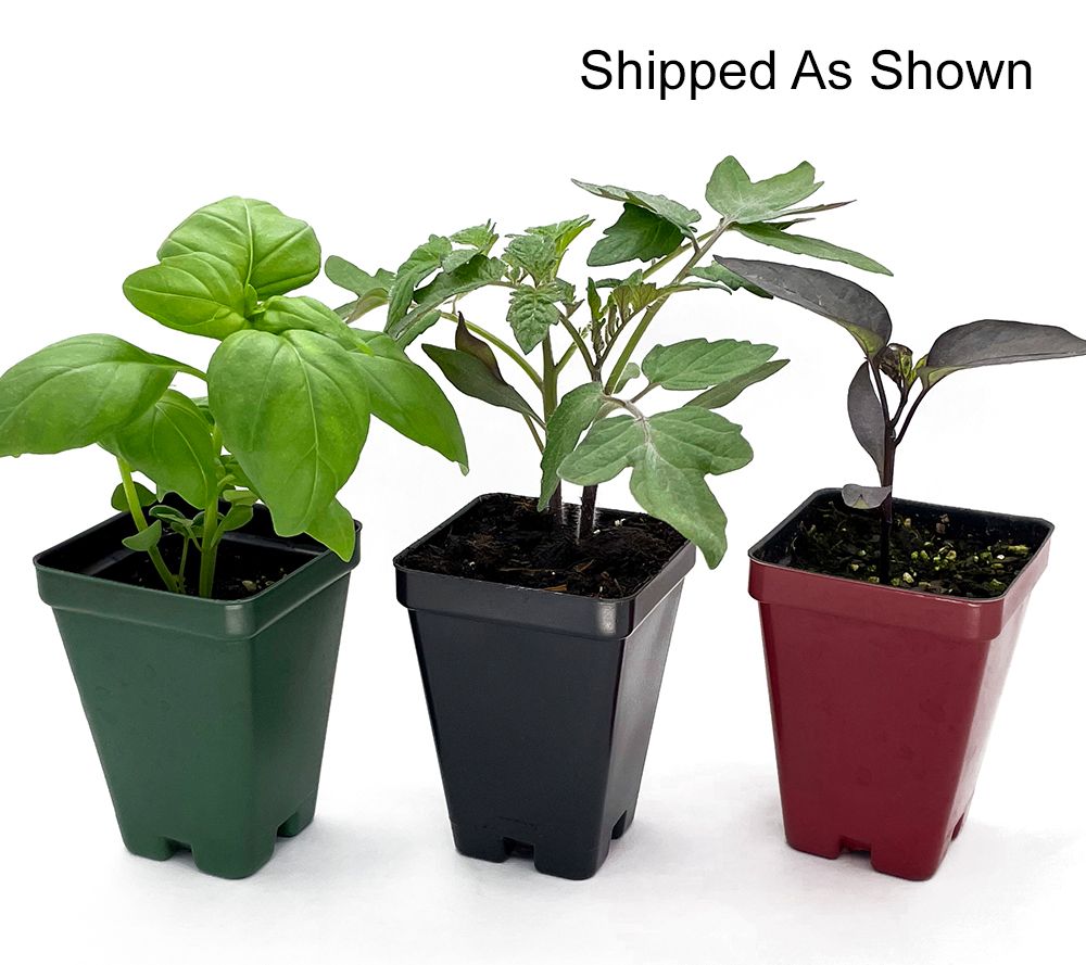 • Shipped as: three 2.5" pots; one each of Heartbreakers tomatoes, Count Dracula pepper, and Genovese basil