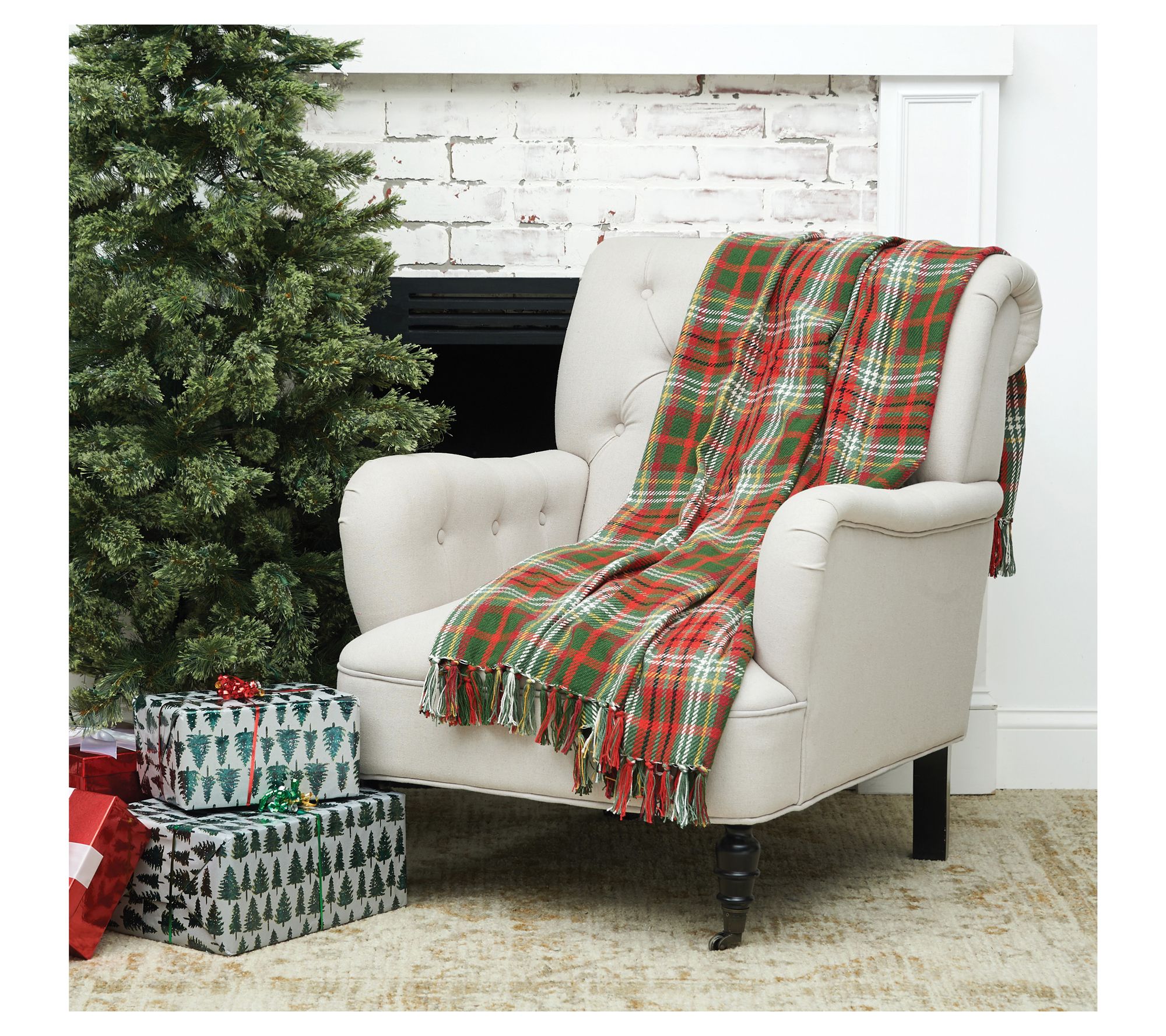 Inject a touch of warmth and charm into your living space with the Axel plaid throw, seamlessly blending holiday hues of green, red, white, and black. Perfect for draping over a sofa or armchair, it invites snuggles on chilly evenings. From the Valerie Parr Hill Collection.
