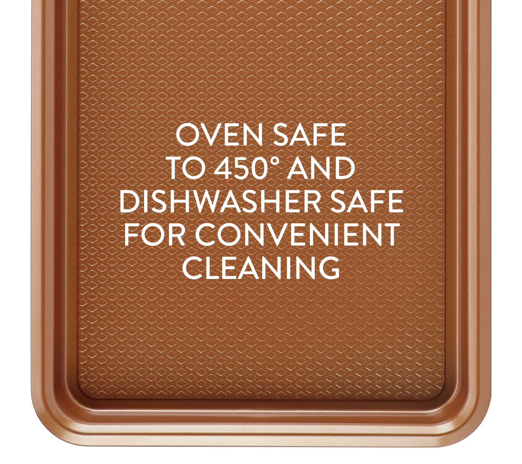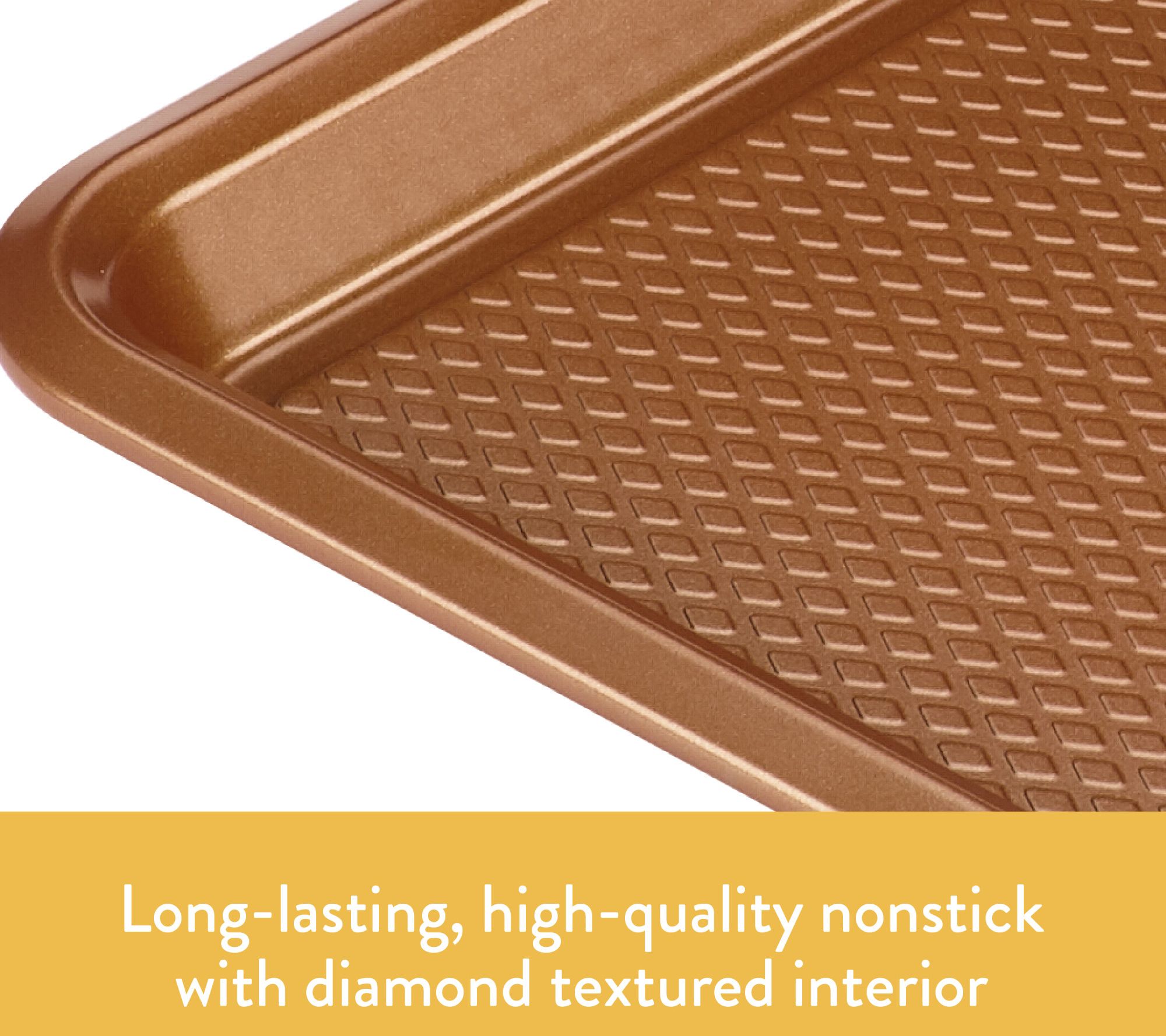 Bake up dozens of cookies and cool them down with ease using this heavy-duty cookie pan set complete with a cooling rack. The diamond-textured interior promotes even baking and browning. From Ayesha.