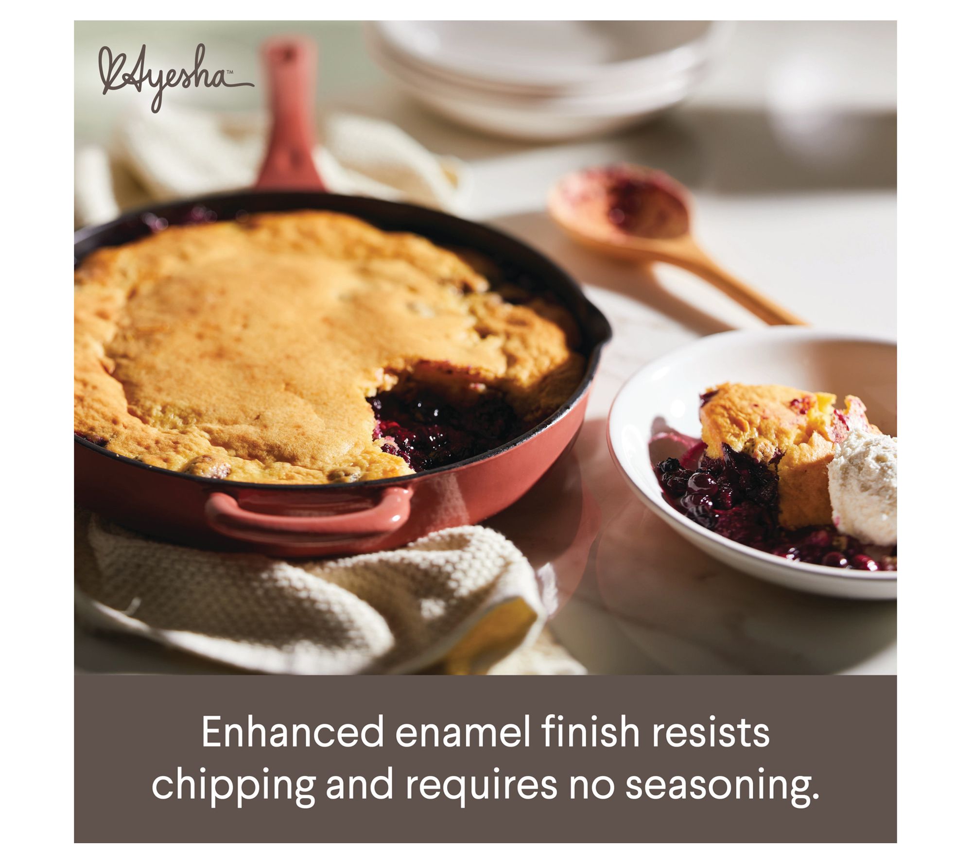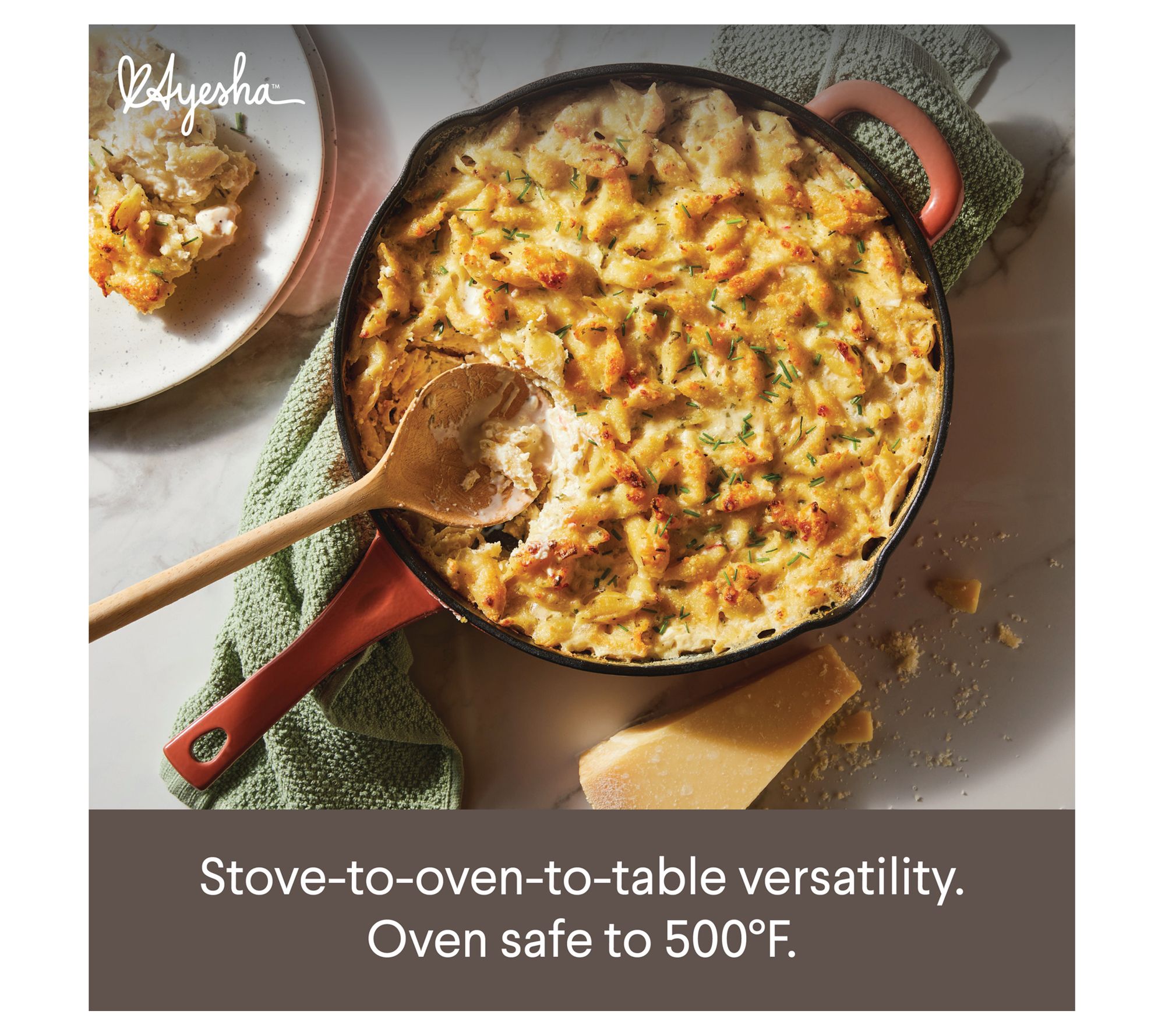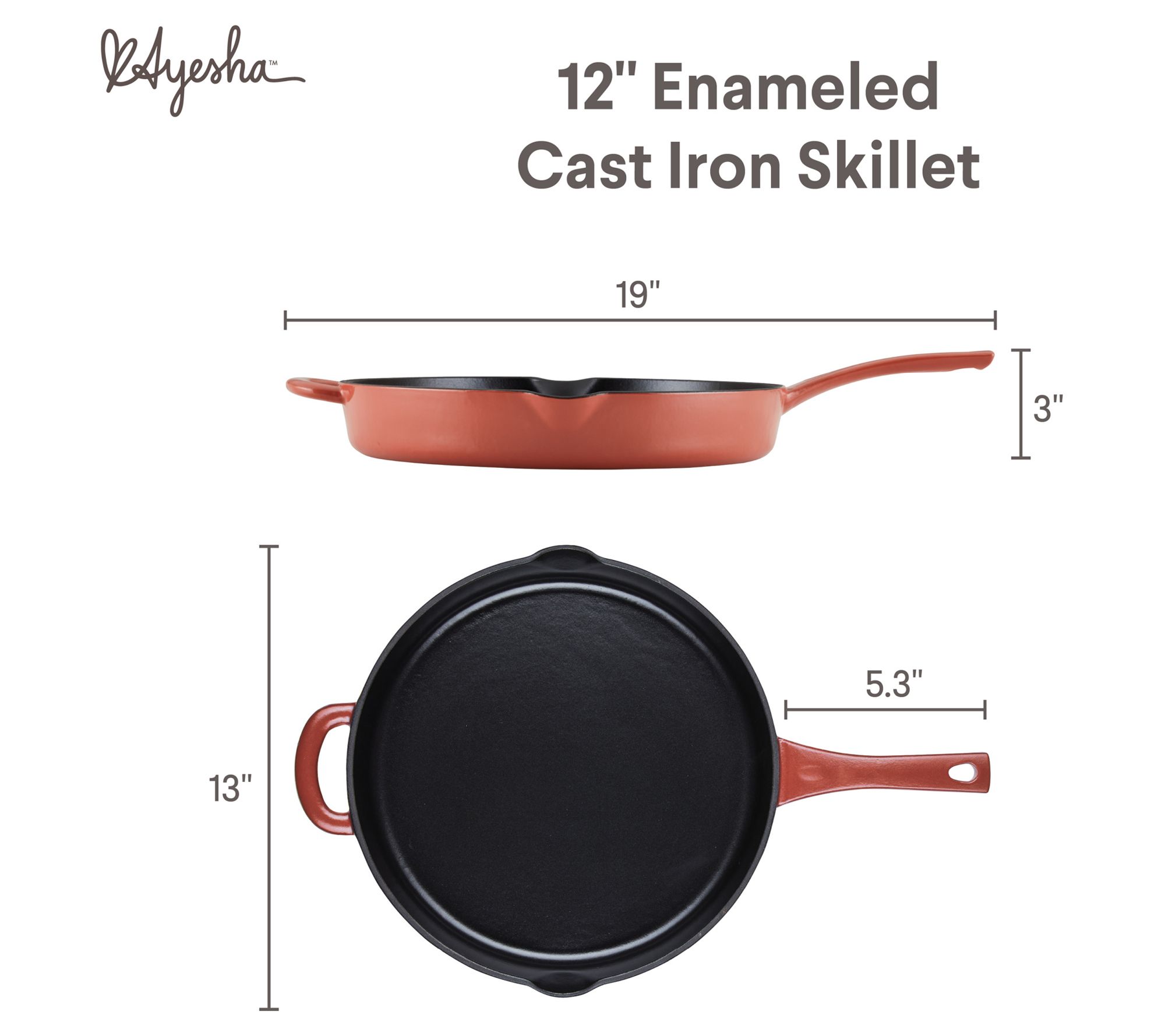 Bring stylish performance and durability to your kitchen with the Ayesha Curry cast iron 12" skillet. Crafted from heavy-duty cast iron, this skillet offers superior heat retention and cooking versatility. The enhanced enamel finish resists chipping and requires no seasoning, making it ready for searing, roasting, or baking right away. From Ayesha Curry.