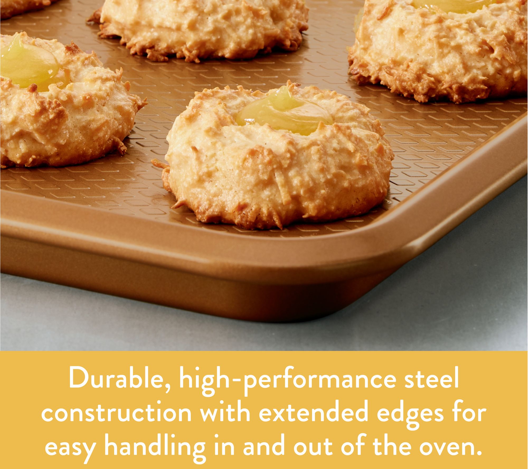 Prep your kitchen for delightful baking with the Ayesha Curry nonstick bakeware set. This five-piece set includes everything you need for out-of-the-box baking, featuring high-performance steel construction and warp-resistant designs. The diamond-textured surfaces ensure enhanced browning and easy food release, while extended edges provide a sturdy grip. From Ayesha Curry.