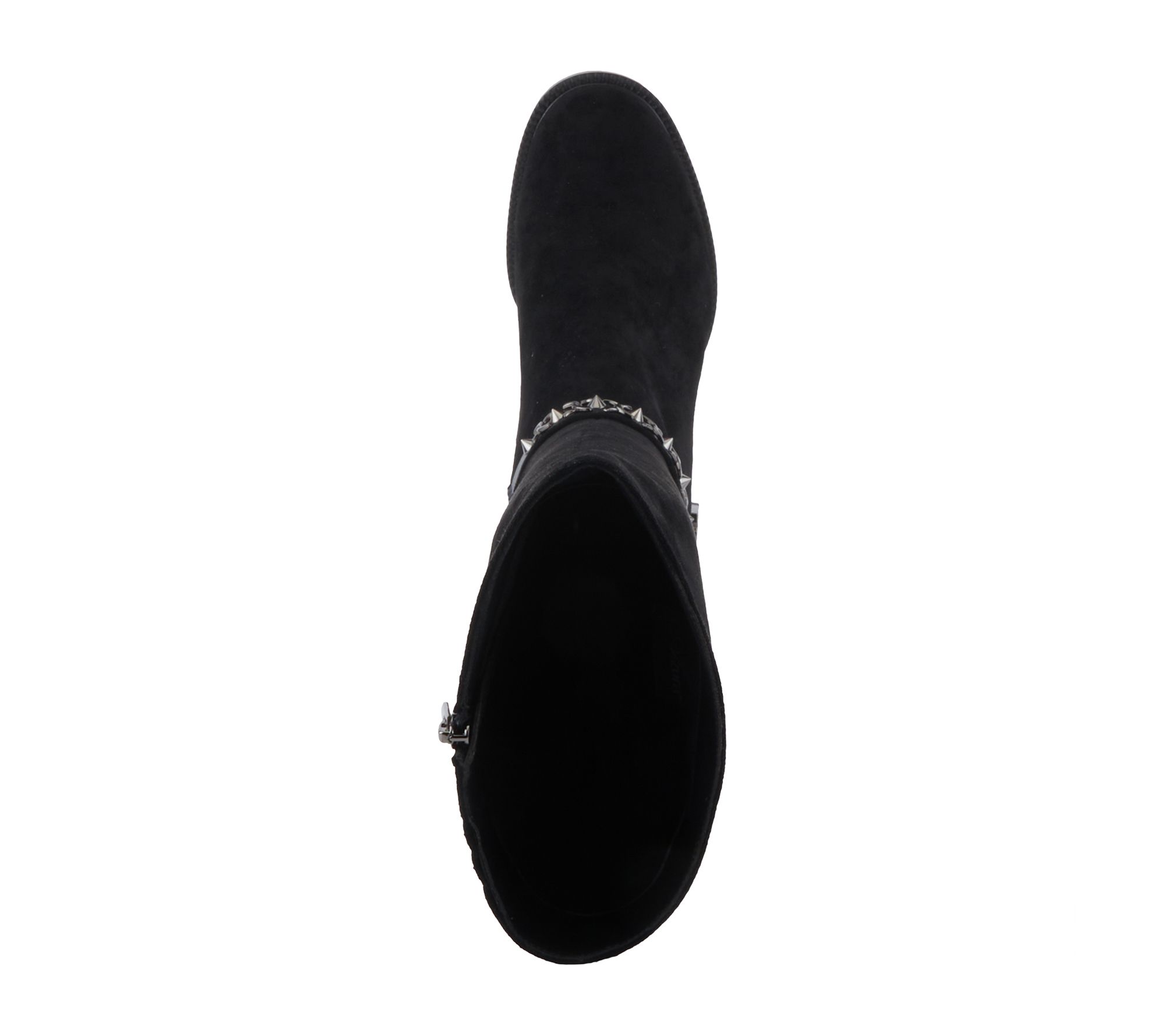 • Studded ankle belt, silvertone hardware, stretch microsuede upper, inside zipper, stretch gore